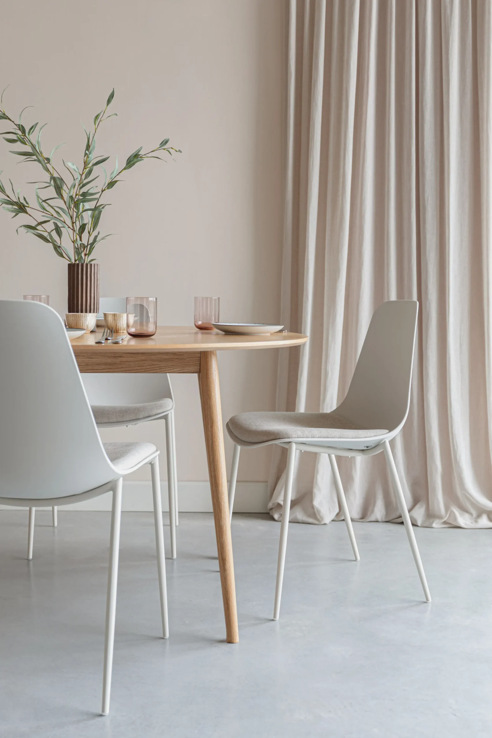 Die gemütlich geformte Kunststoffschale mit einer robusten Stoffsitzfläche bietet optimalen Sitzkomfort und unterstützt Ihre Körperhaltung ideal. Die stabilen Metallbeine verleihen dem Stuhl nicht nur eine robuste Standfestigkeit, sondern auch einen modernen Look. Ob in der Küche, im Esszimmer oder im Büro – dieser Schalenstuhl macht in jedem Raum eine gute Figur. Die dezenten Farbtöne sorgen für eine beruhigende Atmosphäre und lassen sich leicht mit anderen Möbelstücken kombinieren.