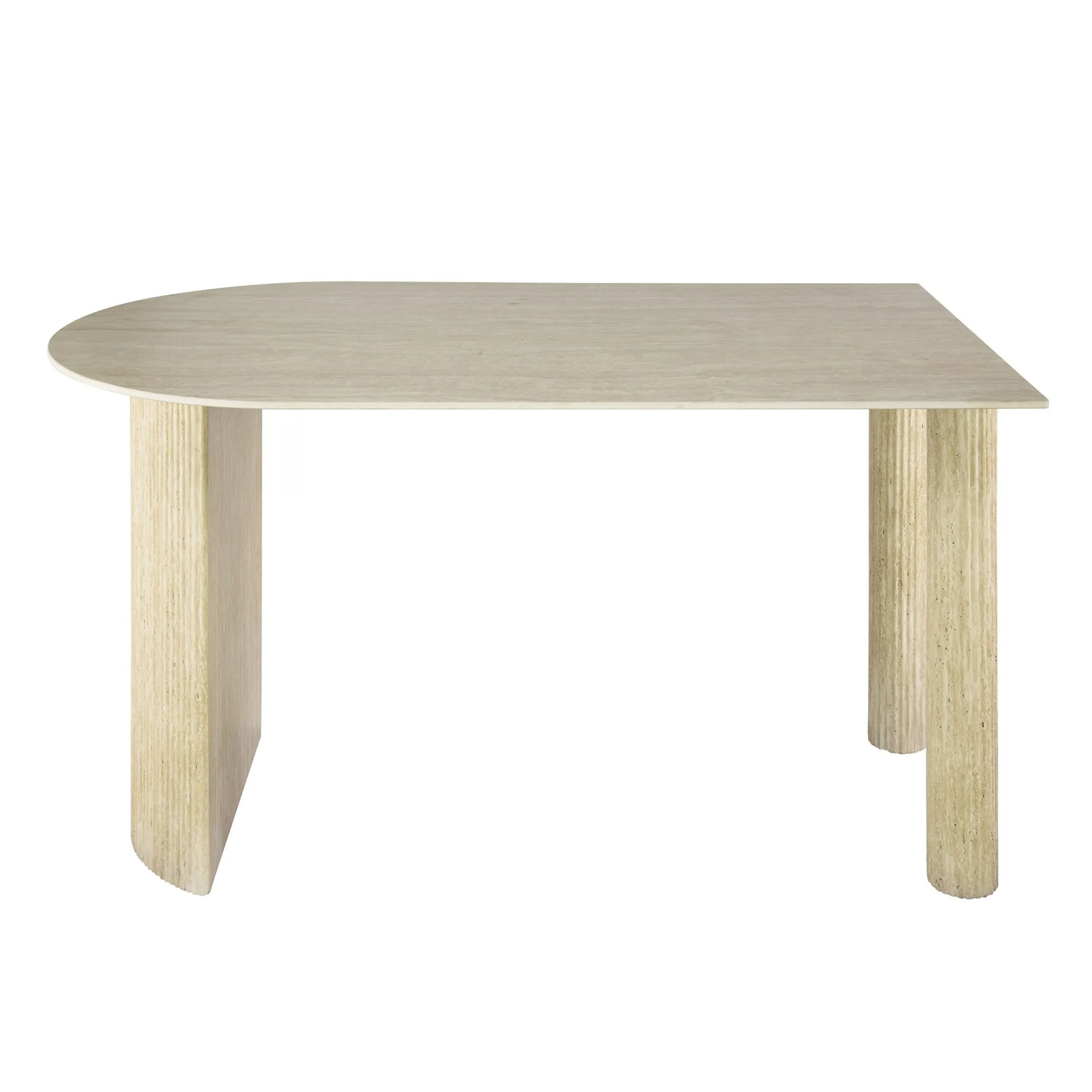 Die feine Oberfläche des Esstisches besticht durch ihre seidige Haptik und ist zugleich pflegeleicht, kratzfest und hitzebeständig – geschaffen für den Alltag, aber gemacht für besondere Momente. Dank seiner geraden Seiten kann dieser Tisch an die Wand gestellt werden, wodurch der Platz optimal genutzt wird. Die Platte ruht auf einem markanten Rahmen, der aus einer Halbmondform und zwei zylindrischen Beinen mit Wellendesign besteht.
