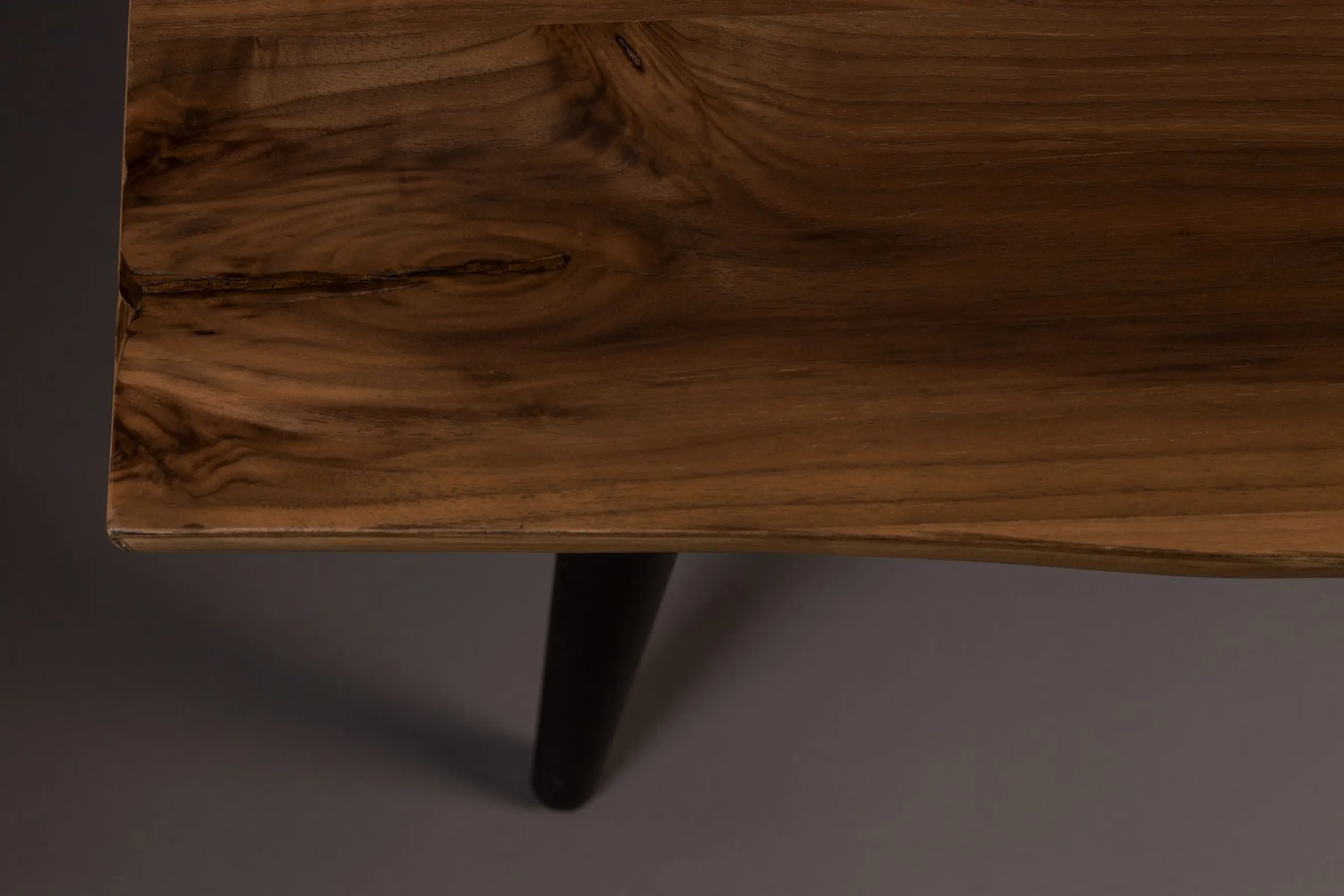 Die Alagon Serie gibt es von groß bis eher klein, egal ob Tísch oder Bank. So passt sich Alagon Ihren Bedürfnissen an. Die Stücke haben den Charme und die unregelmäßigen Kanten eines Walnußbaumstammes. Das Holz ist nicht nur ein Highlight für das Auge, sondern beweist auch, wieviel Liebe und Aufwand wir ins Detail stecken. Ein weiteres Beispiel sind die konischen Beine aus schwarzem Metall.