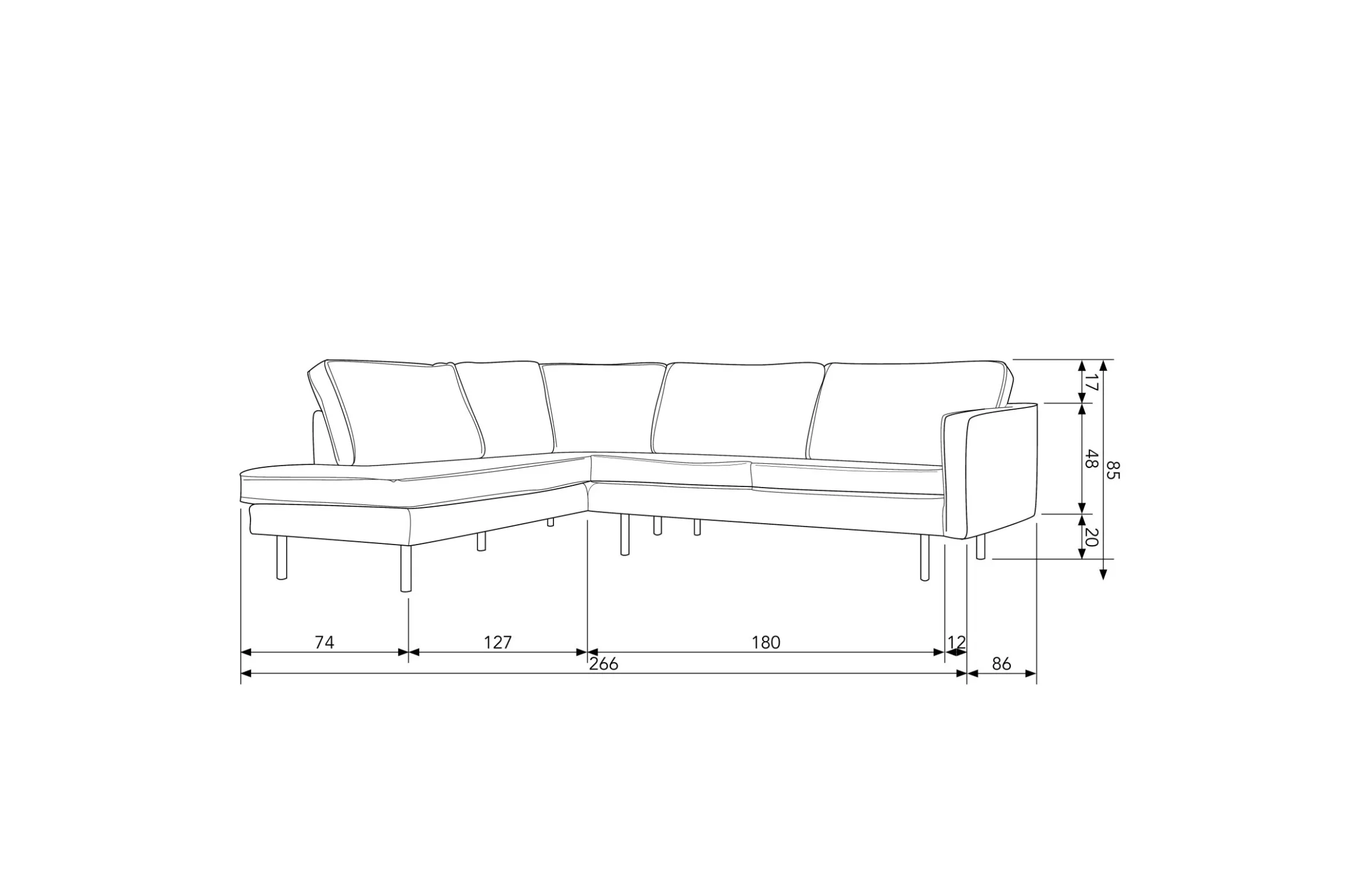 - Außreichend Platz: 85 x 266 x 86/213 cm (H/B/T)