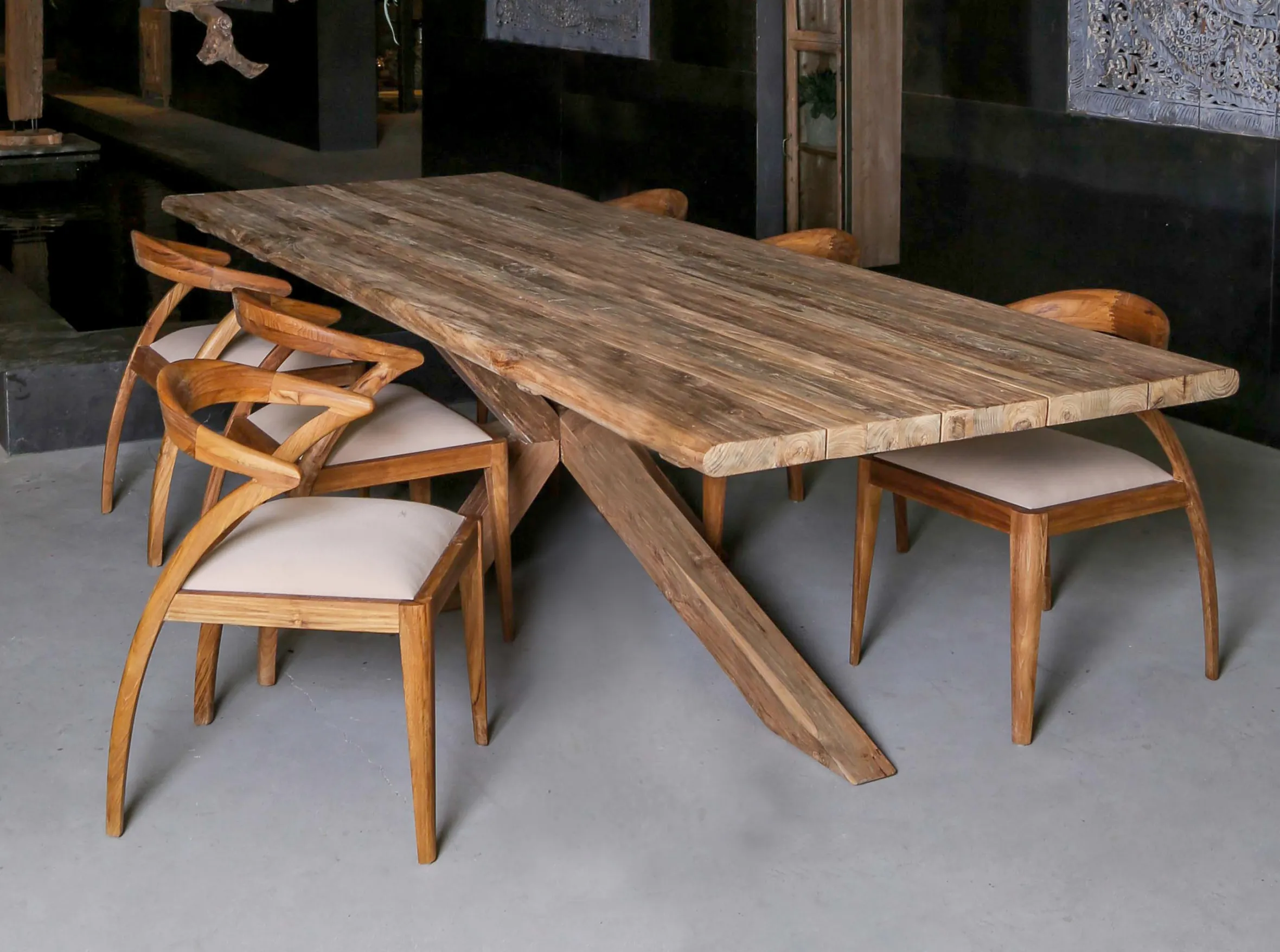 Das Design, die ausgeprägte natürliche Maserung und die abgerundeten Ecken – so vielfältig setzt der Esstisch Bali Akzente! Kombiniert mit den verästelten Massivholzbeinen ergibt das Ganze einen Esstisch in aufwändiger Möbelbaukunst. Die einzeln eingesetzten recycelten Teakholzstreben erzeugen eine urige Platte, somit ist jeder Tisch ein Einzelstück. Der Tisch wirkt sowohl Drinnen wie Draußen, aufgrund des robusten Teakholzes kann er im Freien verwendet werden. Das Holz kann dadurch mit der Zeit ein verwittertes Aussehen bekommen. Mit Teaköl ist hier schnell Abhilfe geschafft. Regelmäßiges Ölen ist die einzige Pflege die dieser Tisch benötigt.