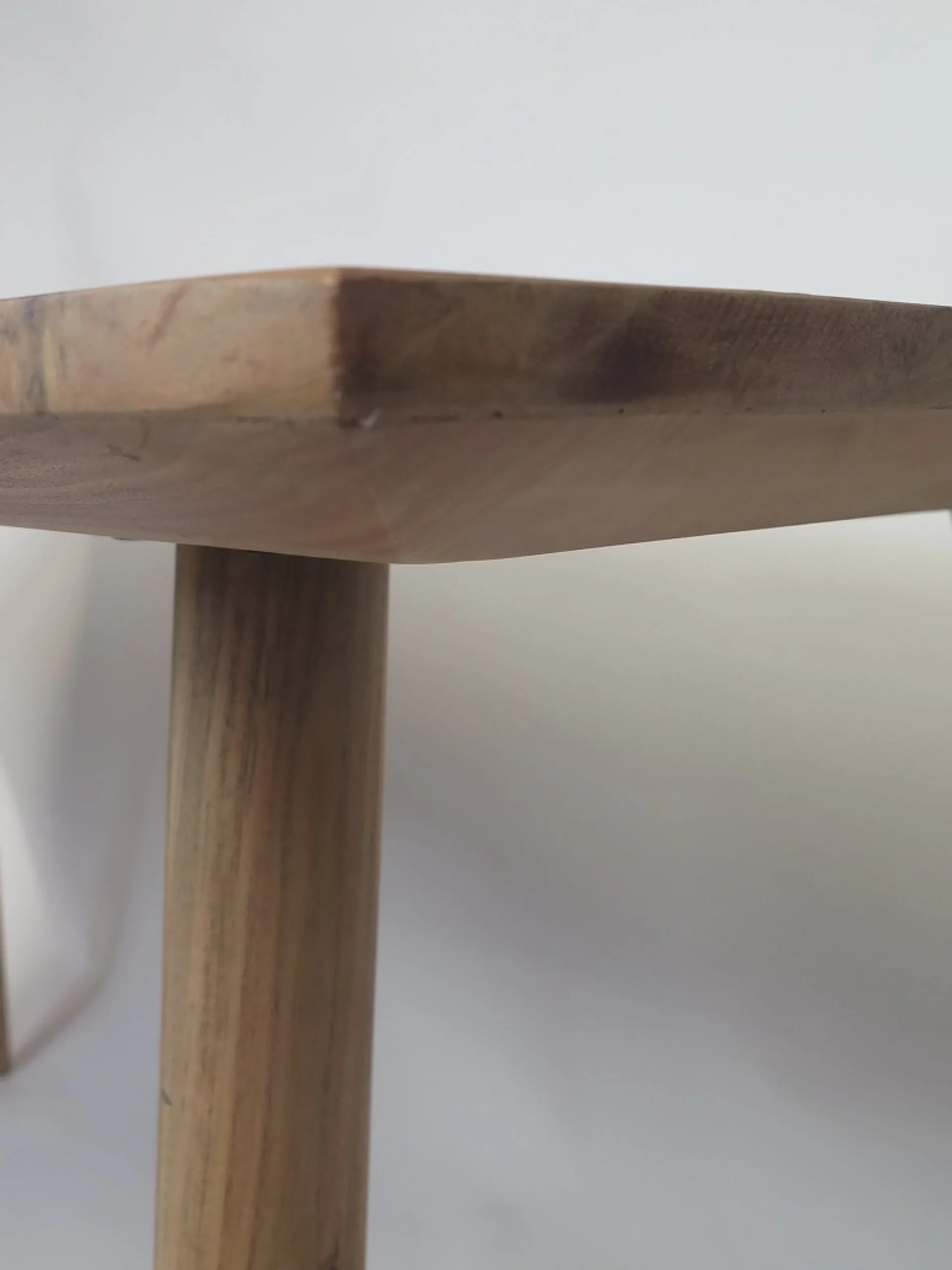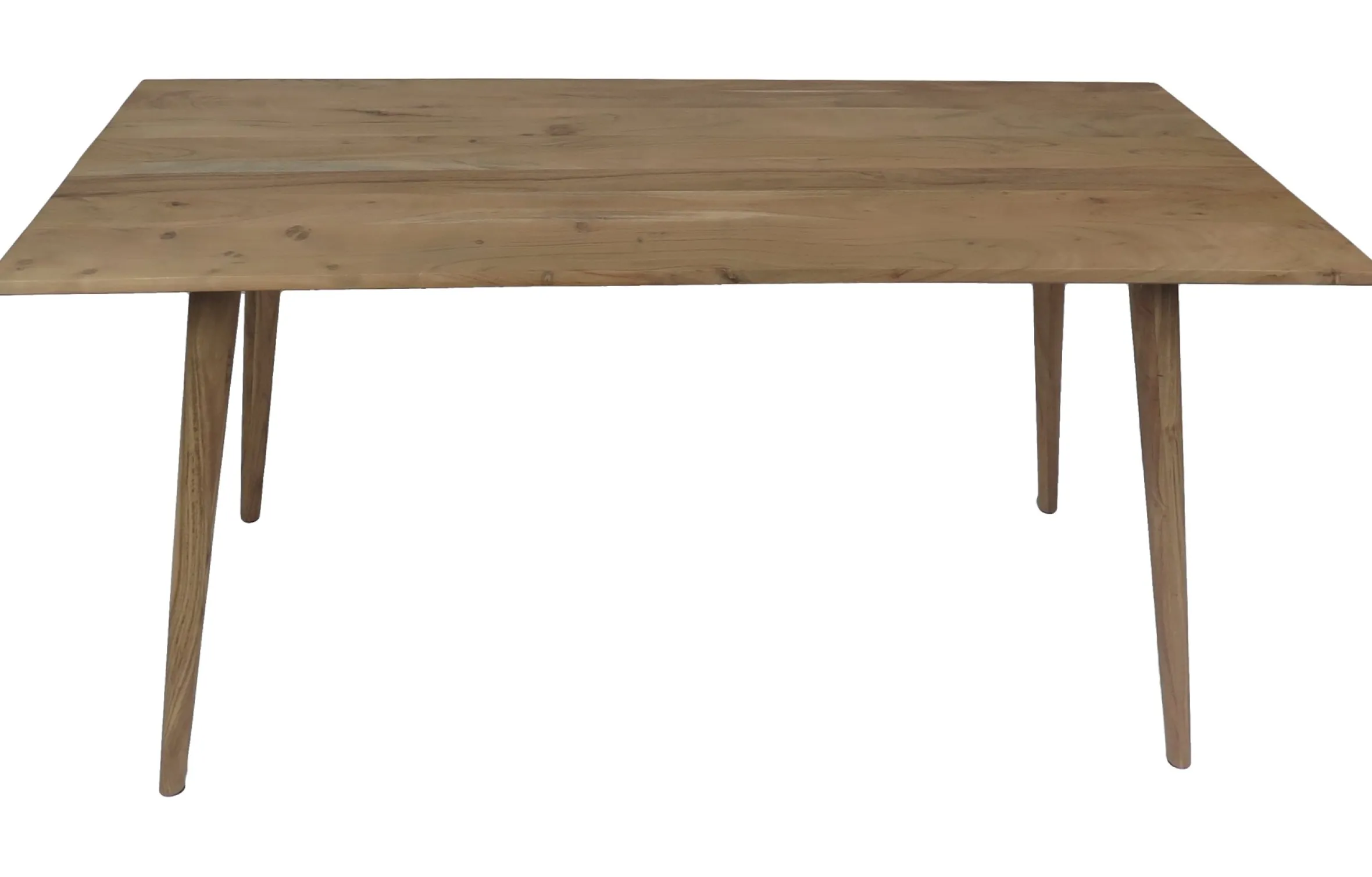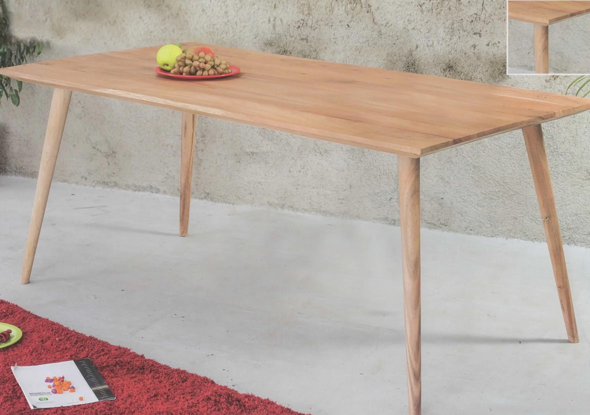 Edles Retrodesign in klarer Linienführung. Ein besonderer Augenschmaus ist bei diesem Esstisch aus massivem Akazienholz die angeschrägte Tischplatte.