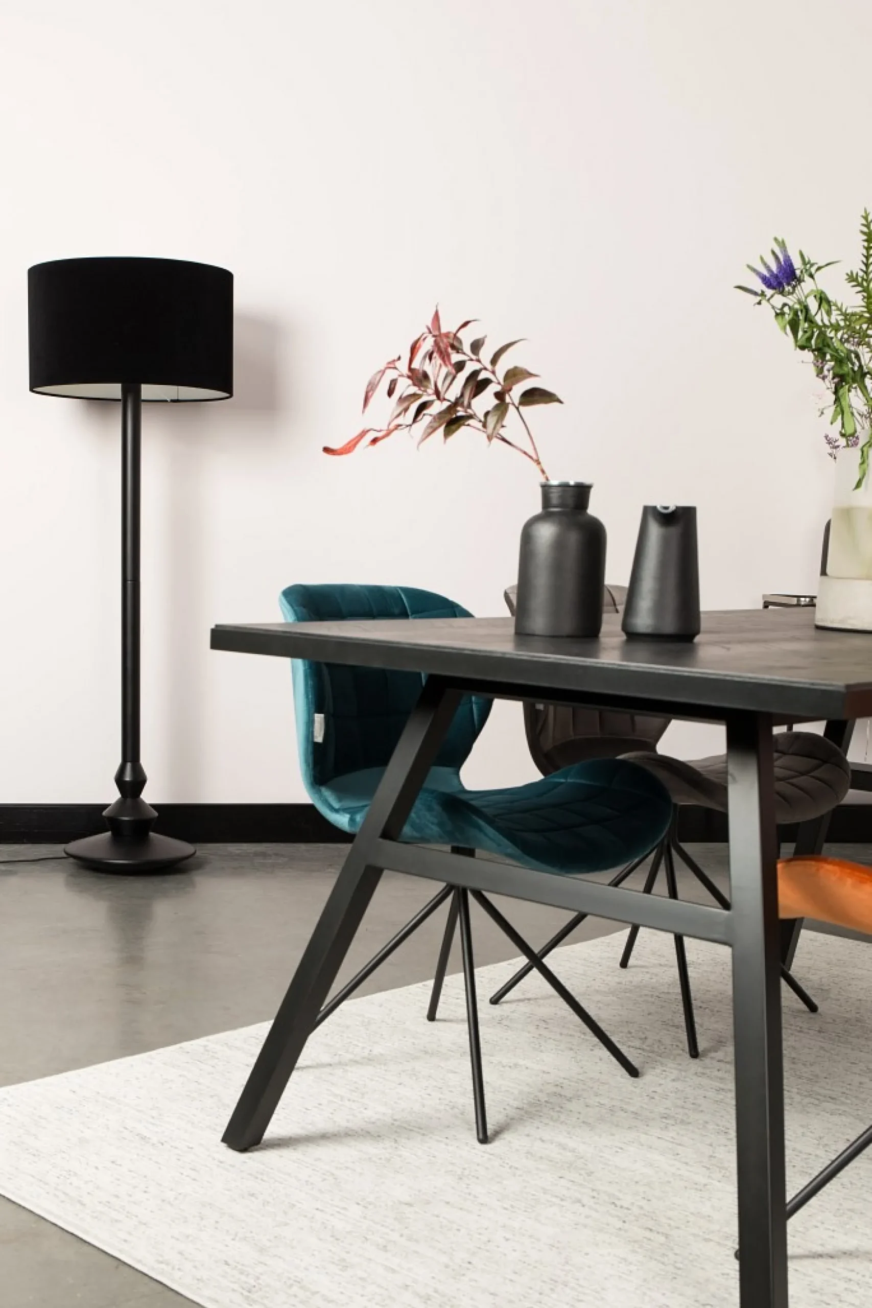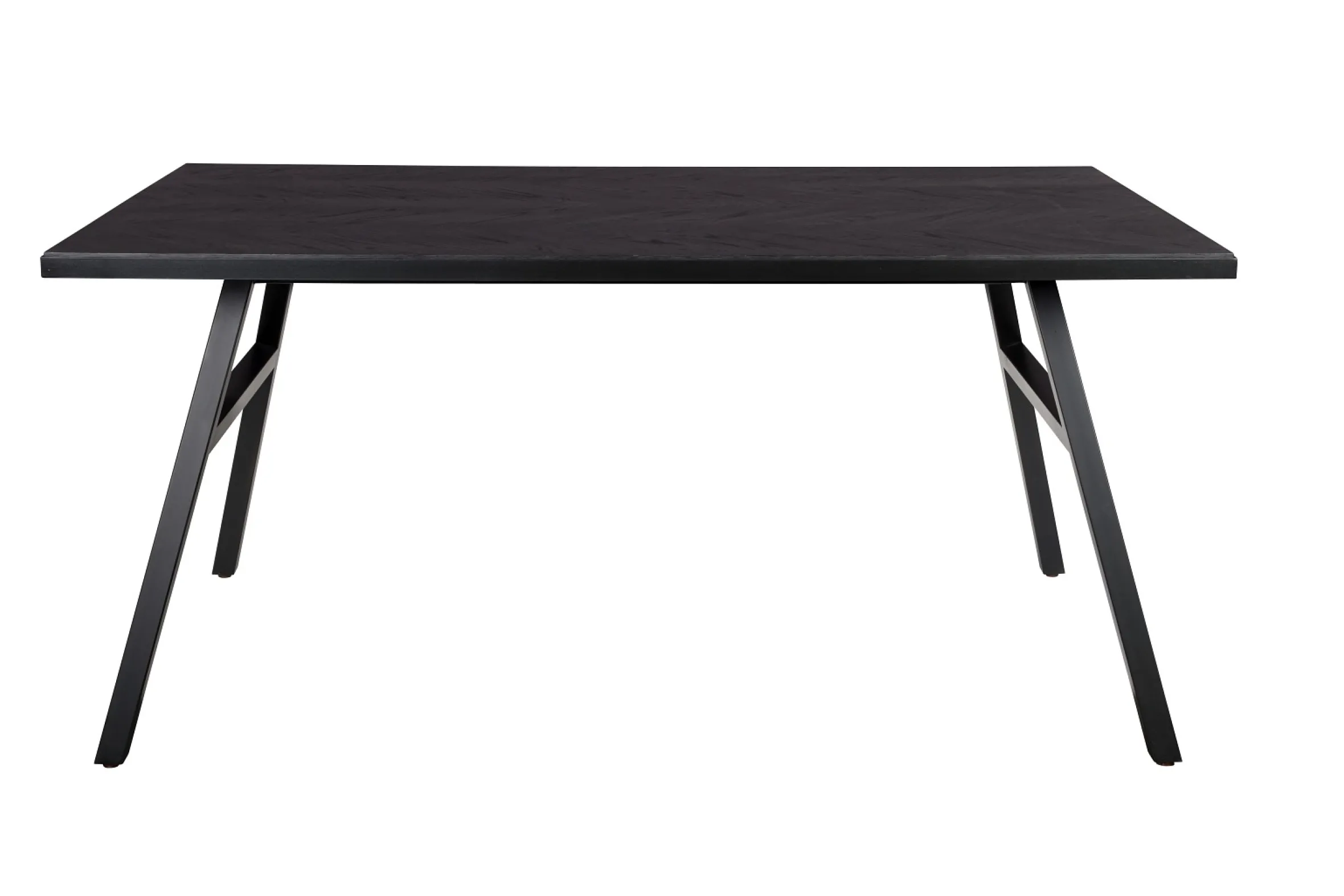 Der Esstisch Seth besticht mit seiner im Parkettstil gearbeiteten Oberfläche. Die Parkettstäbe wurden hier im Fischgrätenmuster zu einer Tischplatte gearbeitet. Dies ist ein klassisches Muster, zwei Hölzer werden hier im rechten Winkel gegeneinander versetzt. Er verfügt über vier unverwechselbare Metallbeine auf denen die schwarze Holzplatte mit Parkettmuster liegt. Die Tischplatte ist mit einem schwarz lackierten Metallrahmen umsehen, was eine ausgefallene Idee des Designer ist. Der Esstisch wirkt filigran und liegt mit seiner Kombination aus Metall und Holz ganz im Trend. Das dunkle Holz lässt sich wunderbar mit hellen und bunten Stühlen kombinieren, doch auch kühle Metallstühle wirken bei dem Zuivertisch Seth ungemein gut.