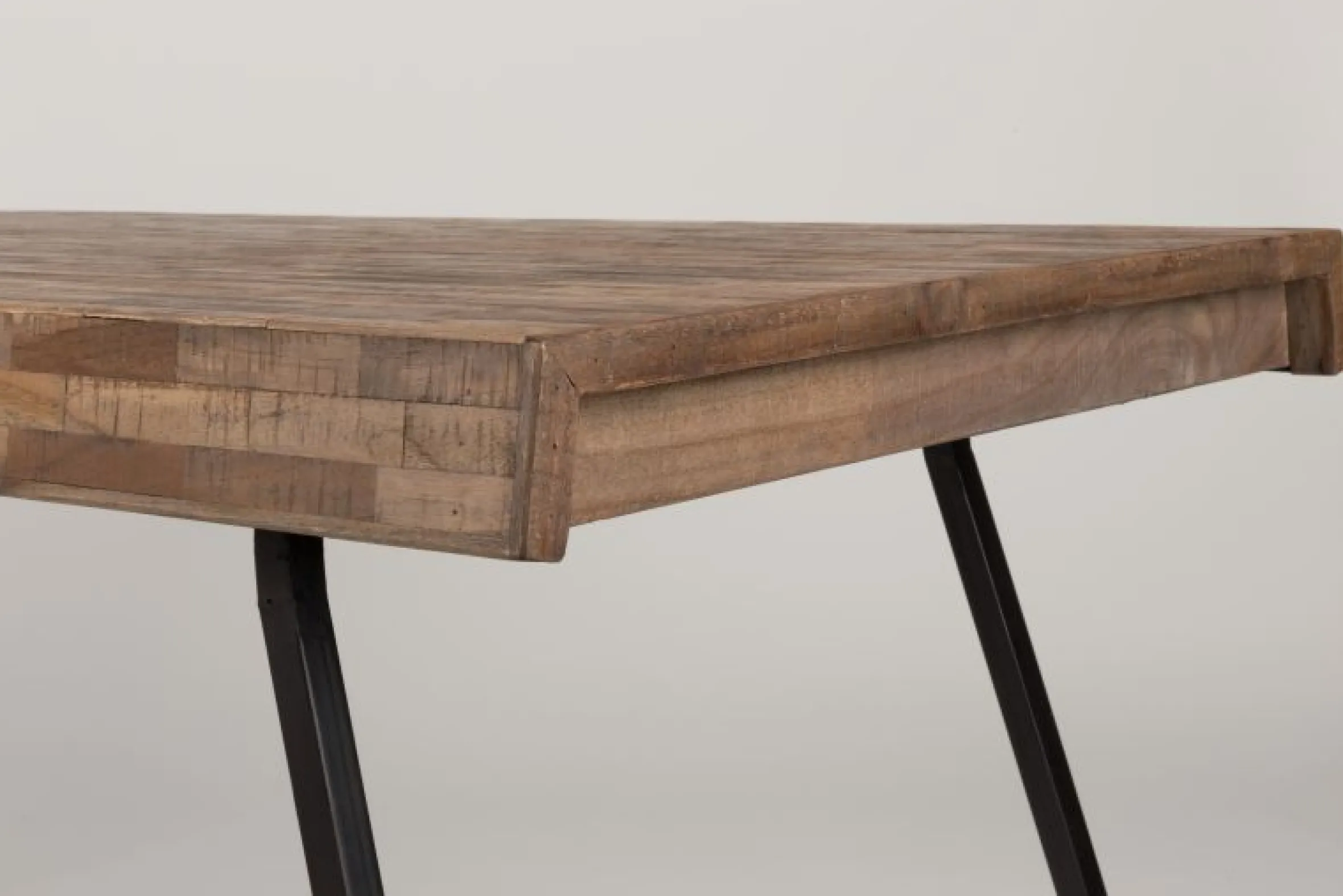 Wiederverwertetes Teakholz und ein Stahlrahmen mit antiker schwarzer Melaminbeschichtung sind die Attribute des Tisches Suri. Die extravaganten Stirnseiten geben diesem Tisch seine Individualität und den ausgefallenen Look. Die besondere Maserung der Tischplatte ergänzt das Erscheinungsbild.