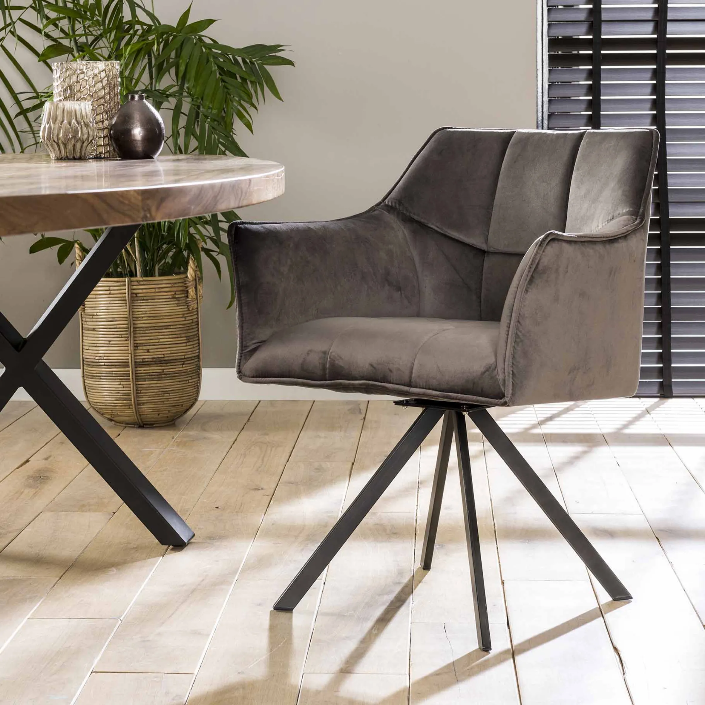 Herrlich elegant und eine Bereicherung für jeden Haushalt ist der Armlehnstuhl Raster aus der Vintagehaus Serie. Er begeistert durch den modernen Samt-Look in Verbindung mit den schwarzen ausgestellten Metallbeinen. Ob beim Candlelight Dinner oder beim entspannten Abend mit Freunden, auf dem Samtstuhl nehmen Sie bequem Platz und möchten diesen, Dank der weichen Polsterung, auch nicht mehr so schnell verlassen. Der Stuhl ist um 360 Grad drehbar. Das Design funktioniert aber auch als Schreibtischstuhl im Büro. Um den Look zu komplettieren, haben wir auch die passende Esstischbank zu den Drehstühlen.