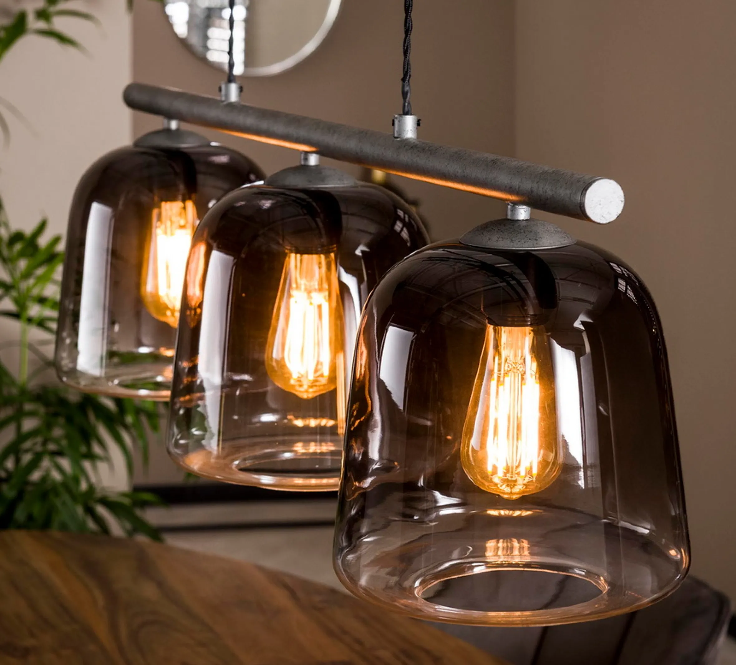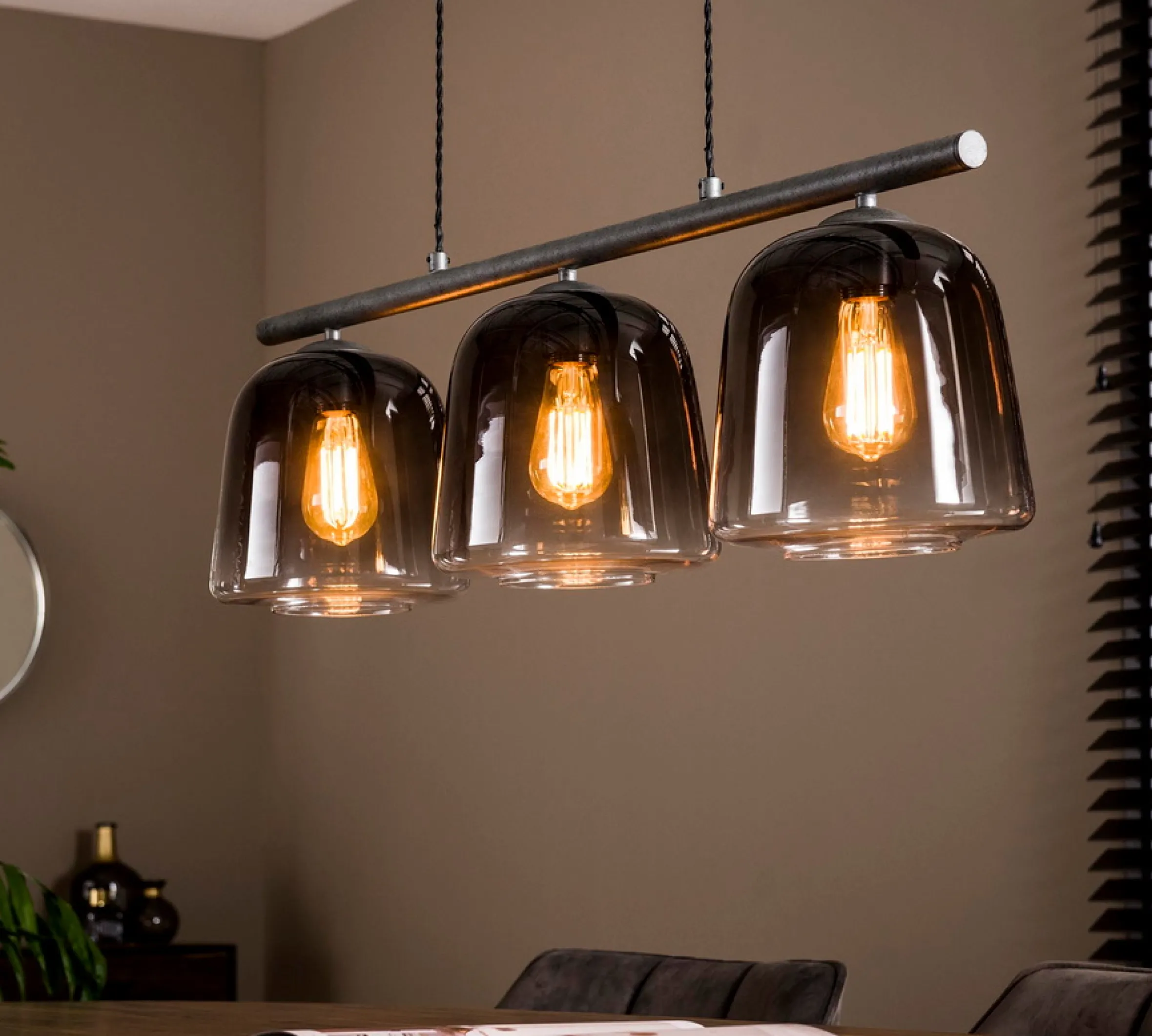 Die Hängelampe Belljar ist aus Rauchglas hergestellt. Ihre glockenförmigen Lampenschirme haben einen sehr schönen graubraunen Farbton. Im oberen Teil ist der Farbton dunkler, sodass sich ein Farbverlauf ergibt. Diesen kann man auch bei ausgeschalteter Lampe sehen. Der Raum wird so von Belljar sehr schön und wohldosiert beleuchtet. Die seitliche Abstrahlung ist durch die Tönung etwas geringer und es gibt keine starke Blendung durch die Lampe.