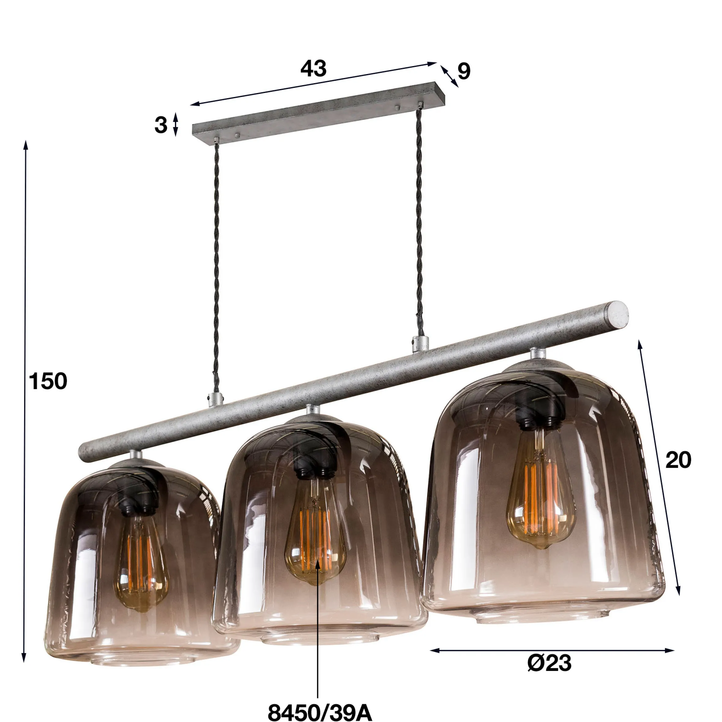 Ideal ist die Lampe über einem rechteckigen Tisch. Hier kann sie Ihre Wirkung optimal entfalten. Die Glasschirme sind unten offen, sodass die Leuchtmittel einfach getauscht werden können. Die Metallteile an der Lampe sind in einem dezenten Altsilber gehalten. Die längste Abhängung von der Decke ist mit Lampenschirm 150 cm. Überschüssiges Kabel wird einfach in dem Deckenbaldchin versteckt.