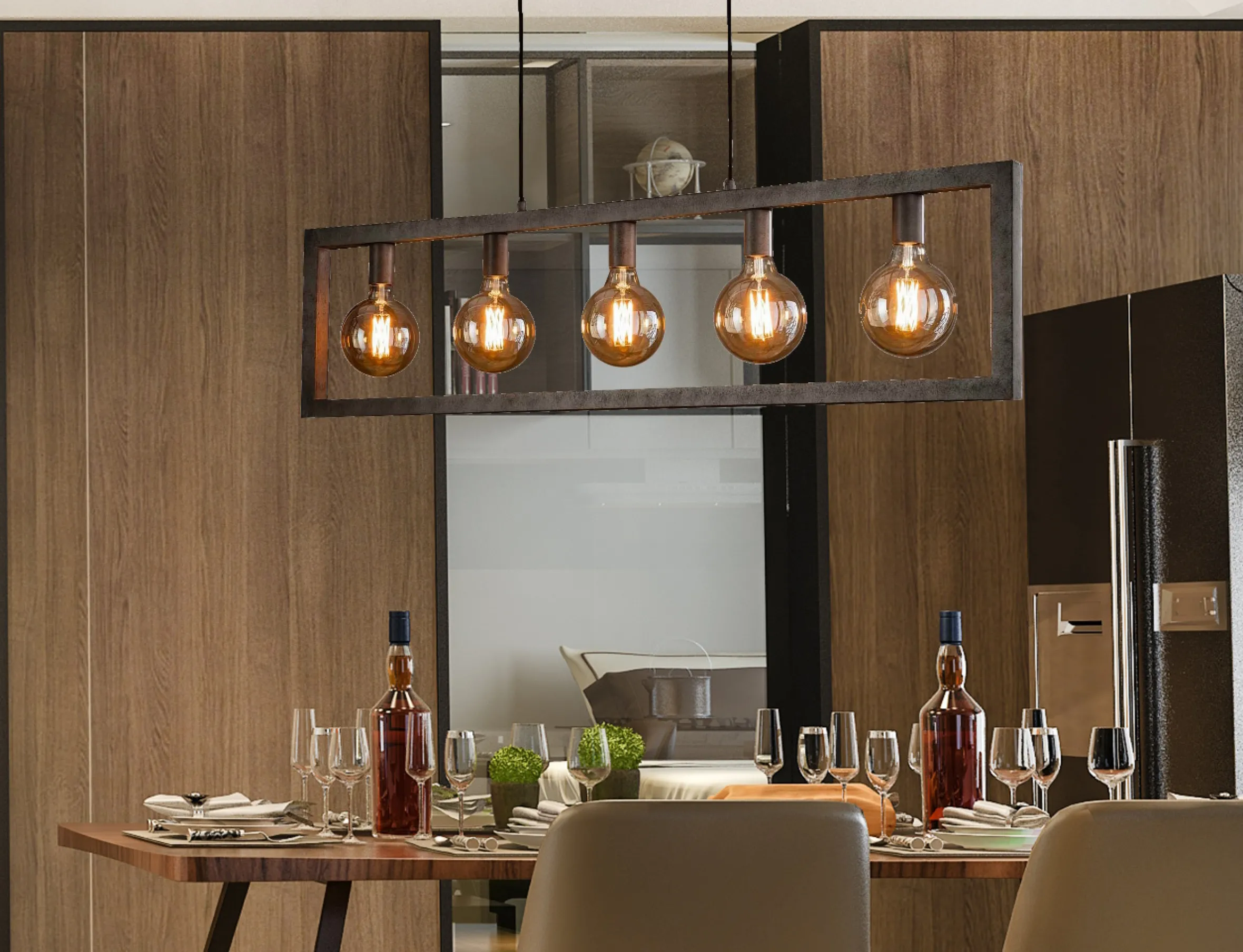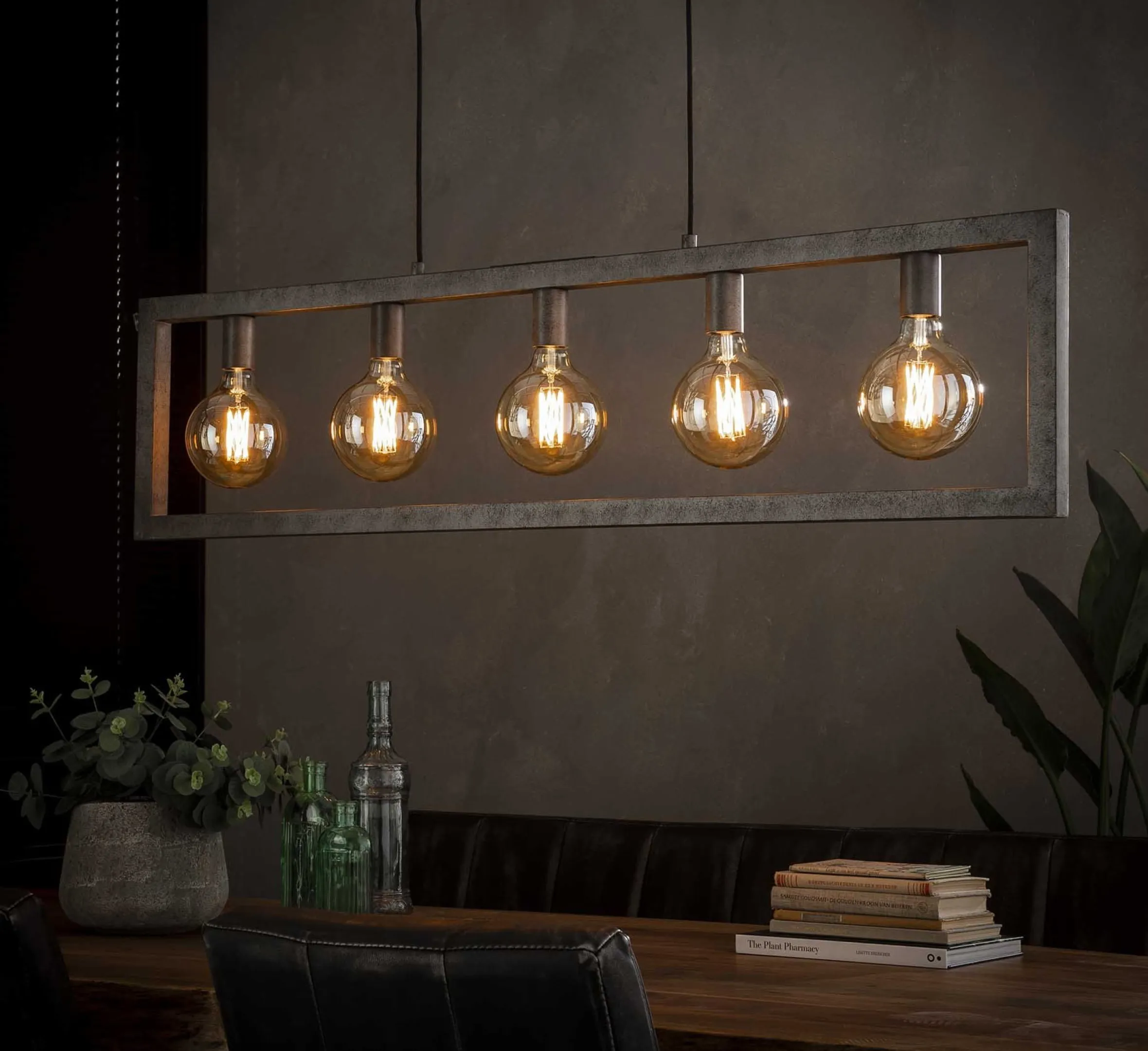 Designstark und effizient überzeugt die Hängeleuchte mit ihrem kühlen Charme. Die fünf Glühbirnen hängen frei im Metallrahmen, so dass genügend Licht über dem Esstisch und im Raum verbreitet wird. Die zwei schwarzen Kabel für die Deckenbefestigung passen perfekt in das Gesamtbild. So wird die Atmosphäre des Zimmer vollendet eingerahmt.