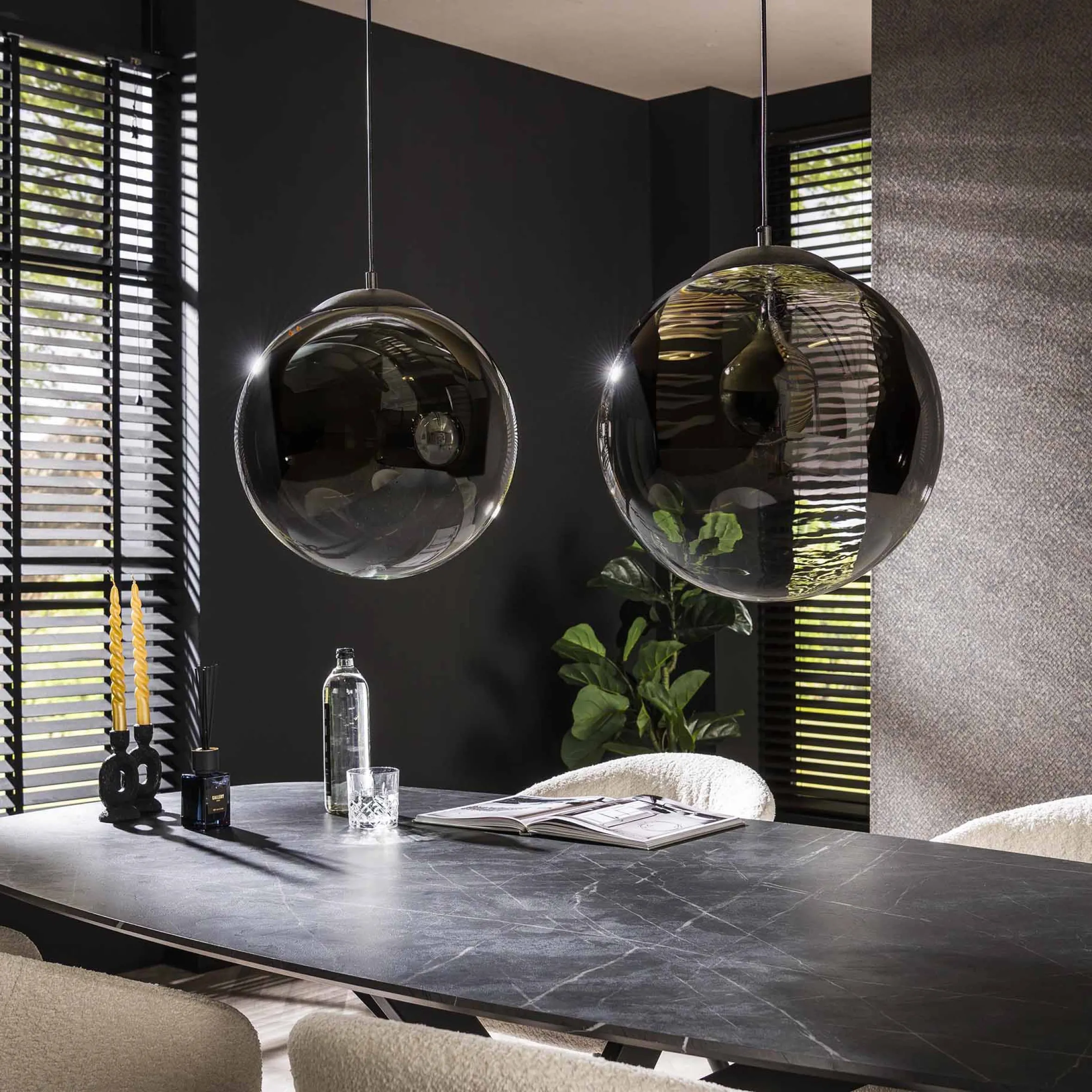 Entdecken Sie die Schönheit und Eleganz unserer Hängelampe deren 2 Glaskugeln im Rauchglas-Design wie schwebende Seifenblasen wirken. Diese planetenartigen Kugeln der Lampe bestechen auch durch ihren faszinierenden Farbverlauf, der ein modernes und stilvolles Ambiente erzeugt. Die Kugeln sind mit Chrom bedampft, im oberen Teil ist die Chromschicht dichter, sodass sich ein Farbverlauf ergibt, den man auch bei ausgeschalteter Lampe sehen kann. So wird der Raum sehr schön und wohldosiert beleuchtet. Die seitliche Abstrahlung ist so geringer und es gibt keine starke Blendung durch die Lampe. Jede Kugel ist individuell gestaltet und ergänzt sich perfekt zu der anderen, um ein harmonisches Gesamtbild zu schaffen.
