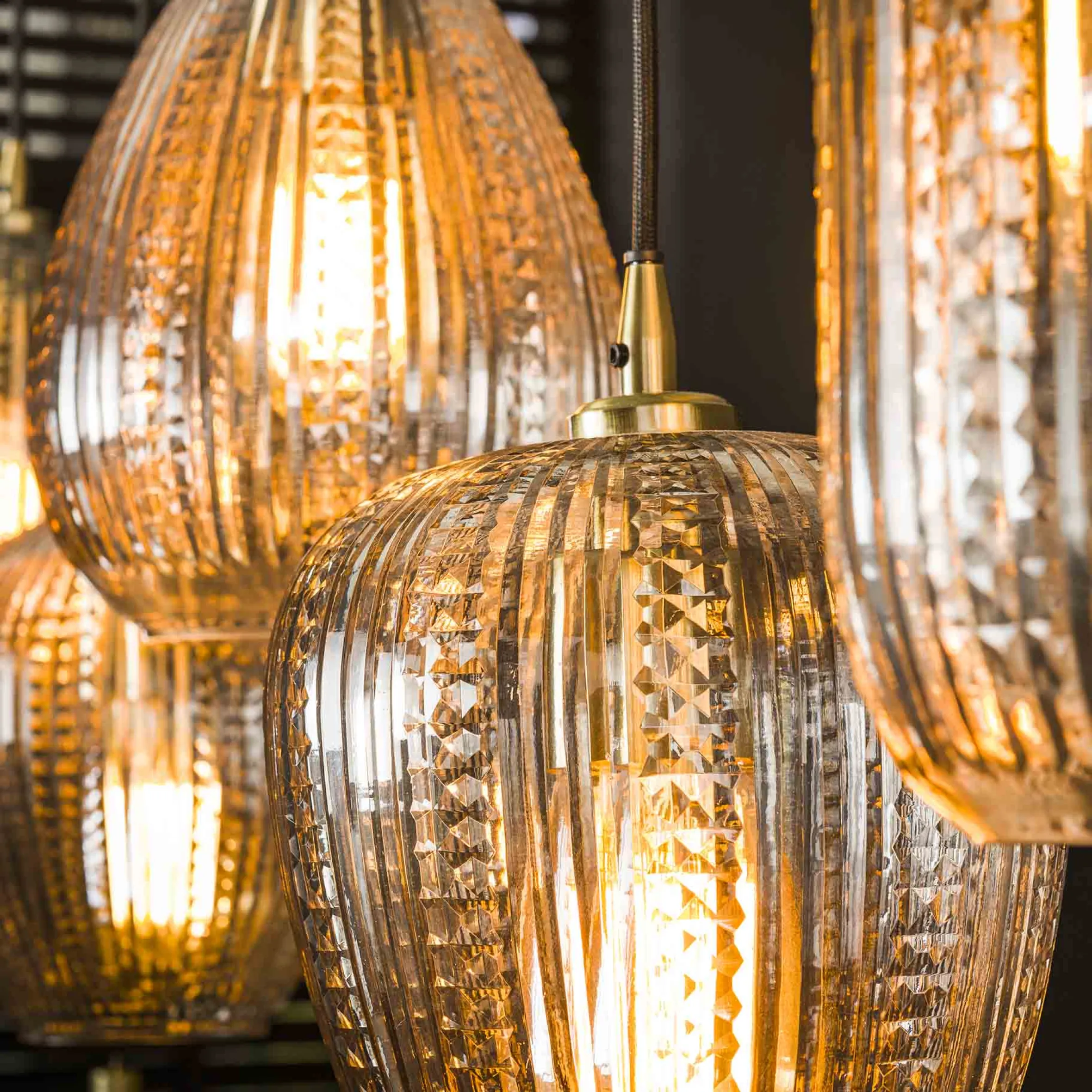 Die Pendelleuchte Diamant ist eine wunderschön gestaltet Lampe die mit ihren fünf Schirmen für ein raumgreifendes Beleuchtungsszenario sorgt. Dank des verschieden geriffelten Glases wird der Raum schön und ansprechend durch die eleganten Lampenschirme beleuchtet. Das Glas ist mundgeblasen, also handgefertigt. Das macht jedes Glas einzigartig und deswegen sind kleine Unebenheiten und Luftblasen unvermeidlich. Es sind die kleinen Unterschiede, die jedem Glas seinen eigenen Look und Charme verleihen.