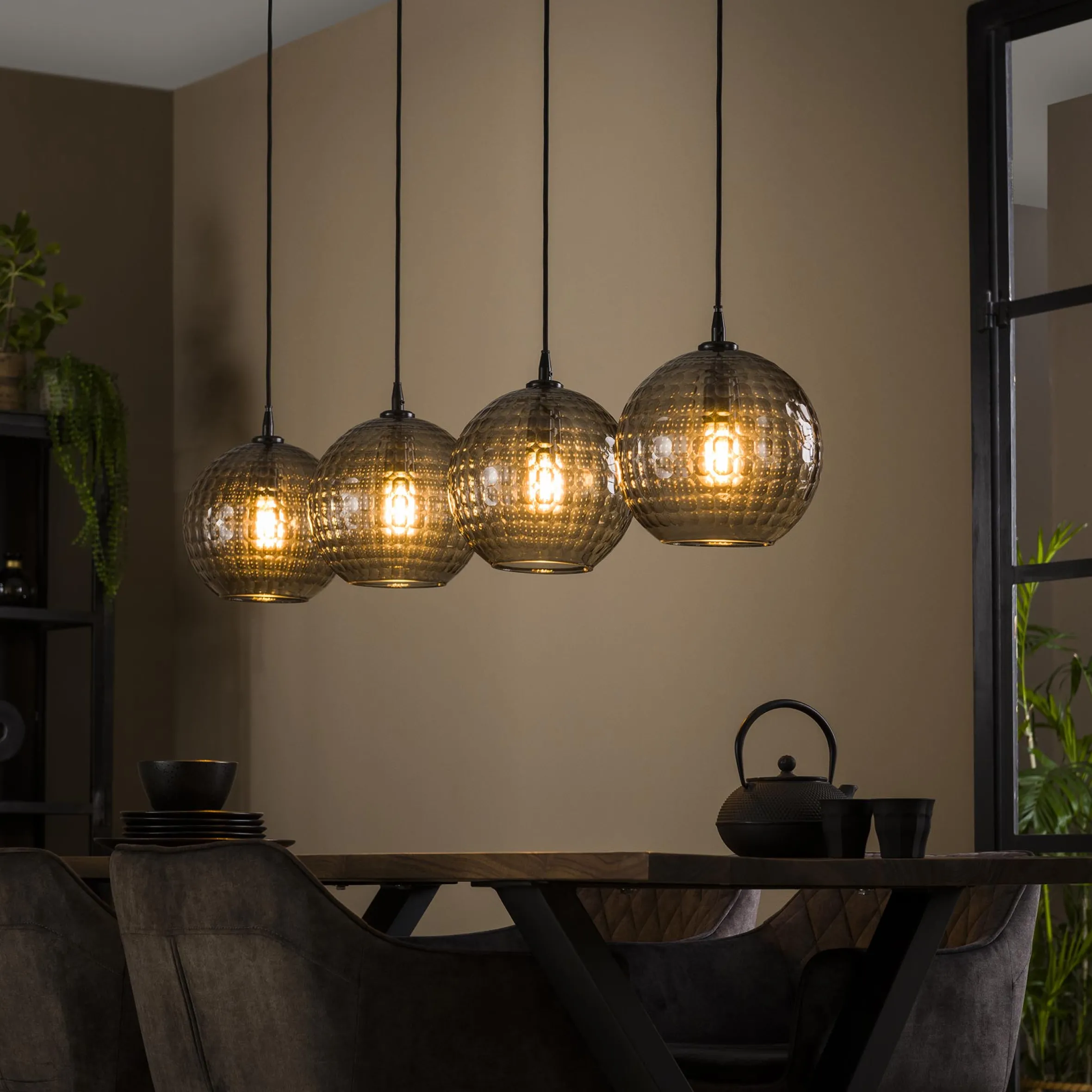 Die Pendelleuchte Retro Hexagon ist eine wunderschön gestaltet Lampe die mit ihren vier Schirmen in runder Form für ein raumgreifendes Beleuchtungsszenario sorgt. Die eleganten Lampenschirme aus Rauchglas sind mit einem Muster versehen, welches das Licht bricht und einen tollen Effekt erzeugt. Das Glas ist mundgeblasen, also handgefertigt. Das macht jedes Glas einzigartig und deswegen sind kleine Unebenheiten und Luftblasen unvermeidlich. Es sind die kleinen Unterschiede, die jedem Glas seinen eigenen Look und Charme verleihen.