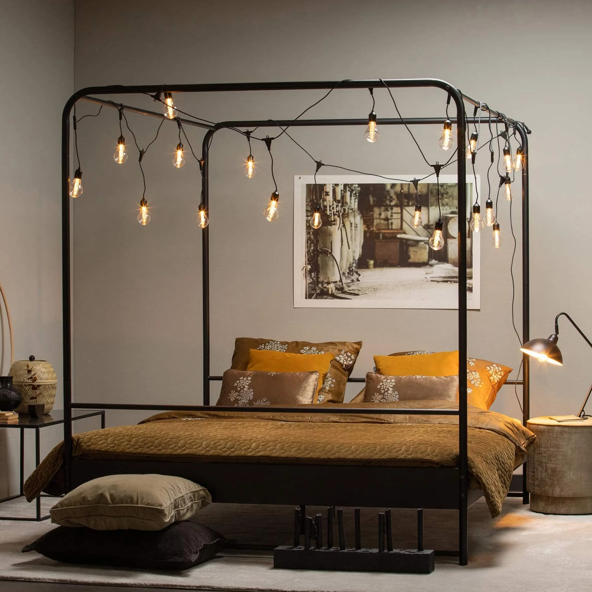 Das Metallbett Koje stellt die moderne Variante eines Himmelbettes dar, ganz schlicht und puristisch. Mit der passenden Dekoidee können Sie Ihrem Schlafzimmer aber ganz schnell einen persönlichen Touch verleihen und das Bett individuell gestalten. Das Bett ist aus pulverbeschichtetem Metall und hat einen Stahllattenrost. Das Gestell ist abgerundet, was dem Look etwas verspieltes gibt. Die Schlichtheit des Designs des Bettes sorgt für einen vielseitig kombinierbaren Stil.