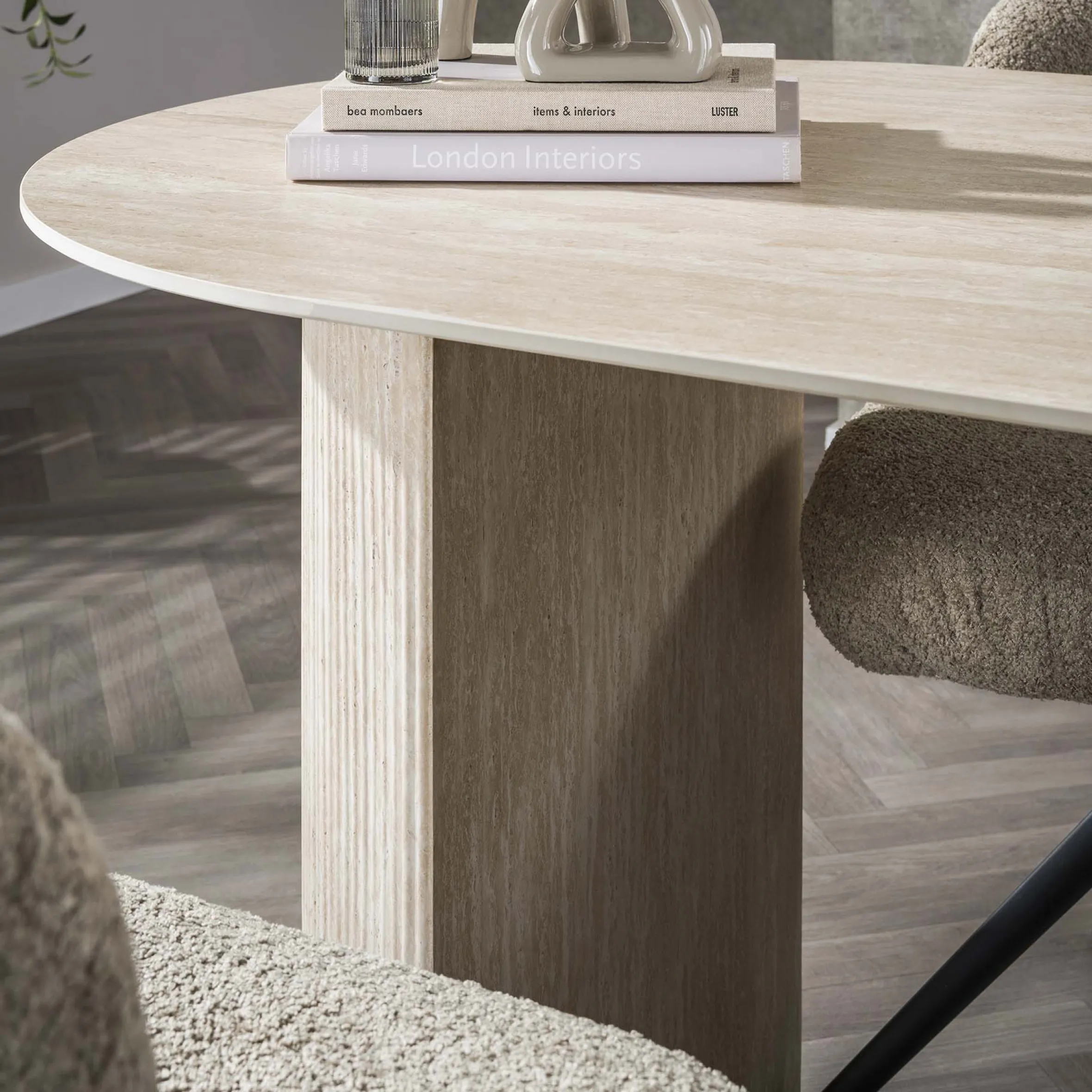 Mit seiner organischen, sanften Form sorgt der Esstisch Arch Organic für Natürlichkeit und setzt mit seinem einzigartigen Design ein Statement. Die weichen und runden Formen erinnern an Steine, die von Wind, Wasser und Sand geformt wurden. Mit diesem großen Tisch erhalten Sie ein ästhetisches Highlight für Ihr Zuhause, das aus hochwertigem Travertin-Keramik und MDF hergestellt ist. Travertin ist ein Kalkstein von heller, meist gelblicher und brauner oder seltener beiger oder roter Farbe, der aus kalten, warmen oder heißen Süßwasserquellen stammt.Die Tischplatte bietet ausreichend Platz für Familie und Gäste. Die halbmondförmigen Beine aus MDF sorgen für einen festen Stand. Egal, ob Sie einen modernen, industriellen oder einen Retro-Look bevorzugen, der Tisch ist vielseitig einsetzbar!
