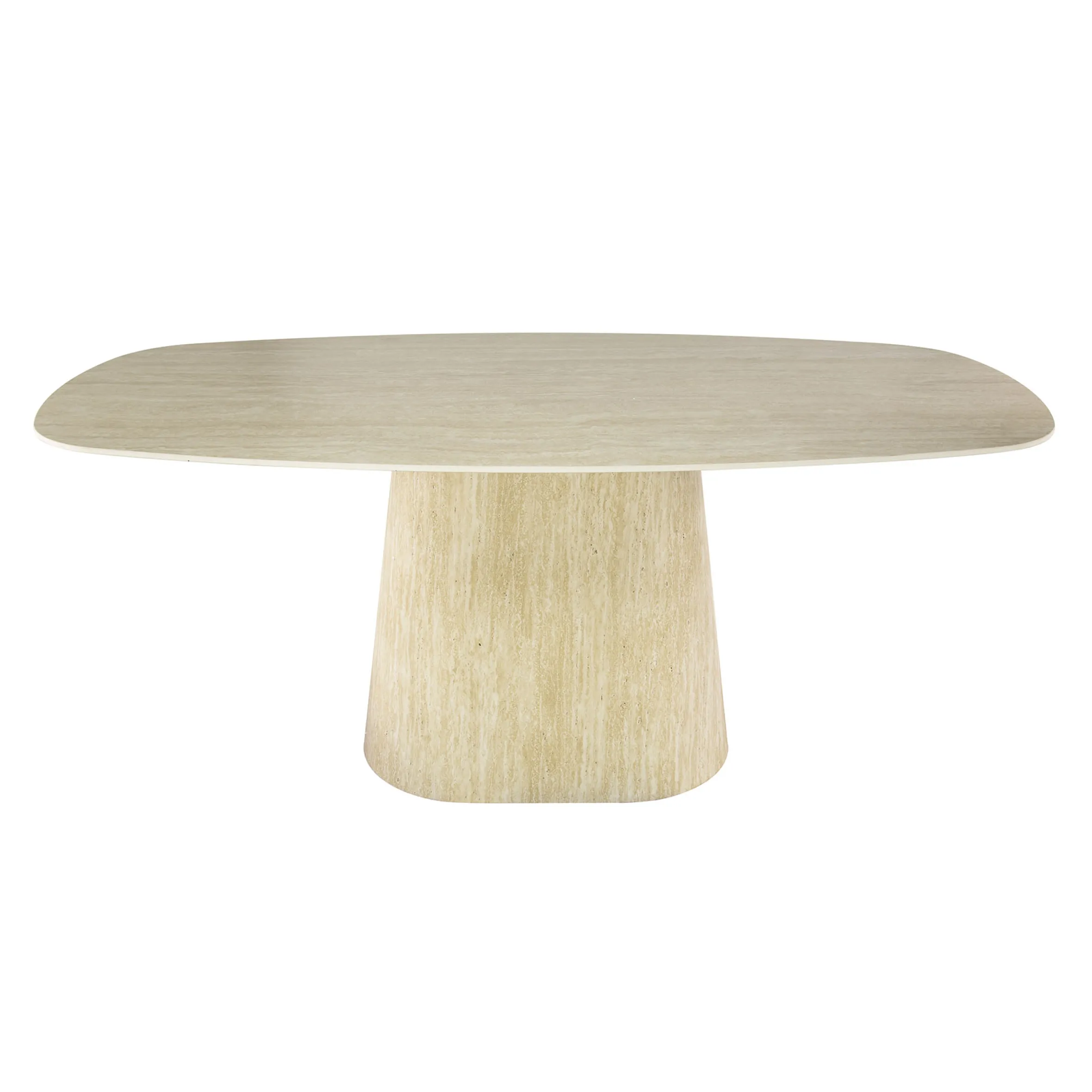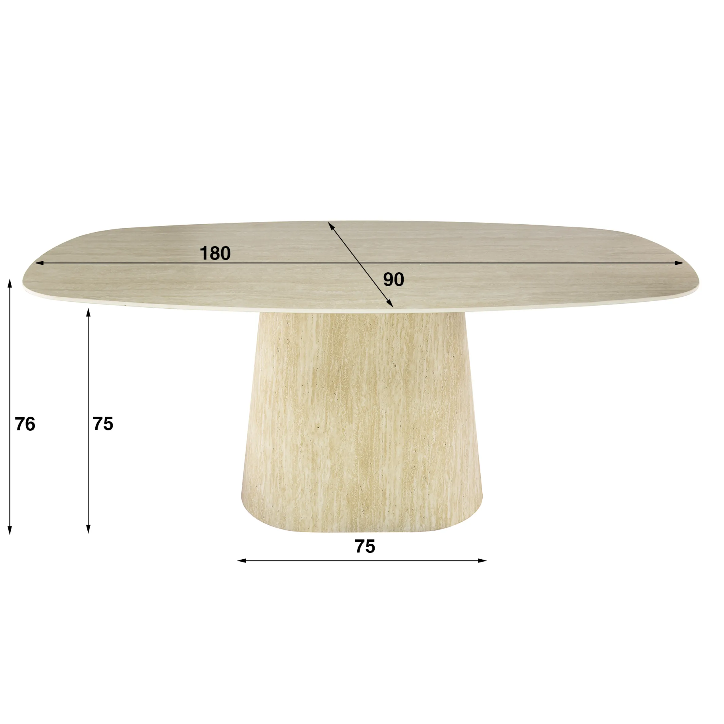 Der kraftvolle, konisch geformte Fuß, mit hochwertigem Melamin in vollendeter Travertinoptik beschichtet, bildet das elegante Fundament dieser Skulptur. Er verleiht dem Tisch eine majestätische Präsenz – beständig, ausgewogen und von zeitloser Schönheit.