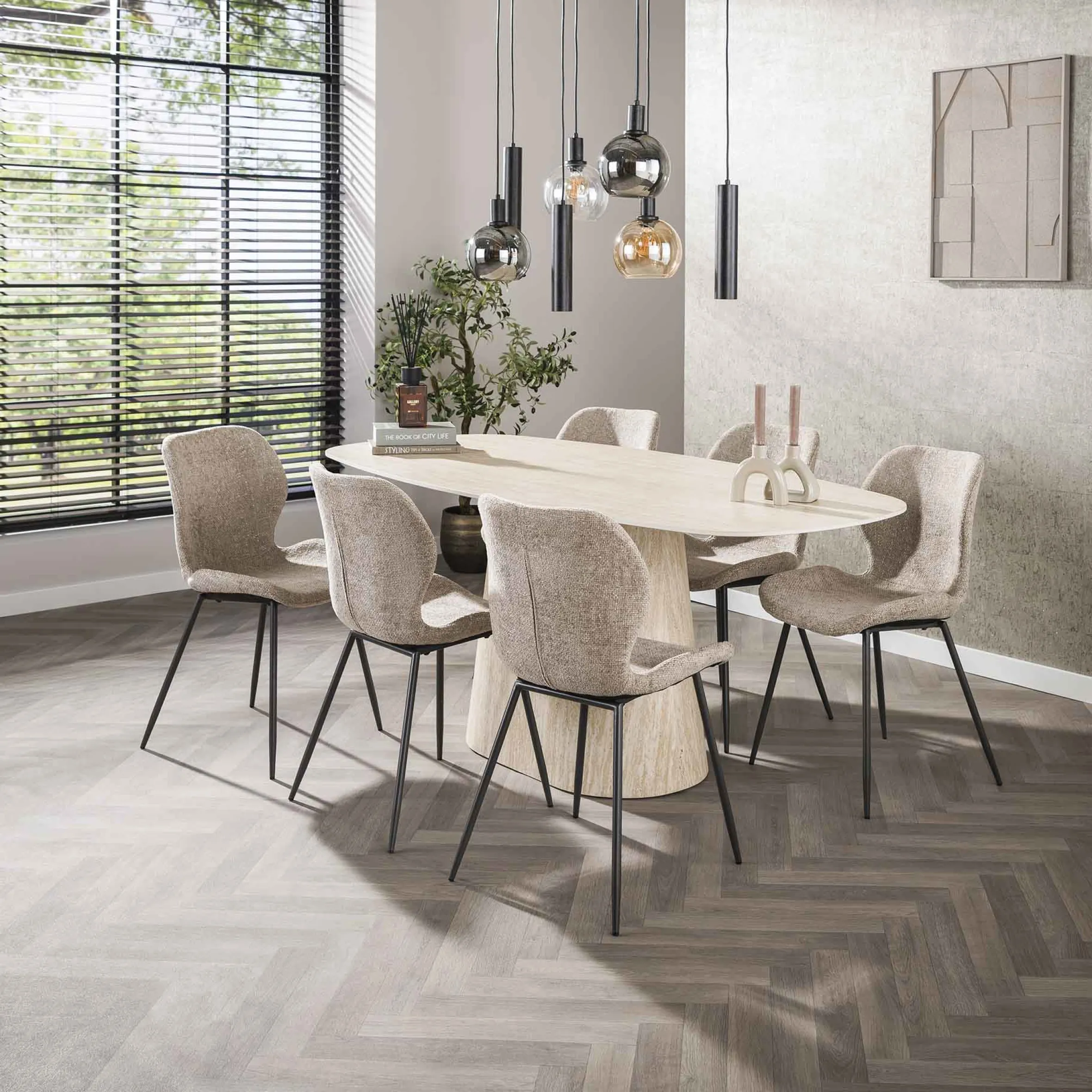 Ein Esstisch, der mehr ist als ein Möbelstück – er ist eine Hommage an die Kunst des Wohnens. Die edle Tischplatte aus einem erlesenen Keramik-Travertin-Gemisch entfaltet ihre natürliche Raffinesse in feinen, sanft schimmernden Nuancen. Ihre glatte, kühle Oberfläche fängt das Licht auf subtile Weise ein und verleiht dem Raum eine Aura von Ruhe und Exklusivität. Das Material ist kratzfest, schmutzabweisend und hitzebeständig und eignet sich daher ideal für intensive Nutzung ohne besondere Pflege.