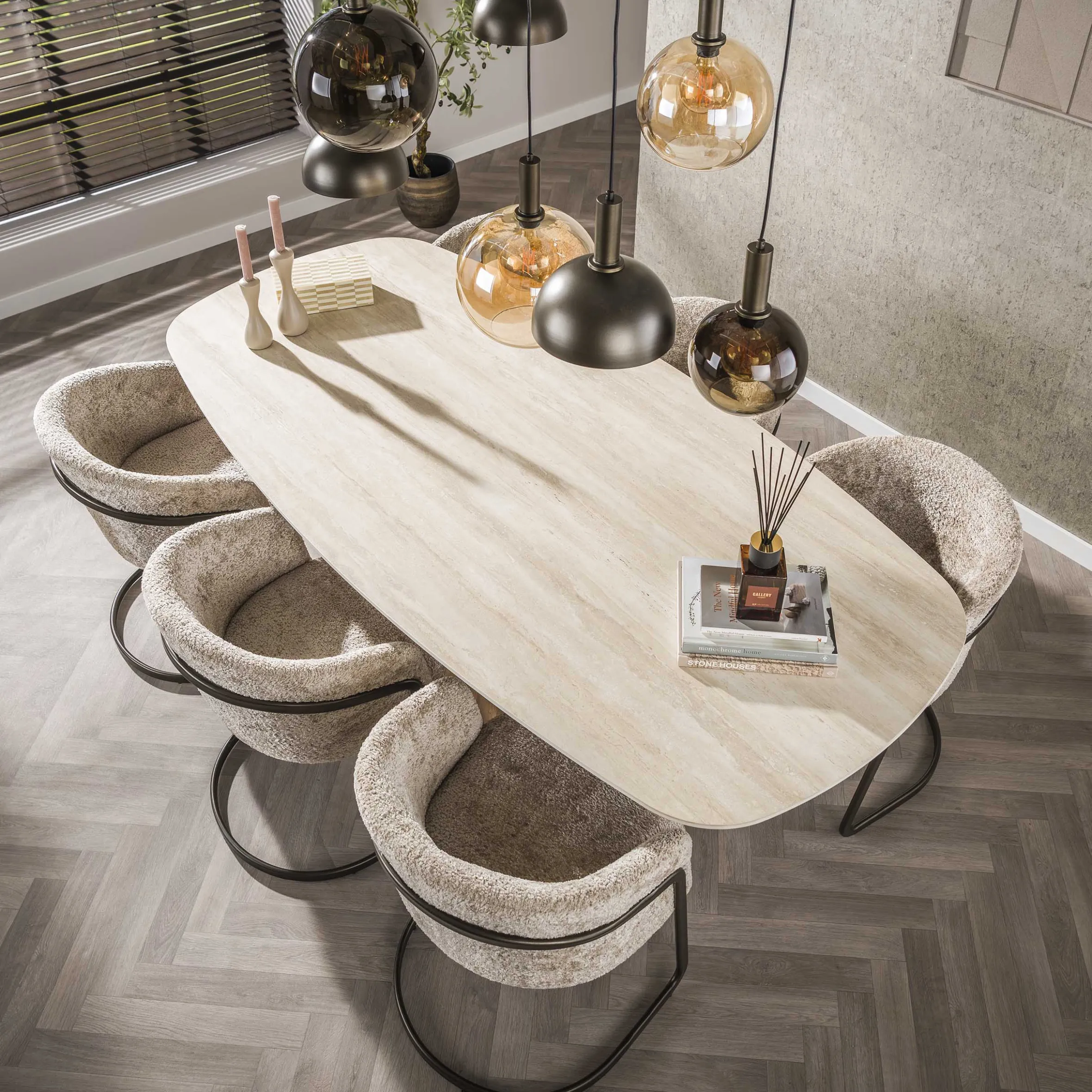 Ein Esstisch, der mehr ist als ein Möbelstück – er ist eine Hommage an die Kunst des Wohnens. Die edle Tischplatte aus einem erlesenen Keramik-Travertin-Gemisch entfaltet ihre natürliche Raffinesse in feinen, sanft schimmernden Nuancen. Ihre glatte, kühle Oberfläche fängt das Licht auf subtile Weise ein und verleiht dem Raum eine Aura von Ruhe und Exklusivität. Das Material ist kratzfest, schmutzabweisend und hitzebeständig und eignet sich daher ideal für intensive Nutzung ohne besondere Pflege.