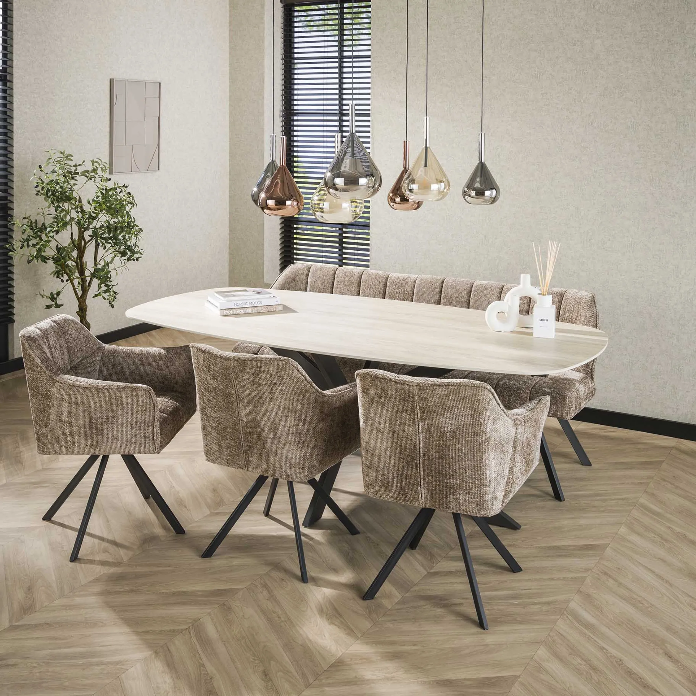 Mit seiner organischen, sanften Form sorgt der Esstisch Arch Organic für Natürlichkeit und setzt mit seinem einzigartigen Design ein Statement. Die weichen und runden Formen erinnern an Steine, die von Wind, Wasser und Sand geformt wurden. Mit diesem großen Tisch erhalten Sie ein ästhetisches Highlight für Ihr Zuhause, das aus hochwertigem Travertin-Keramik und Metall hergestellt ist. Travertin ist ein Kalkstein von heller, meist gelblicher und brauner oder seltener beiger oder roter Farbe, der aus kalten, warmen oder heißen Süßwasserquellen stammt.Die Tischplatte bietet ausreichend Platz für Familie und Gäste. Die Platte wird von einem modernen Spidergestell getragen, das nicht nur stabil und robust ist, sondern auch ein echter Hingucker. Die verästelte Struktur des Gestells sorgt für eine stabile Konstruktion.Egal, ob Sie einen modernen, industriellen oder einen Retro-Look bevorzugen, der Tisch ist vielseitig einsetzbar!