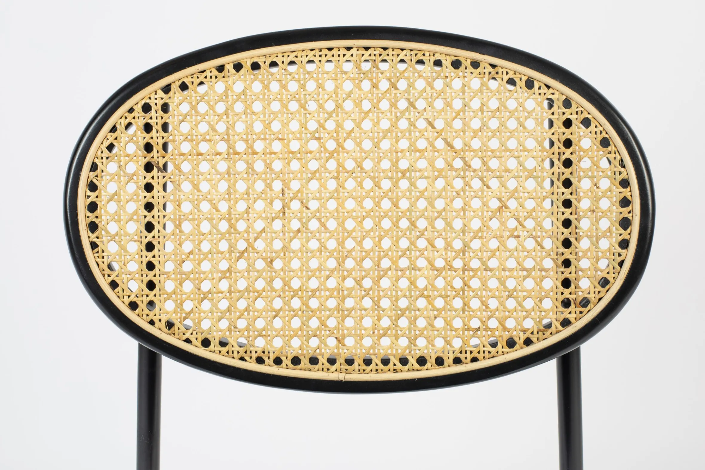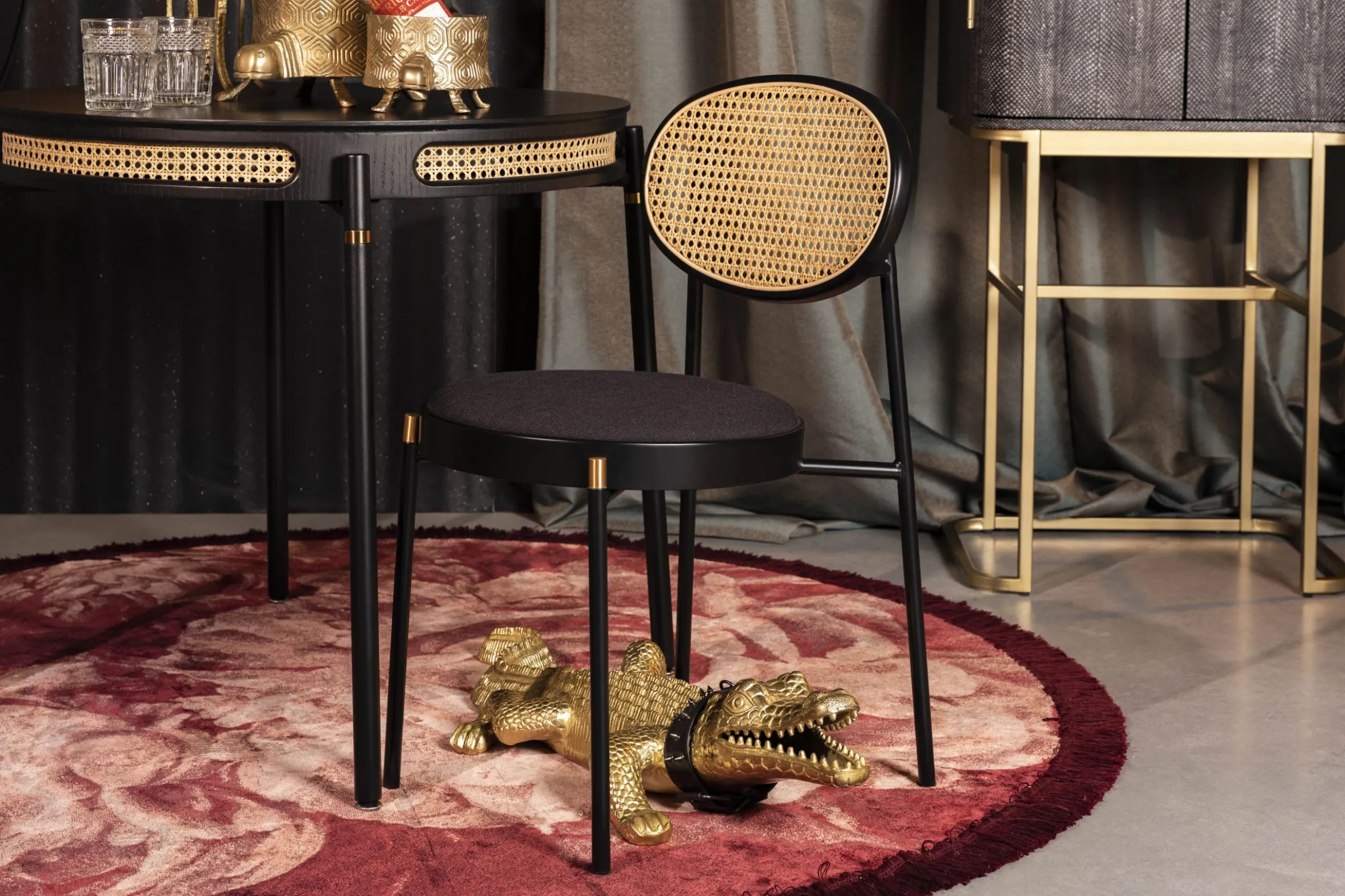 Neutrale Beigetöne gepaart mit schwarz lackiertem Buchenholz sind die perfekte Kombination für Liebhaber von minimalem Design. Das Zusammentreffen des leicht retromäßigen Rattans mit den eleganten Kurven des Stuhldesigns würde jeden Liebhaber von Mid-Century-Möbeln ansprechen. Dank der klaren Linien und der klassischen Details mit Goldspitzen ist dies ein Esszimmerstuhl, der an jedem Tisch willkommen ist.