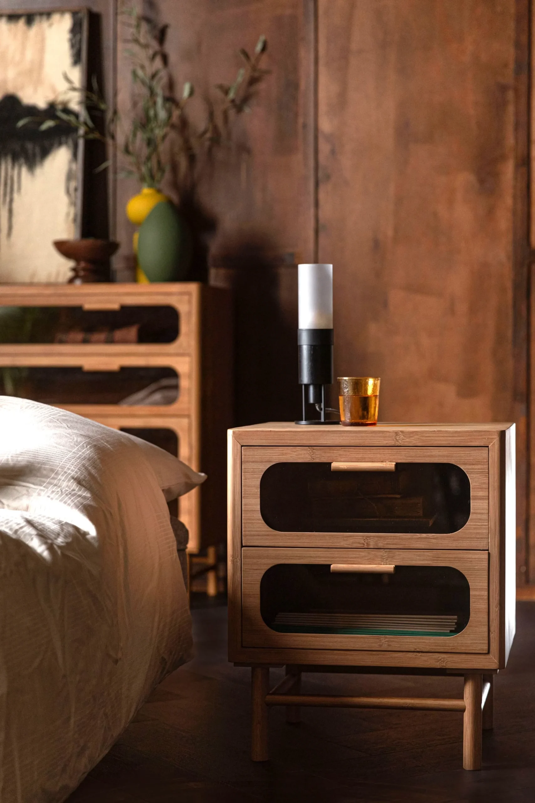 Retro Nachttisch Beistelltisch Caroun Bambus Rauchglas