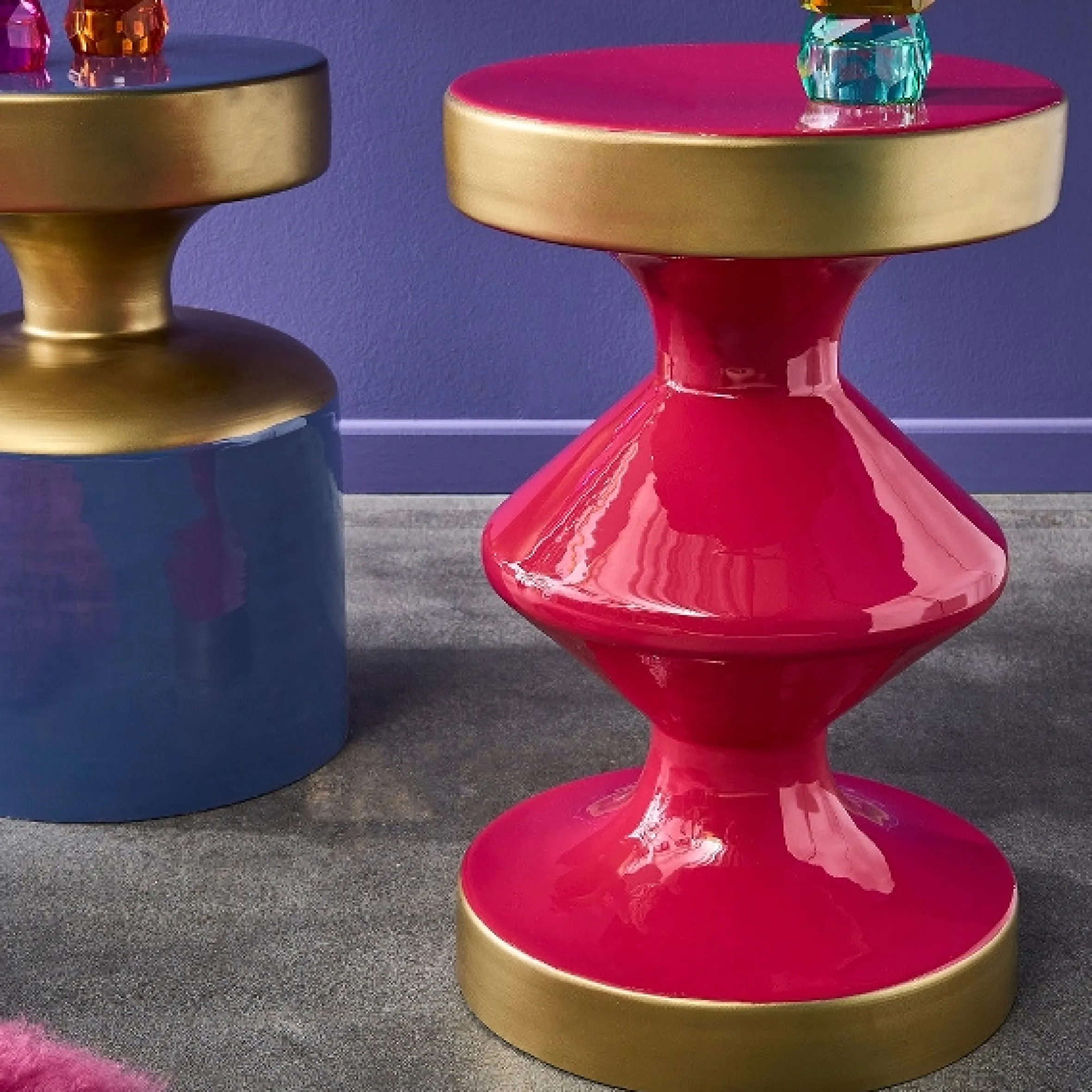 Entdecken Sie unsere einzigartigen Beistelltische Glam – eine Fusion aus Retro-Design und moderner Eleganz. Die geometrischen Formen verleihen diesen Couchtischen eine fantasievolle Ästhetik, während die Farbkombinationen für einen Hauch von 80er Pop und Raffinesse sorgen. Hergestellt aus hochwertigem lackiertem Metall besticht dieser Tisch zusätzlich durch seine Stabilität und Langlebigkeit. Holen Sie sich Glamour und Retro-Charme in Ihr Zuhause!
