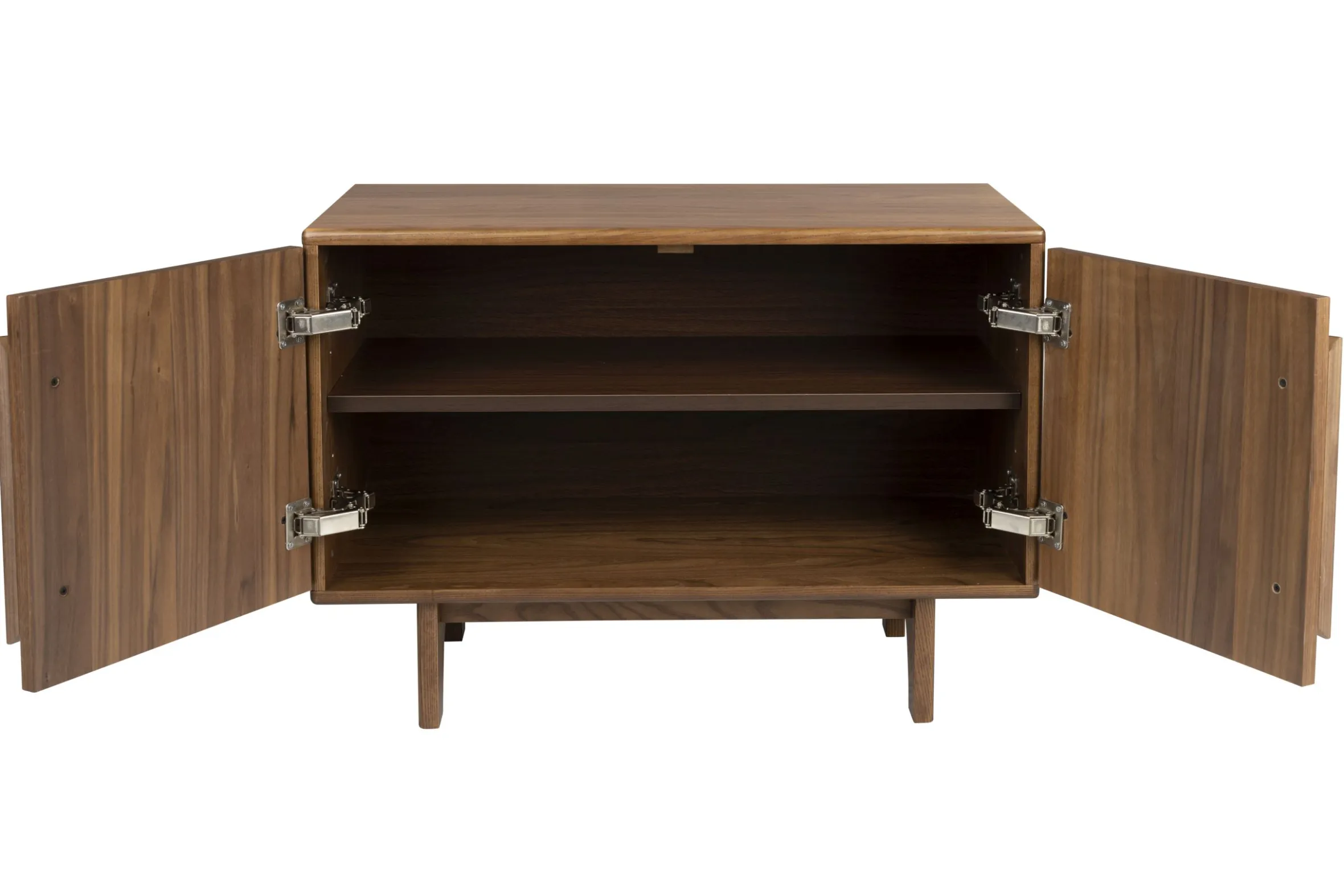 - Natürliche Materialien: Korpus Eschenholz, Oberseite und Tür des Schranks aus MDF mit Nussbaumfurnier oder Eichenfurnier und klarer Lackierung.