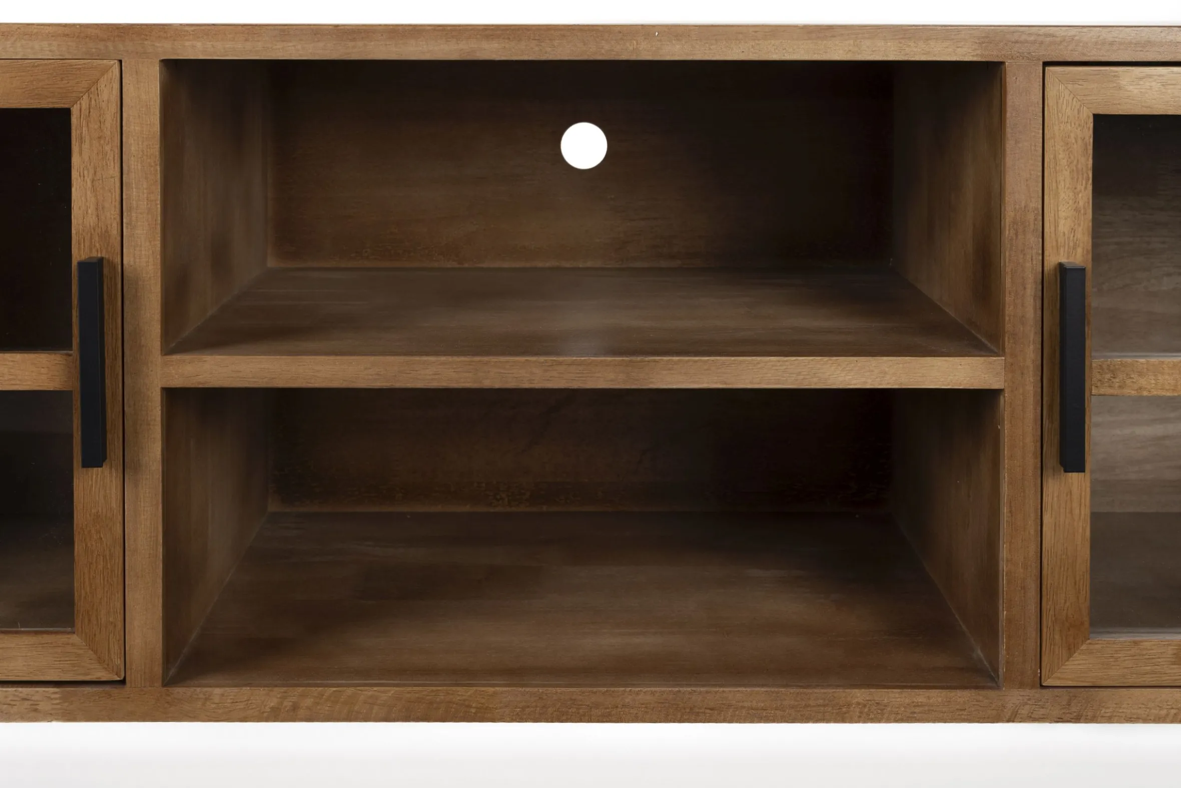 Dieses stilvolle TV-Board verbindet zeitloses Design mit praktischer Funktionalität. Der Schrank besteht aus hochwertigem Gummibaumholz und bietet mit seiner eleganten Glasfront einen attraktiven Platz, um Bücher, Dekorationen und Elektrogeräte stilvoll zur Schau zu stellen. Mit seinen großzügigen Fächern und dem robusten Korpus im Sprossendesign ist dieser Vitrinenschrank ideal für das Wohnzimmer und den Fernseher.