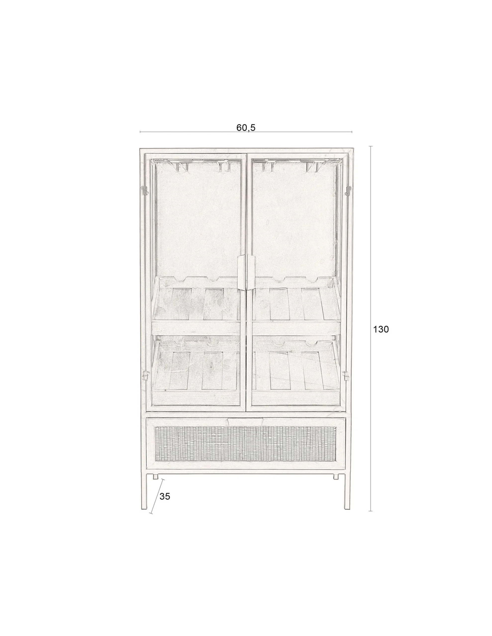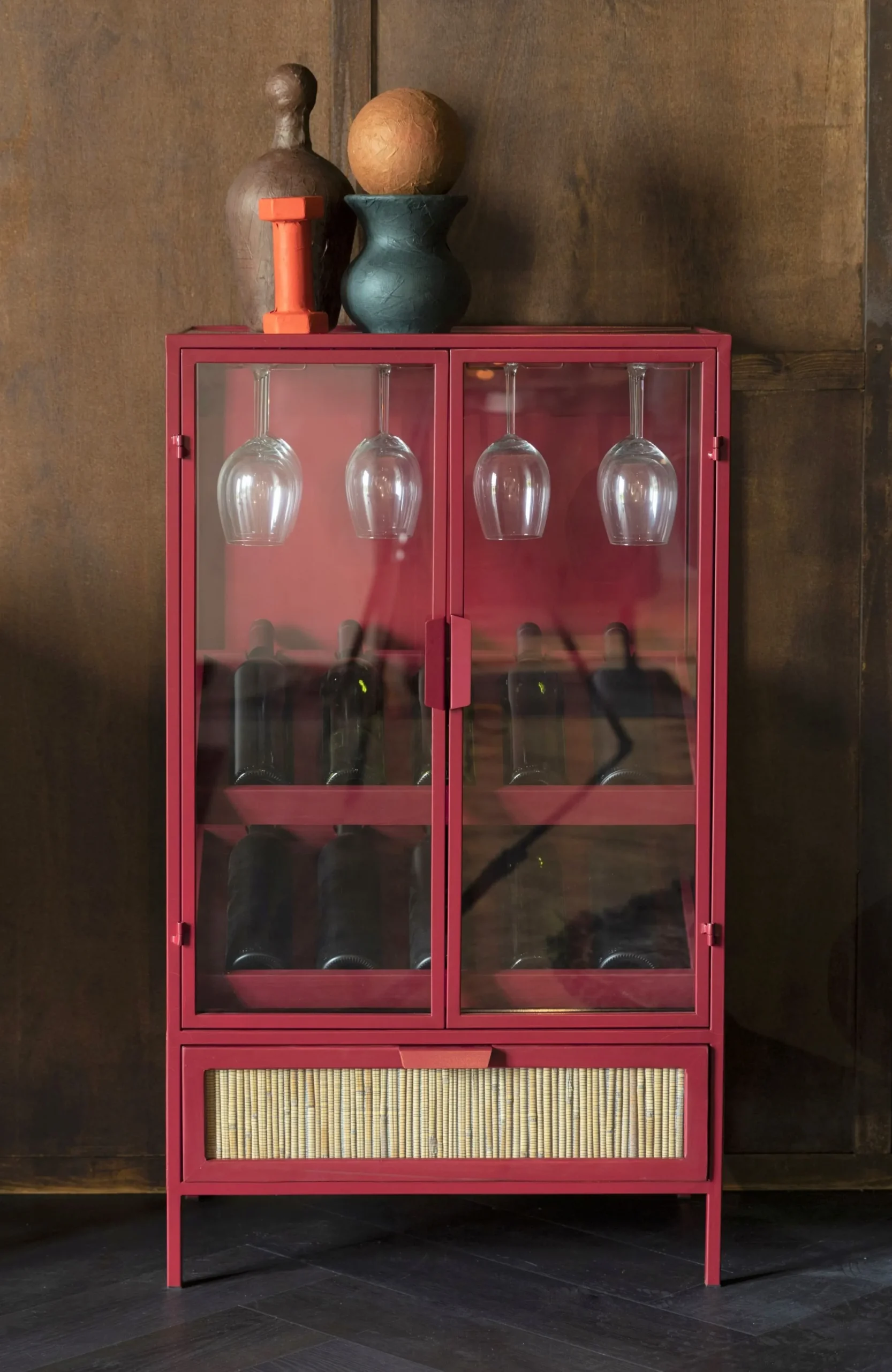 Dieser stilvolle Barschrank ist ein wahrer Blickfang in Ihrer Einrichtung! Der in warmem Rot gehaltene Schrank hat transparente GlastĂŒren, sowie eine Verglasung oben und an der Seite. Der Inhalt ist somit gut zu sehen und es fĂ€llt von allen Seiten Licht hinein. Die FĂ€cher sind angeschrĂ€gt, sodass man das Label der Flaschen leicht lesen kann. Oben befinden sich vier Schienen, in die Sie Ihre WeinglĂ€ser hĂ€ngen können. In der Schublade können Sie Ihre Werkzeuge zum Ăffnen der Flasche oder andere Barutensilien aufbewahren. Die Rattanfront fĂŒgt eine interessante textuierte Note hinzu. Der Name Mori bedeutet ‚kraftvoll‘. Ideal fĂŒr diejenigen, die sowohl FunktionalitĂ€t als auch Design suchen.
