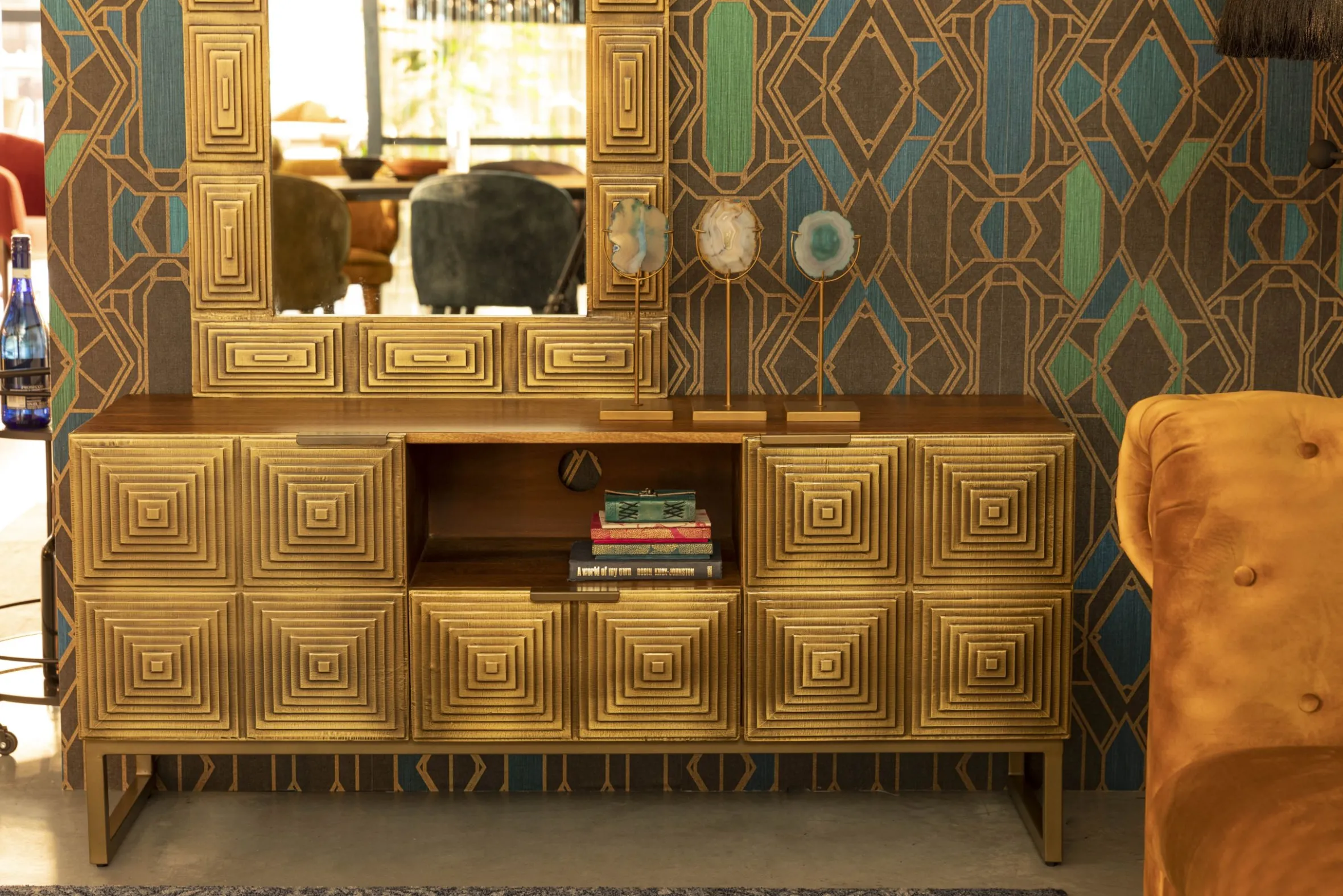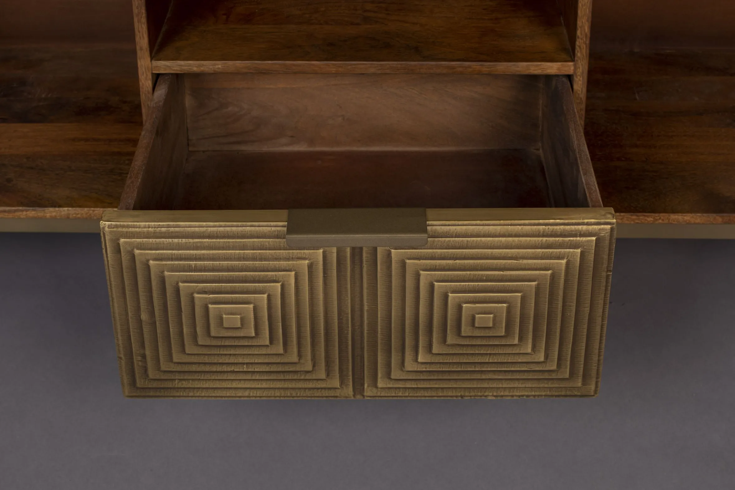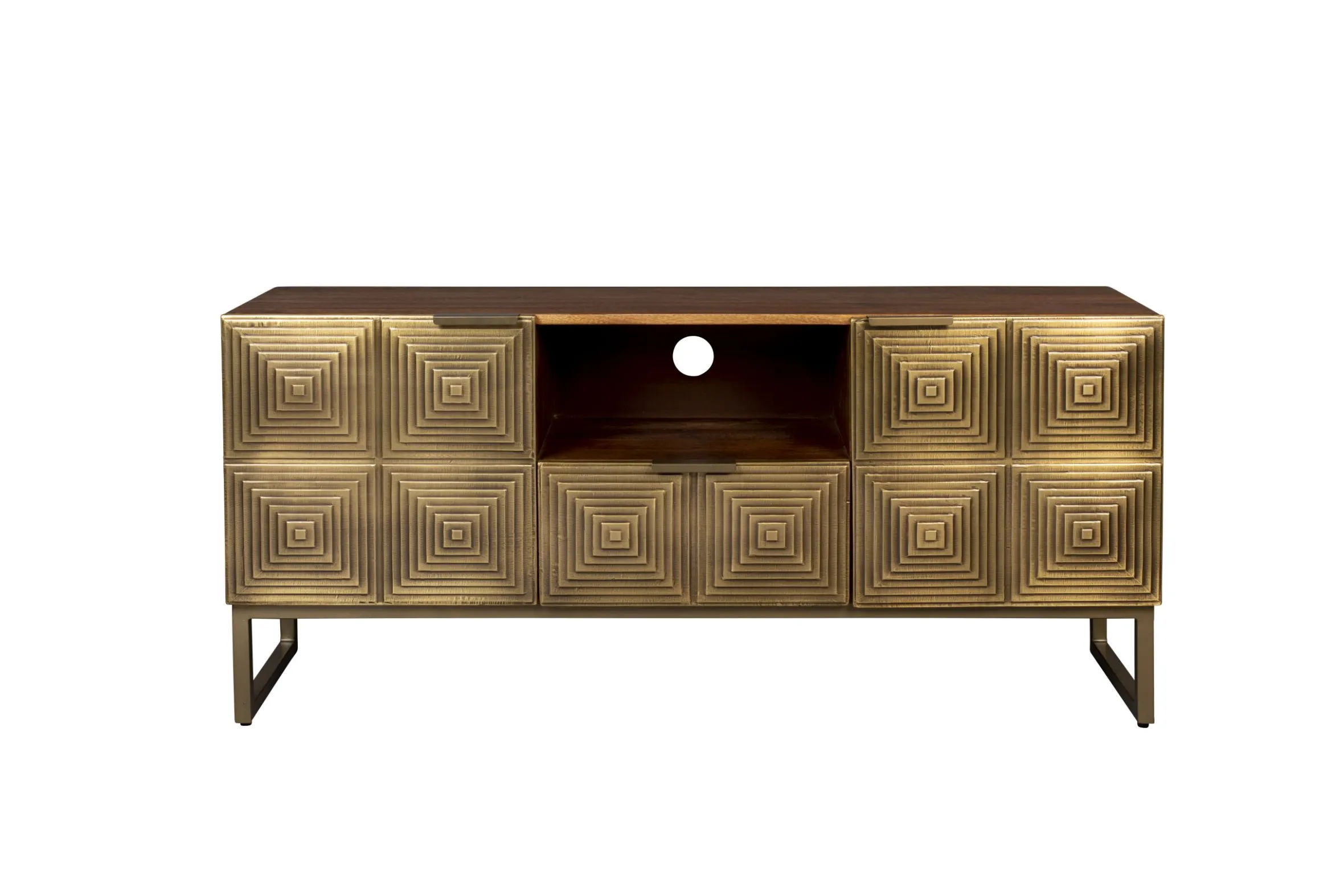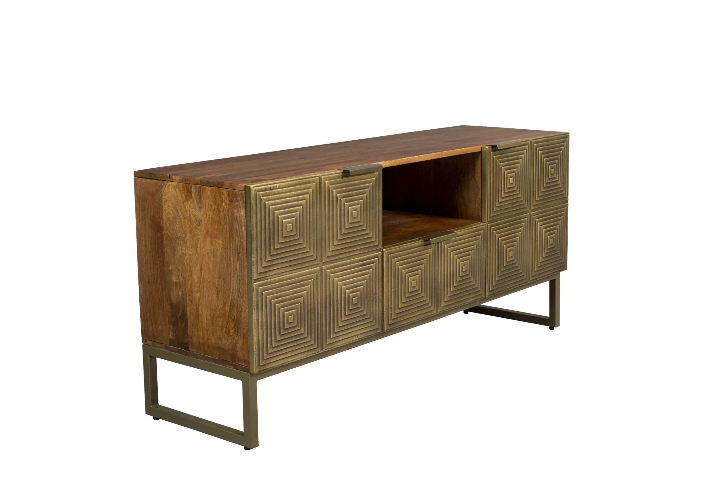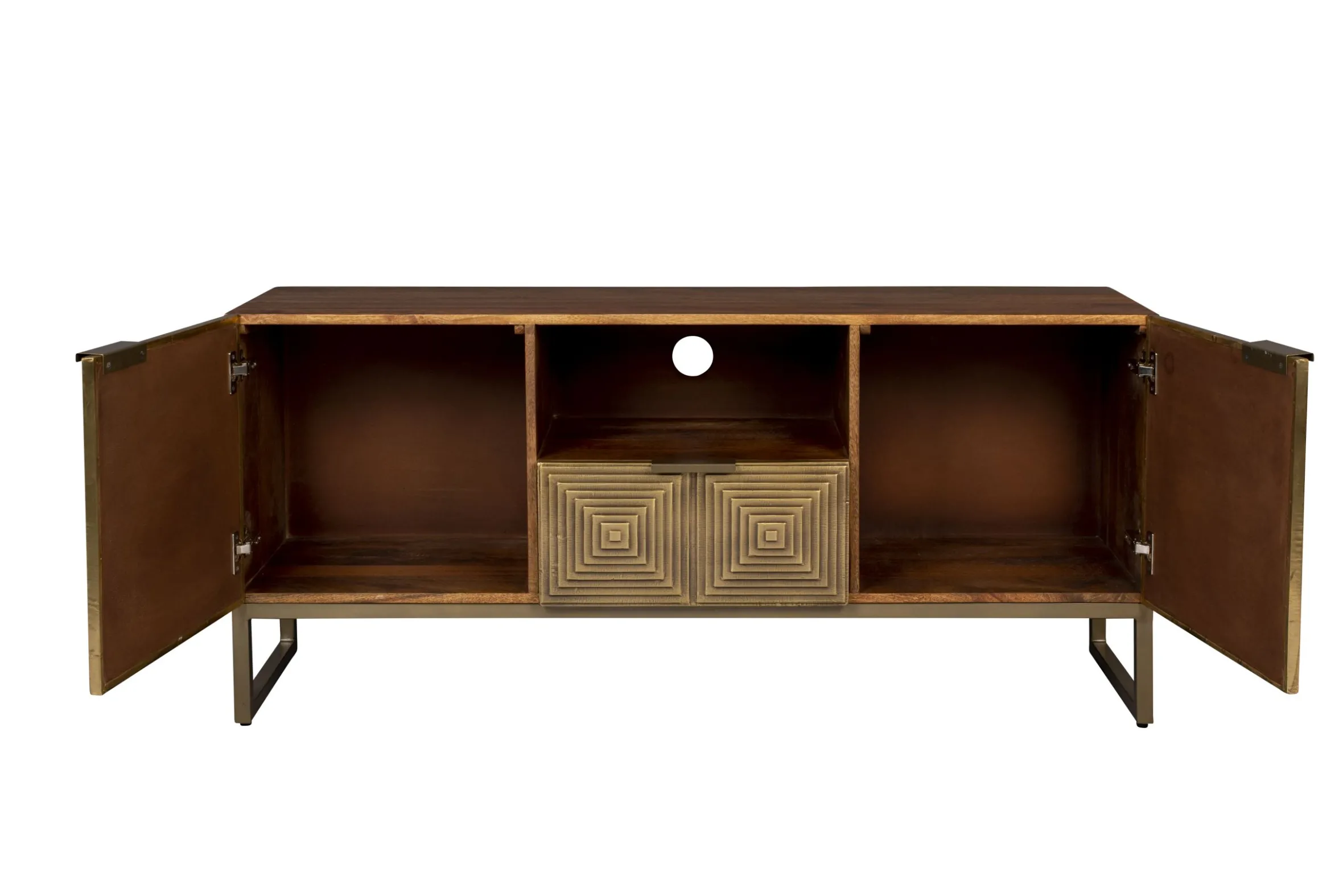 Das Volan Sideboard hat einen unverwechselbaren Art-Deco-Look. Die Serie wird in Indien handgefertigt. Als Erstes werden die Muster der Fronten von Hand in das Holz geschnitten, danach werden Platten aus antikem Messing über die Formen gehämmert. Dieser Vorgang wird von erfahrenen Handwerkern durchgeführt, die das Metall so auf das Holz hämmern, dass jede Ecke sitzt und passt. Das Ergebnis ist ein atemberaubendes Sideboard, was sich auch als TV-Board eignet. Auf der Rckseite befinden sich Öffnungen damit die Kabel durchgeführt werden können. Hinter den zwei Türen und in der Schublade finden Sie ausreichend Stauraum. Das standhafte, goldene Metallgestell rundet das Design ab. Ob als dekorative Kommode im Schlaf- oder Wohnzimmer, oder praktisch als Fernsehtisch, Volan ist ein Designstück in jedem Wohnbereich.