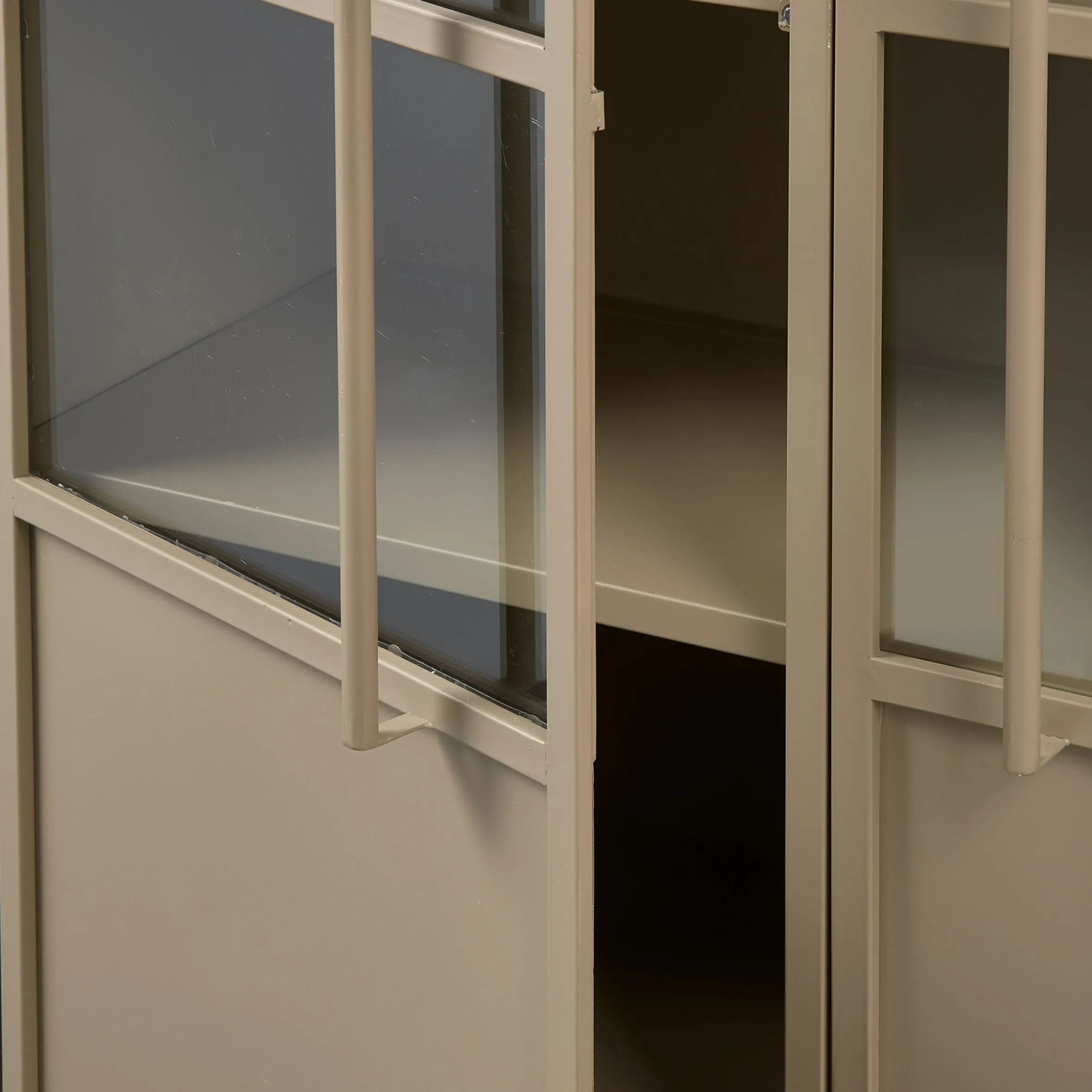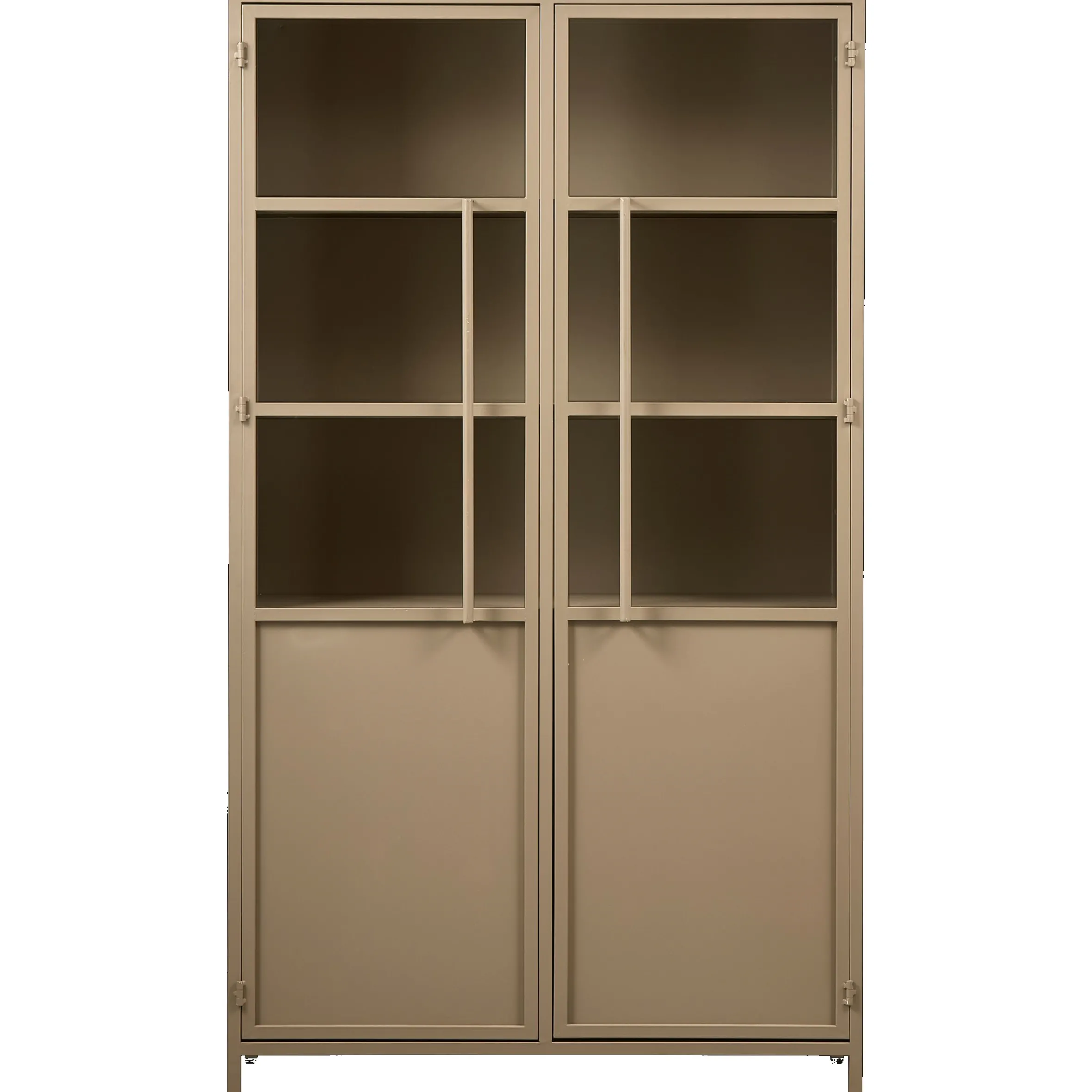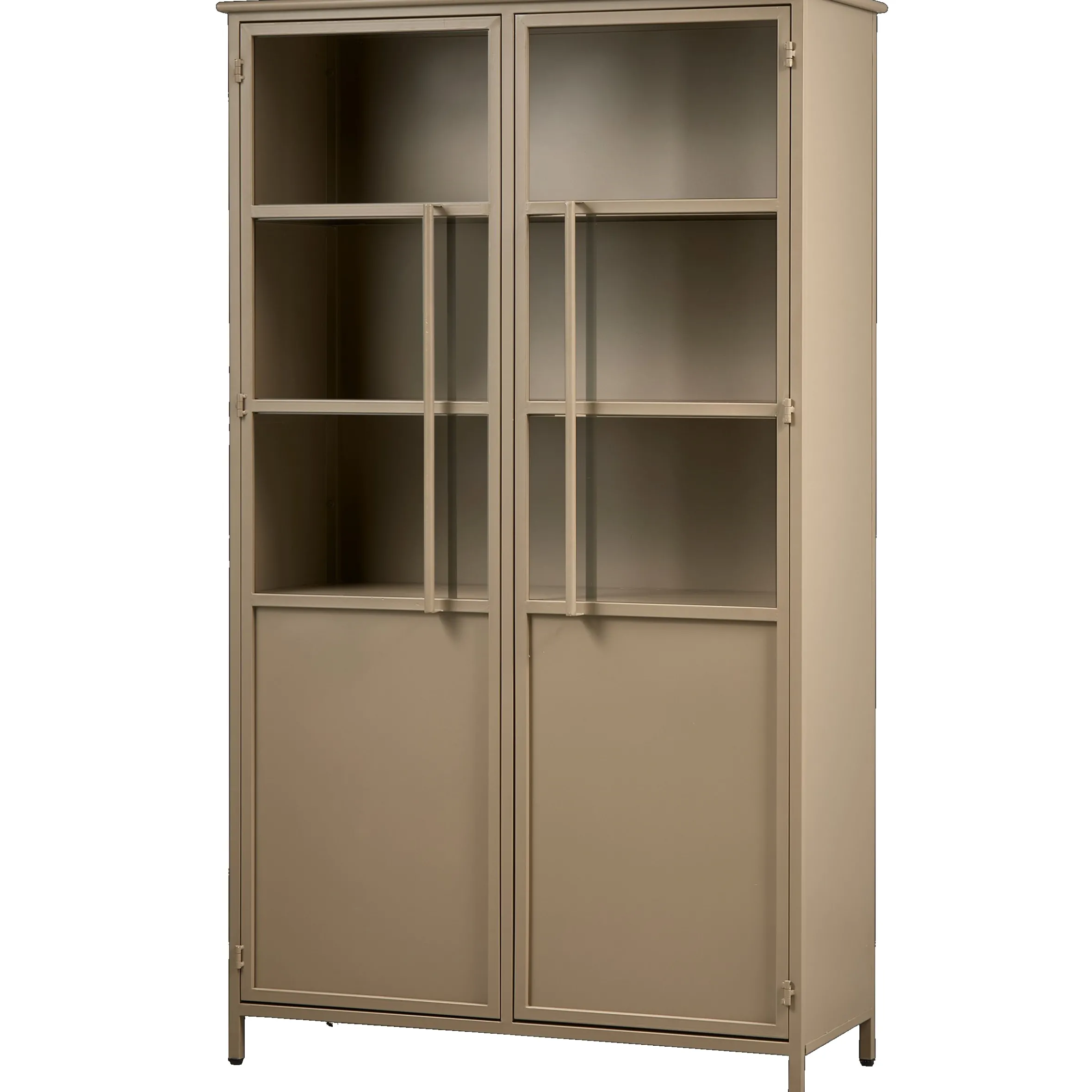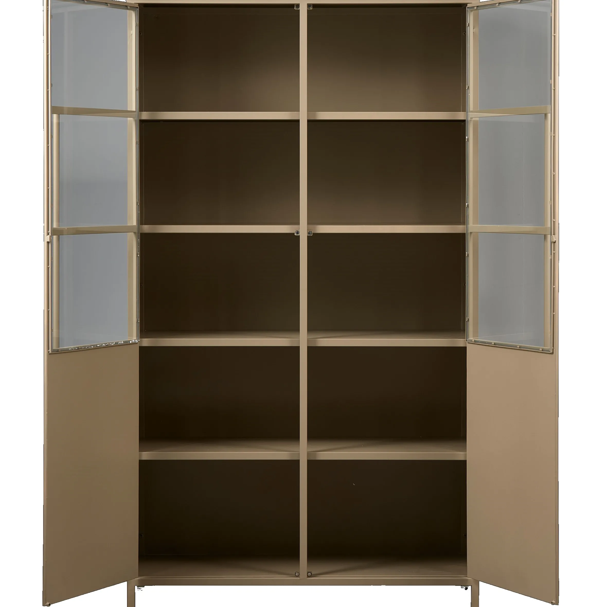 Diese robuste im industrial Style gefertigte Vitrine stammt aus der Kollektion der Firma BePureHome. Sie bietet mit fünf Fächern ausreichend Platz für Gläser, Geschirr oder ähnliches. Der Korpus ist aus khakifarbenem Eisen mit mattem Aussehen gefertigt, die Türen aus Metall mit gehärtetem Glas und einem stabilen Metallgriff. Die inneren Regale erstrecken sich über die gesamte Breite. Der Abstand zwischen den Regalen beträgt 29-31 cm, die Tragfähigkeit pro Regal 20 kg. Kleine Dellen und Schweißnähte sind gewollt und gehören zum Vintage-Look dazu.