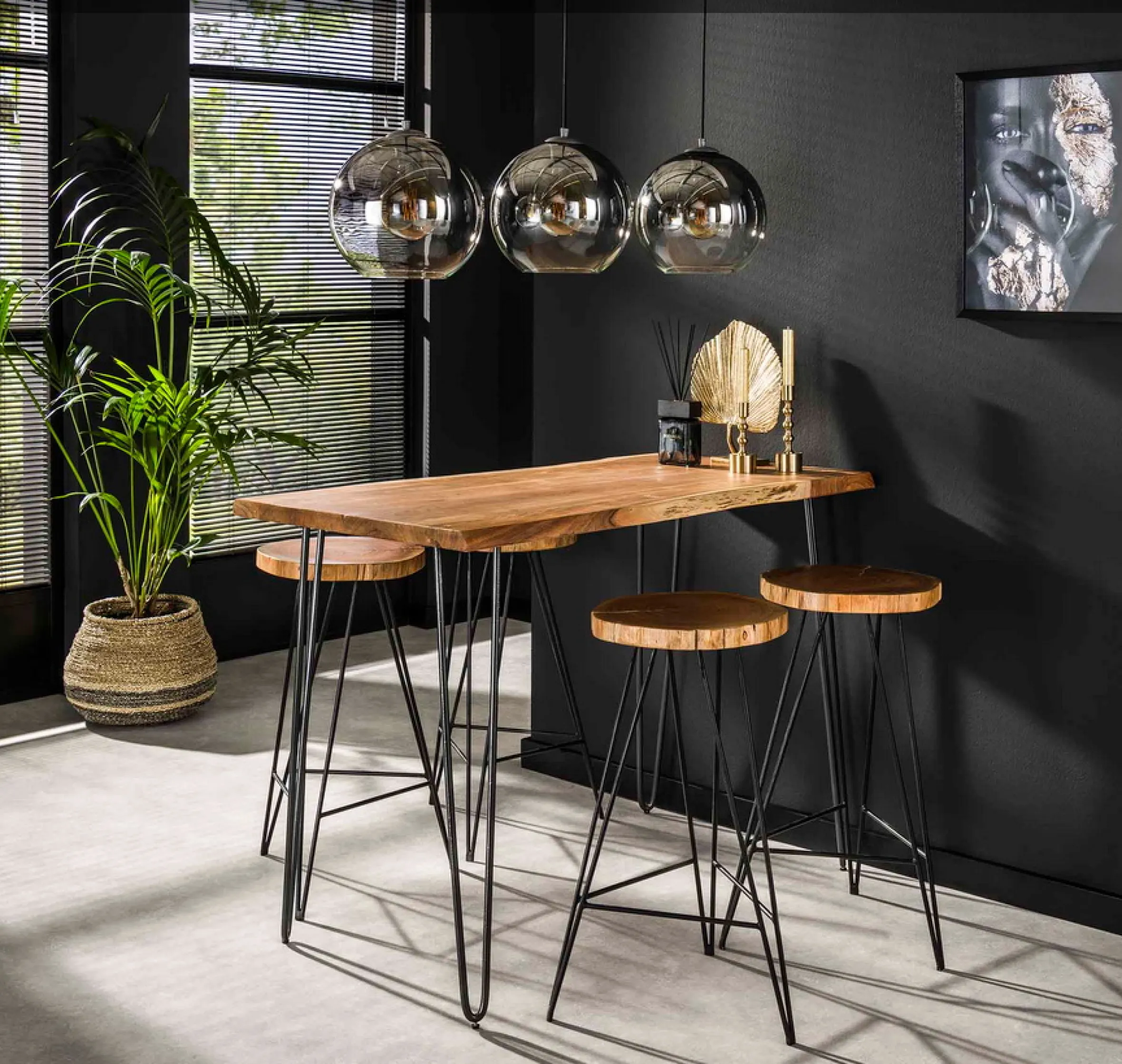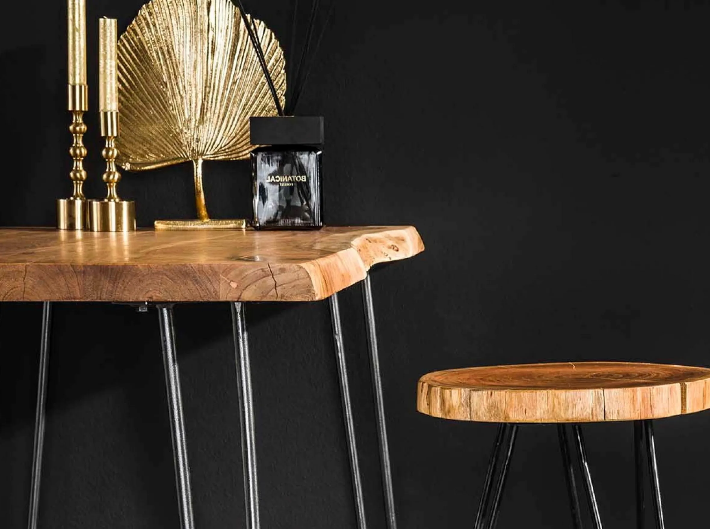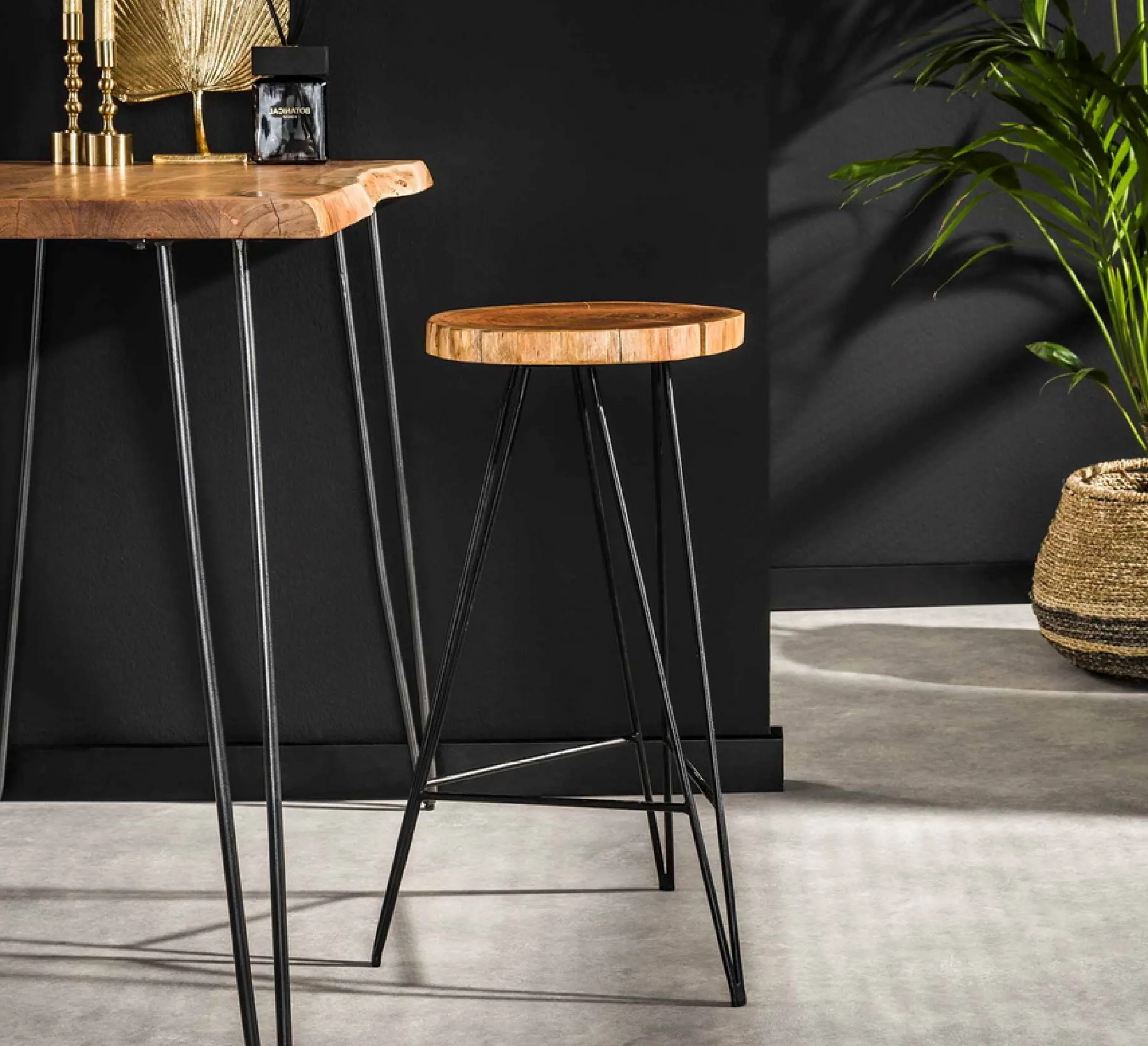 Mit seinem robusten Material und dem durchdachten Design verkörpert der Barstuhl Wood den Industrial-Look in seiner reinsten Form. Das markante Metallgestell verleiht ihm Stabilität und Charakter, während die Holzoberfläche einen warmen Kontrast schafft. Jeder Sitzfläche ist einzigartig, mit verschiedenen Einkerbungen, Spalten oder Astlöchern. Dies unterstreicht die Natürlichkeit des Materials.