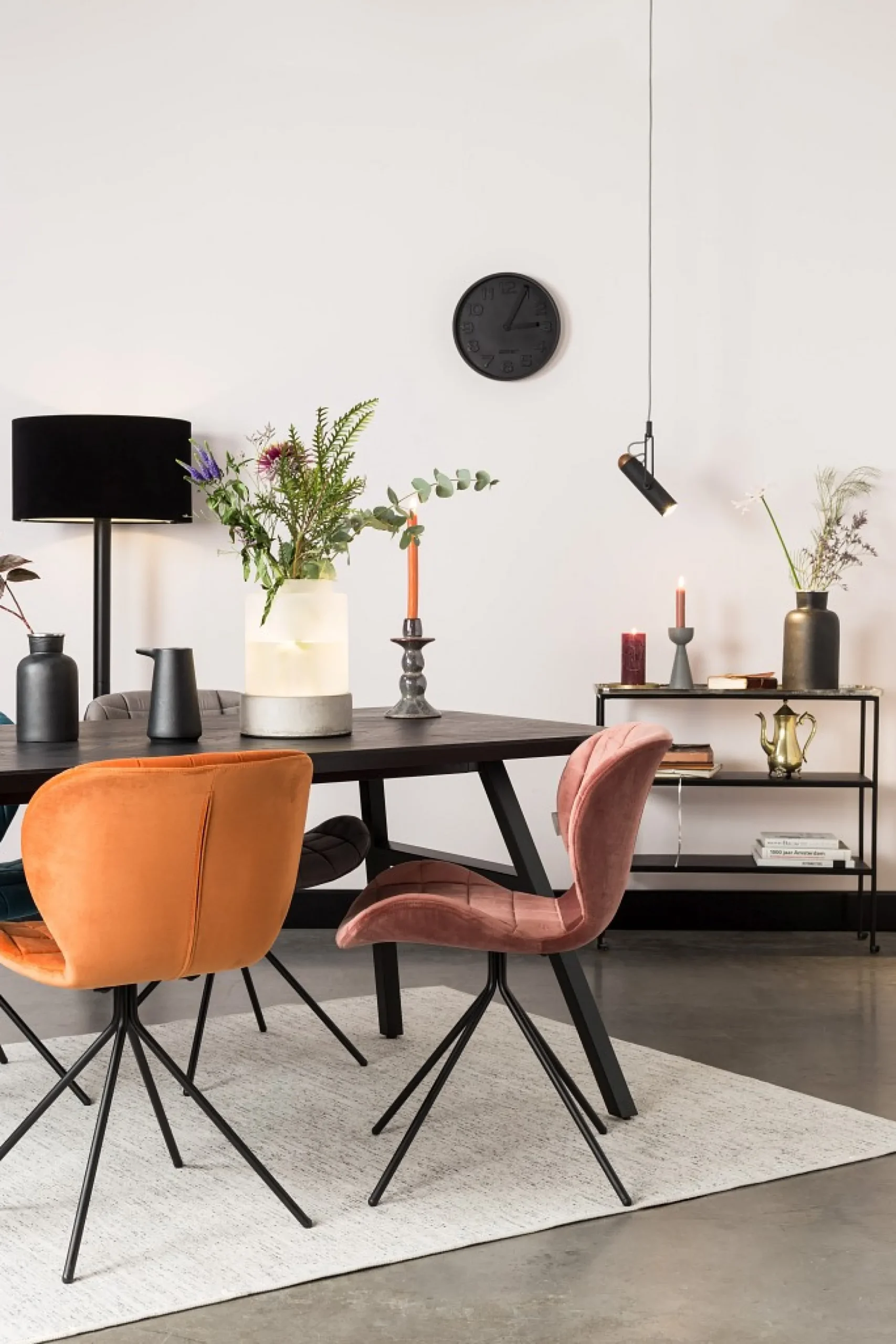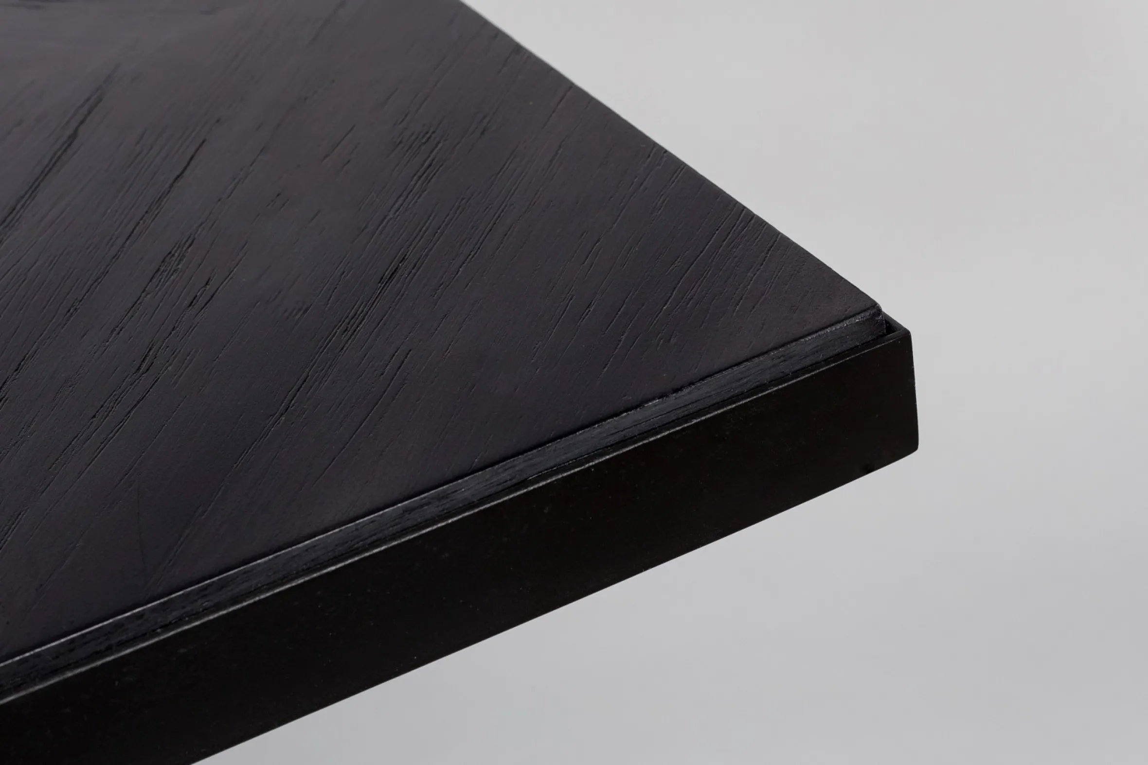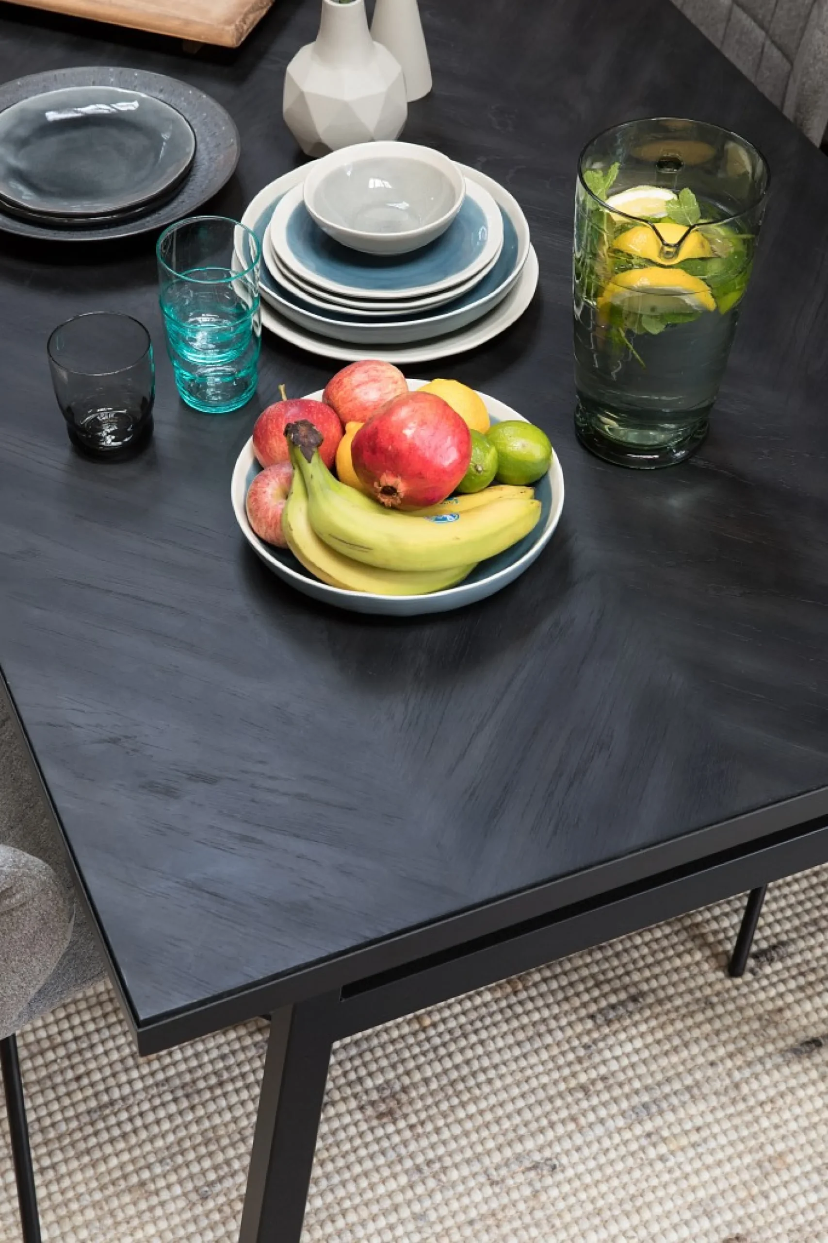Der Esstisch Seth besticht mit seiner im Parkettstil gearbeiteten Oberfläche. Die Parkettstäbe wurden hier im Fischgrätenmuster zu einer Tischplatte gearbeitet. Dies ist ein klassisches Muster, zwei Hölzer werden hier im rechten Winkel gegeneinander versetzt. Er verfügt über vier unverwechselbare Metallbeine auf denen die schwarze Holzplatte mit Parkettmuster liegt. Die Tischplatte ist mit einem schwarz lackierten Metallrahmen umsehen, was eine ausgefallene Idee des Designer ist. Der Esstisch wirkt filigran und liegt mit seiner Kombination aus Metall und Holz ganz im Trend. Das dunkle Holz lässt sich wunderbar mit hellen und bunten Stühlen kombinieren, doch auch kühle Metallstühle wirken bei dem Zuivertisch Seth ungemein gut.