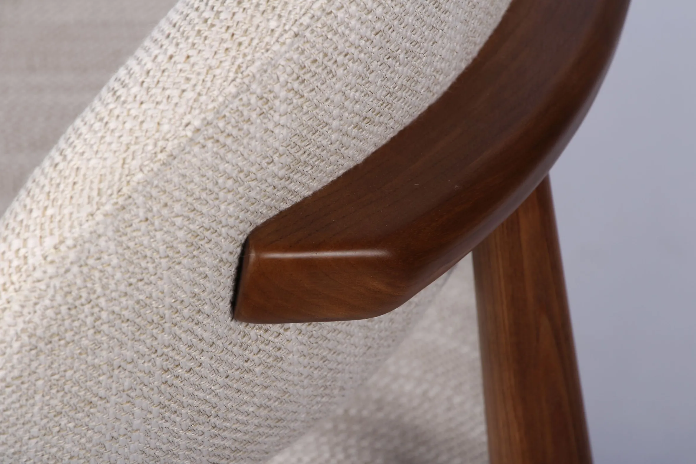 Das natürliche Holz erzählt von Beständigkeit und Wärme, während das edle Gewebe in hellem Naturton Leichtigkeit und Ruhe ausstrahlt. Zusammen entsteht eine harmonische Komposition, die jeden Raum mit Behaglichkeit erfüllt.