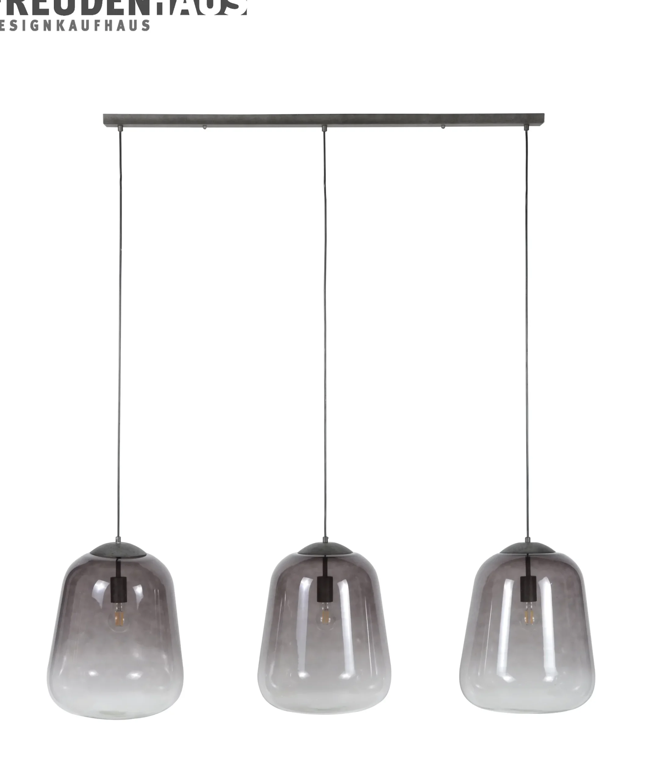 An der altsilbernen Metalleiste sind drei Glasschirme in getönter Färbung befestigt. Der Farbverlauf und Form der Schirme begünstigt eine besondere und gleichmäßige Lichtverteilung. Durch Beschaffenheit und Färbung des Glases erhält das Licht eine warme und wohnliche Note. Die Hängelampe Bulb Shaded XL bringt edles Wohndesign in Ihr Zuhause. Kleine Lufteinschlüsse im Glas können vorkommen und sind bei der Produktion nicht zu vermeiden, sie sind wie Schönheitsflecken anzusehen. Der Tisch sollte mindestens 2 Meter Länge haben, die Lampe ist 150 cm breit. Wird sonst eng an den Kopfseiten.
