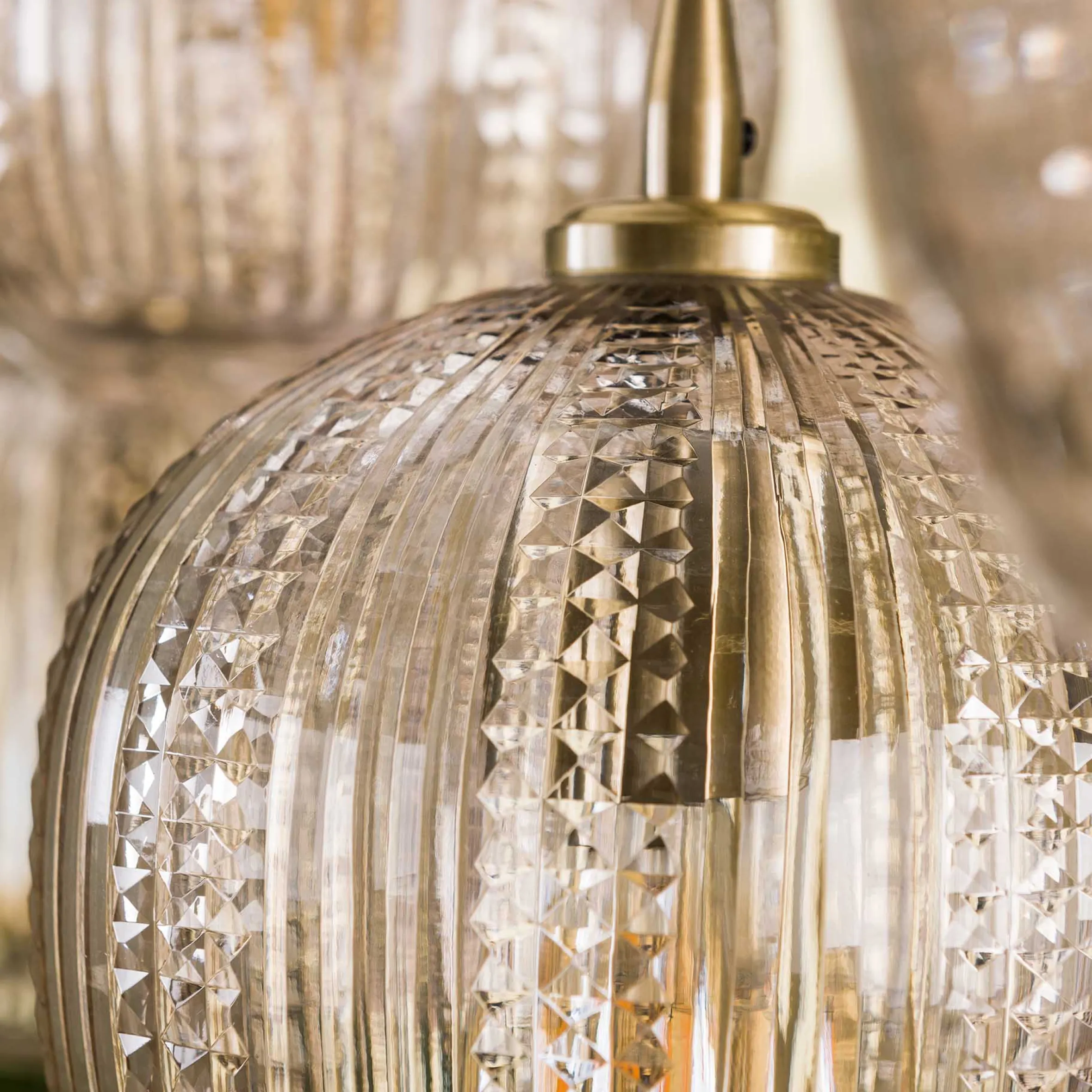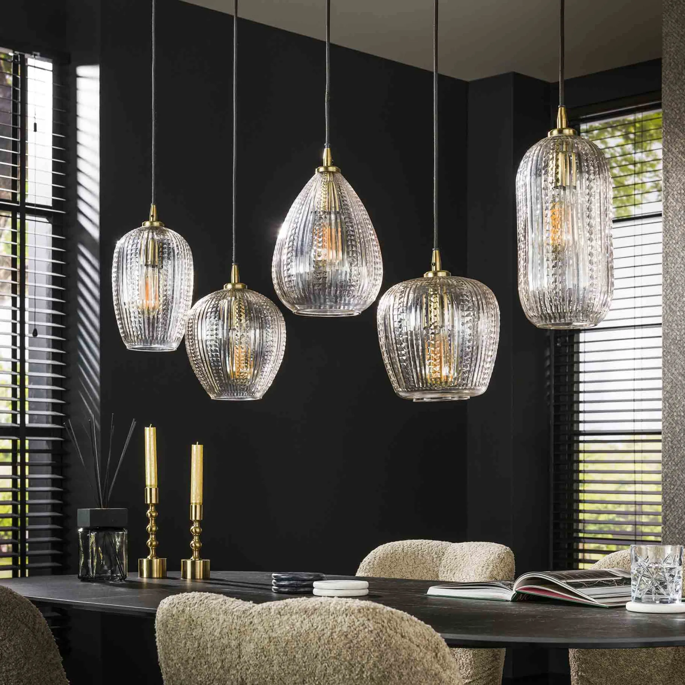 Die Pendelleuchte Diamant ist eine wunderschön gestaltet Lampe die mit ihren fünf Schirmen für ein raumgreifendes Beleuchtungsszenario sorgt. Dank des verschieden geriffelten Glases wird der Raum schön und ansprechend durch die eleganten Lampenschirme beleuchtet. Das Glas ist mundgeblasen, also handgefertigt. Das macht jedes Glas einzigartig und deswegen sind kleine Unebenheiten und Luftblasen unvermeidlich. Es sind die kleinen Unterschiede, die jedem Glas seinen eigenen Look und Charme verleihen.