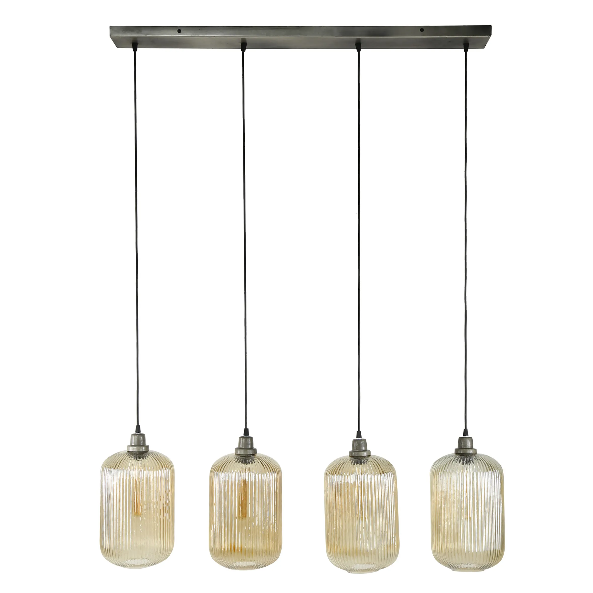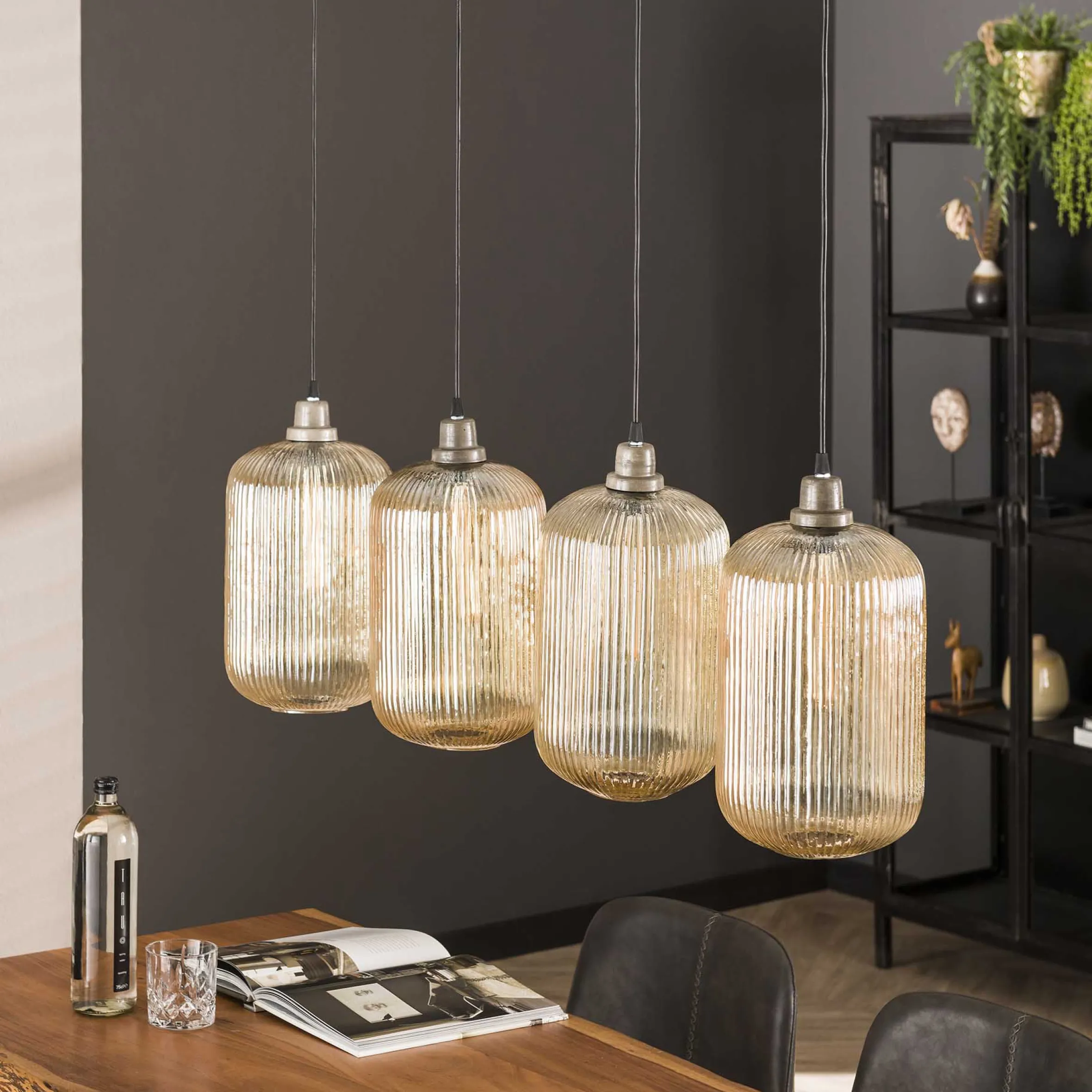 Die Pendelleuchte Retro Stripes ist eine wunderschön gestaltet Lampe die mit ihren vier Schirmen für ein raumgreifendes Beleuchtungsszenario sorgt. Dank des bernsteinfarbenen Glases wird der Raum schön und ansprechend durch die eleganten Lampenschirme beleuchtet. Die Schirme sind individuell bis zu 150 cm höhenverstellbar. So lässt sich die Lampe spielerisch nach eigenem Ermessen arrangieren. Das Glas ist mundgeblasen, also handgefertigt. Das macht jedes Glas einzigartig und deswegen sind kleine Unebenheiten und Luftblasen unvermeidlich. Es sind die kleinen Unterschiede, die jedem Glas seinen eigenen Look und Charme verleihen.