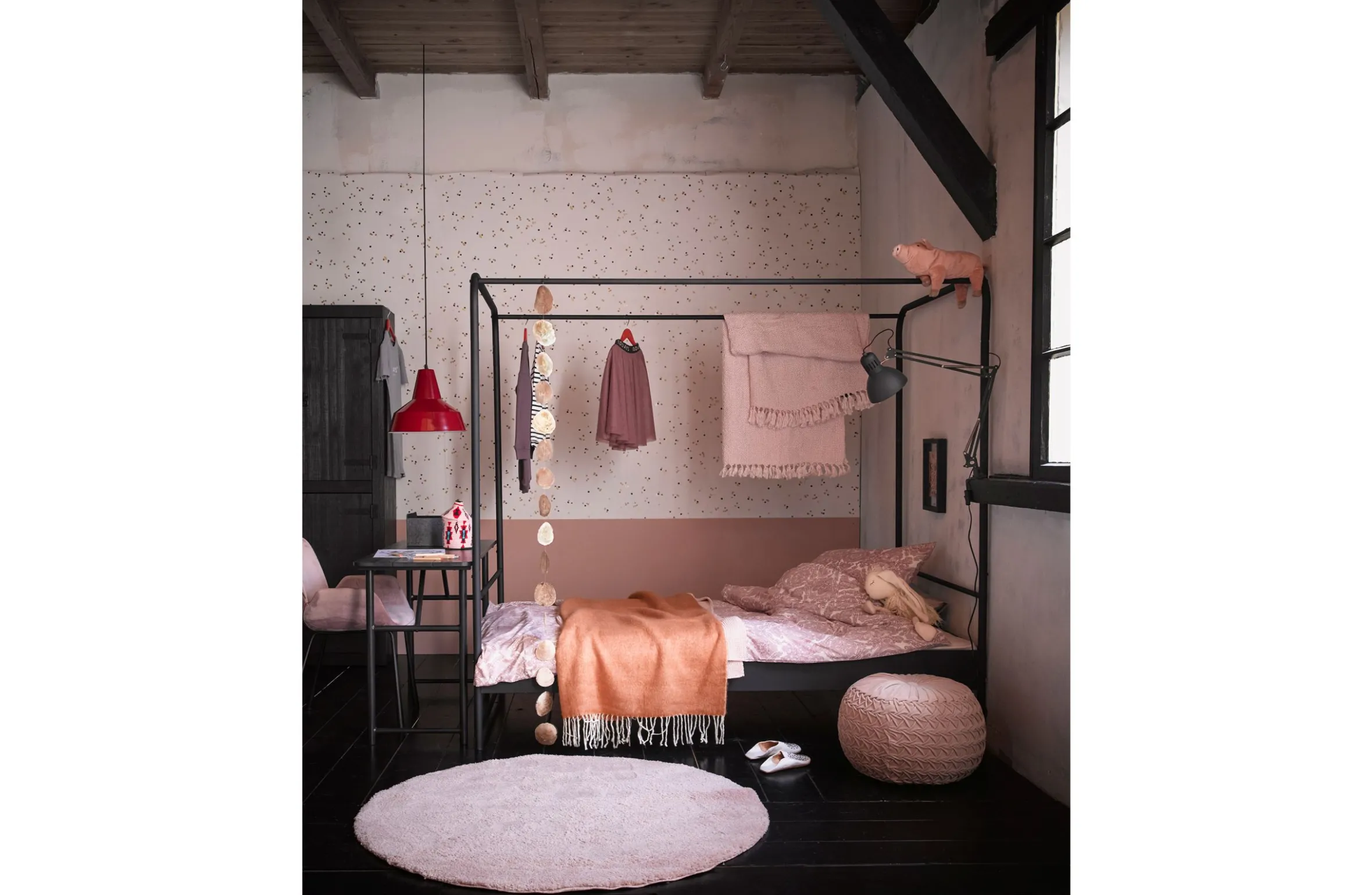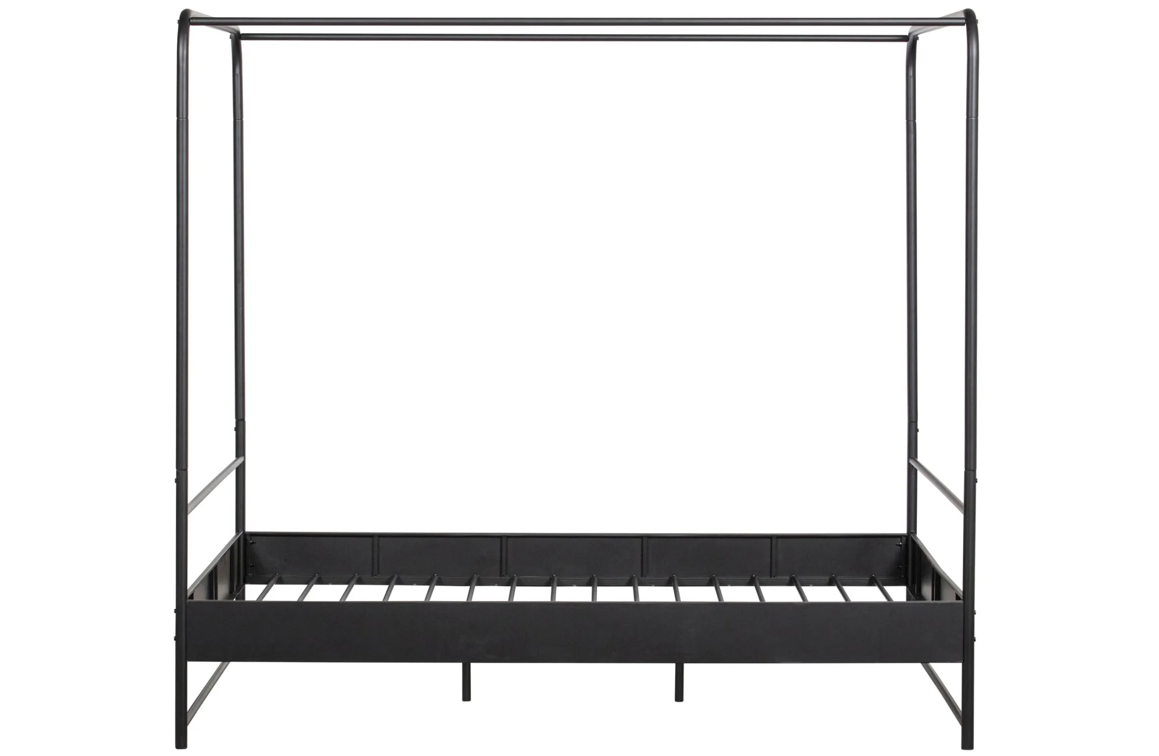 Das Metallbett Koje stellt die moderne Variante eines Himmelbettes dar, ganz schlicht und puristisch. Mit der passenden Dekoidee können Sie Ihrem Schlafzimmer aber ganz schnell einen persönlichen Touch verleihen und das Bett individuell gestalten. Das Bett ist aus pulverbeschichtetem Metall und hat einen Stahllattenrost. Das Gestell ist abgerundet, was dem Look etwas verspieltes gibt. Die Schlichtheit des Designs des Bettes sorgt für einen vielseitig kombinierbaren Stil.