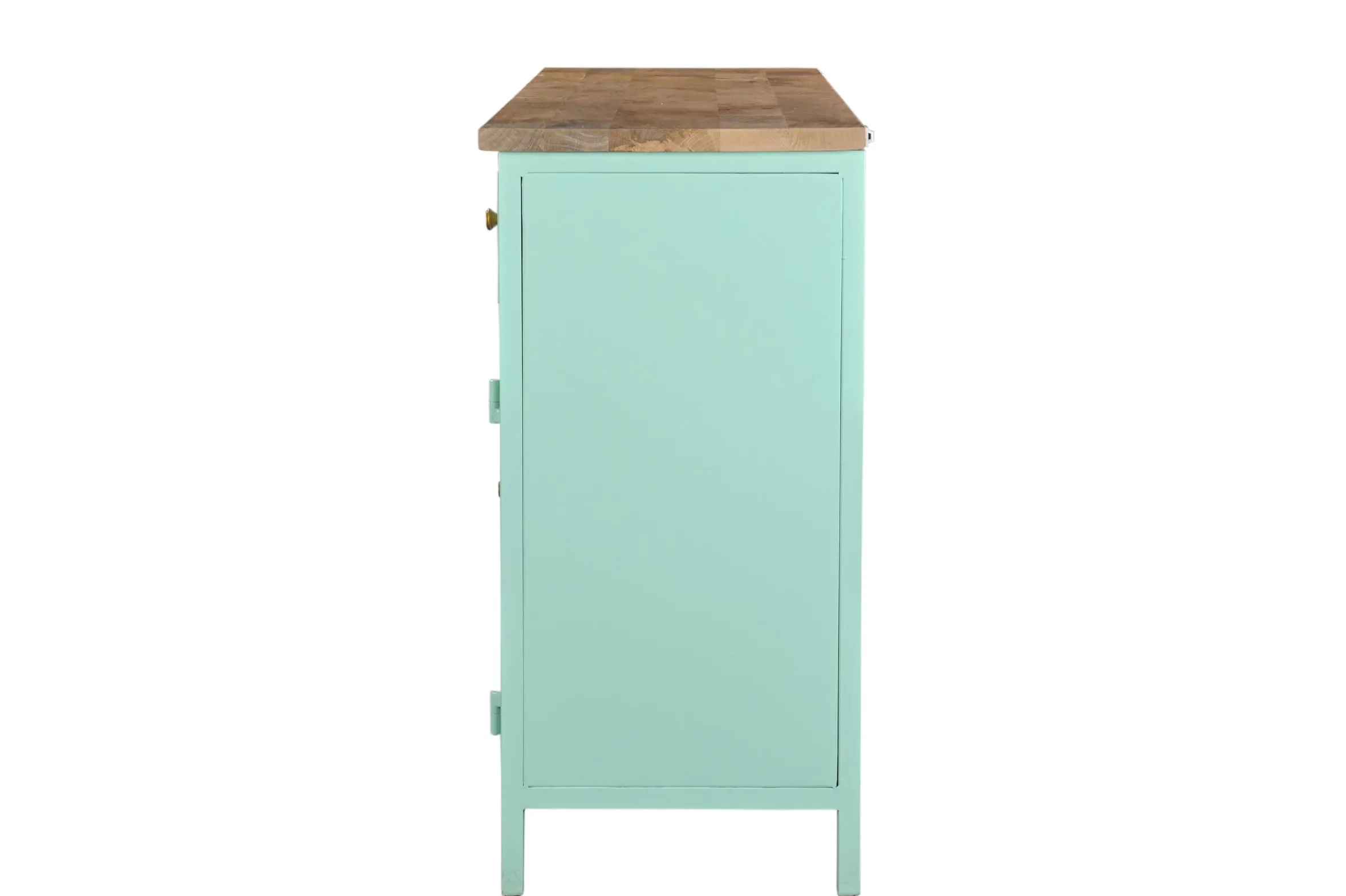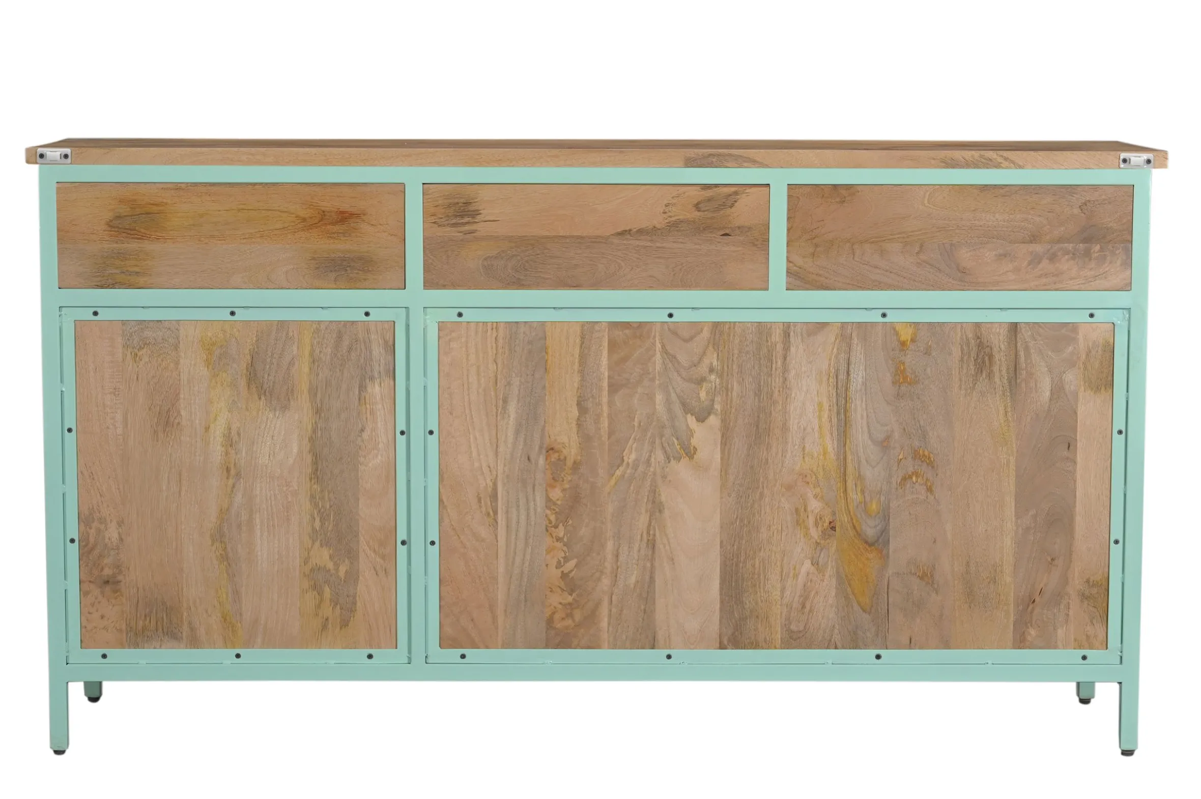 Das Sideboard Provence ist ein wahr gewordener Retro-Traum aus Metall, Holz und Glas! Es entfaltet seine besondere Raumwirkung durch das gekonnte Zusammenspiel von Farben und Materialien. Der Korpus ist komplett aus Metall, das Innenleben aus wunderschön gemasertem Mangoholz. Die zahlreichen Glaselemente verleihen eine außergewöhnliche Transparenz. Neben der großzügigen Ablagefläche begeistert der Vitrinenschrank als Showbühne für Ihre Bücher, Weingläser, Porzellan oder Wohnaccessoires. Zusätzlichen Stauraum bieten die drei Schubladen. Abgerundet wird das Ganze mit goldenen Griffen. Und der ganz große Auftritt ist dank der Farbgebung garantiert sicher!