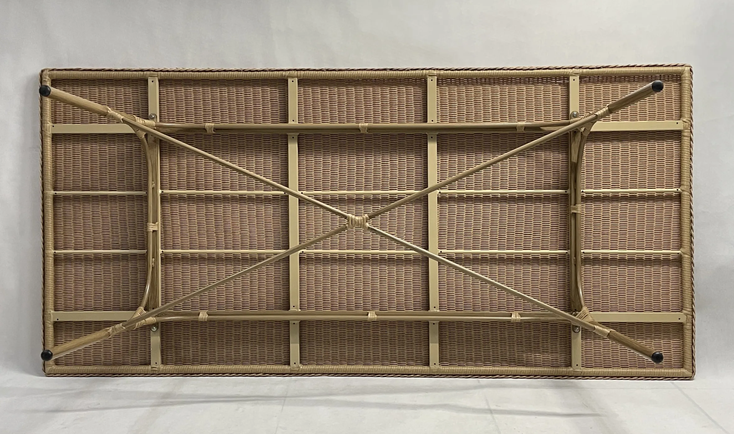 Großer Esstisch mit toller geflochtener Tischplatte im skandinavischem Design, der sowohl drinnen wie draußen Urlaubsgefühle aufkommen lässt! Die gekonnt geflochtenen Polyethylenseile in täuschend echter Rattanoptik formen den Tisch zu einem Hingucker der ideal zu unseren Cabana Stühlen und Sesseln passt. Die stabilen lackierten Metalleine geben dem Tisch den Stand. Die ausladende Tischplatte eignet sich für viele Dekorationmöglichkeiten und gibt natülich Platz für 8 bis 10 Gäste.