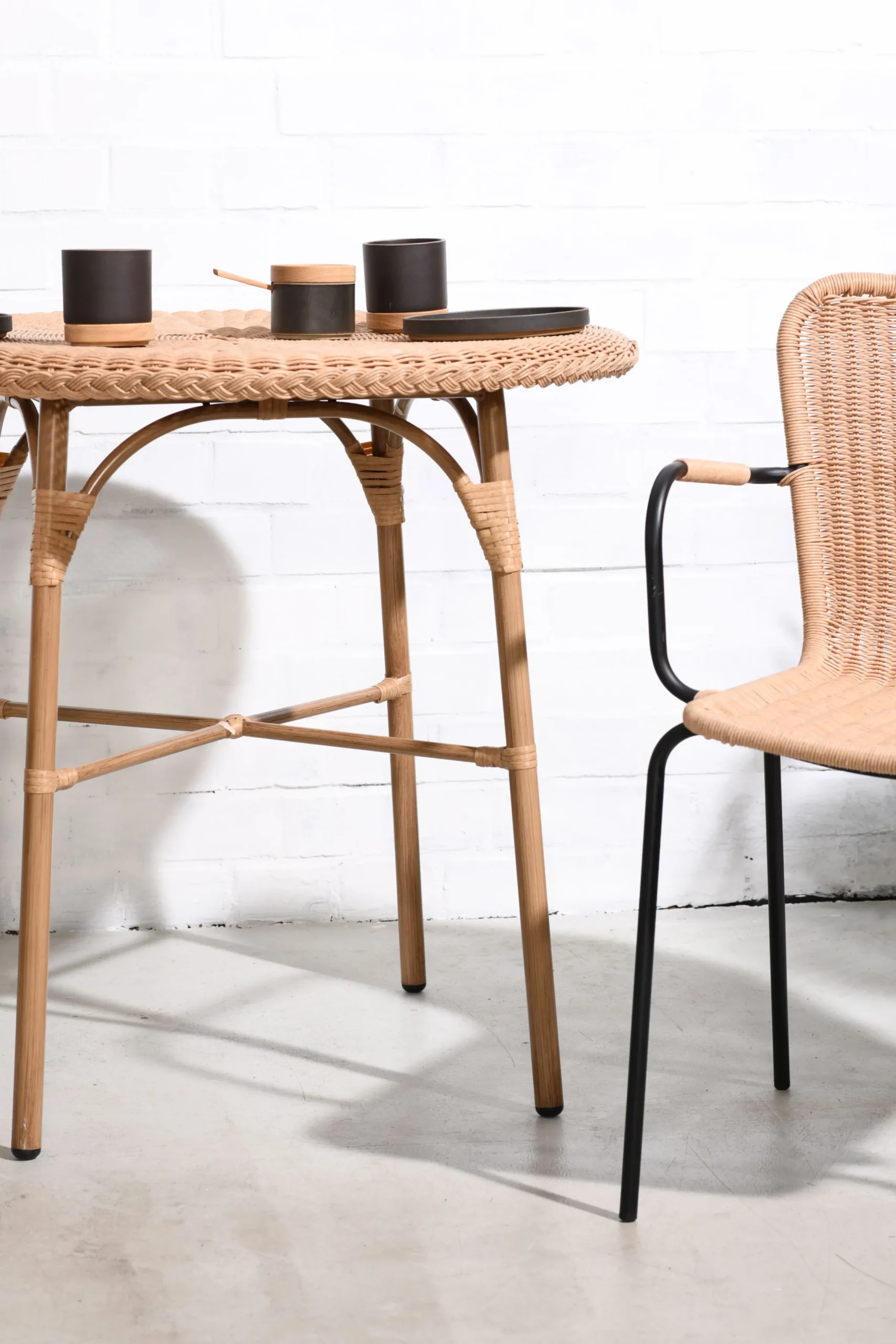 Runder Esstisch mit toller geflochtener Tischplatte, der sowohl drinnen wie draußen ein Urlaubsgefühle aufkommen lässt! Die gekonnt geflochtenen Polyethylenseile in toller Rattanoptik formen den Tisch zu einem Hingucker der ideal zu unseren Cabana Stühlen und Sesseln passt. Die stabilen lackierten Metalleine geben dem Tisch den Stand. Die engmaschige Flechtung ist eine aufwendige Handarbeit die viel Zeit benötigt. Das Ergebnis ist ein hochwertiges Möbel im angesagten Scandi Boho Stil.