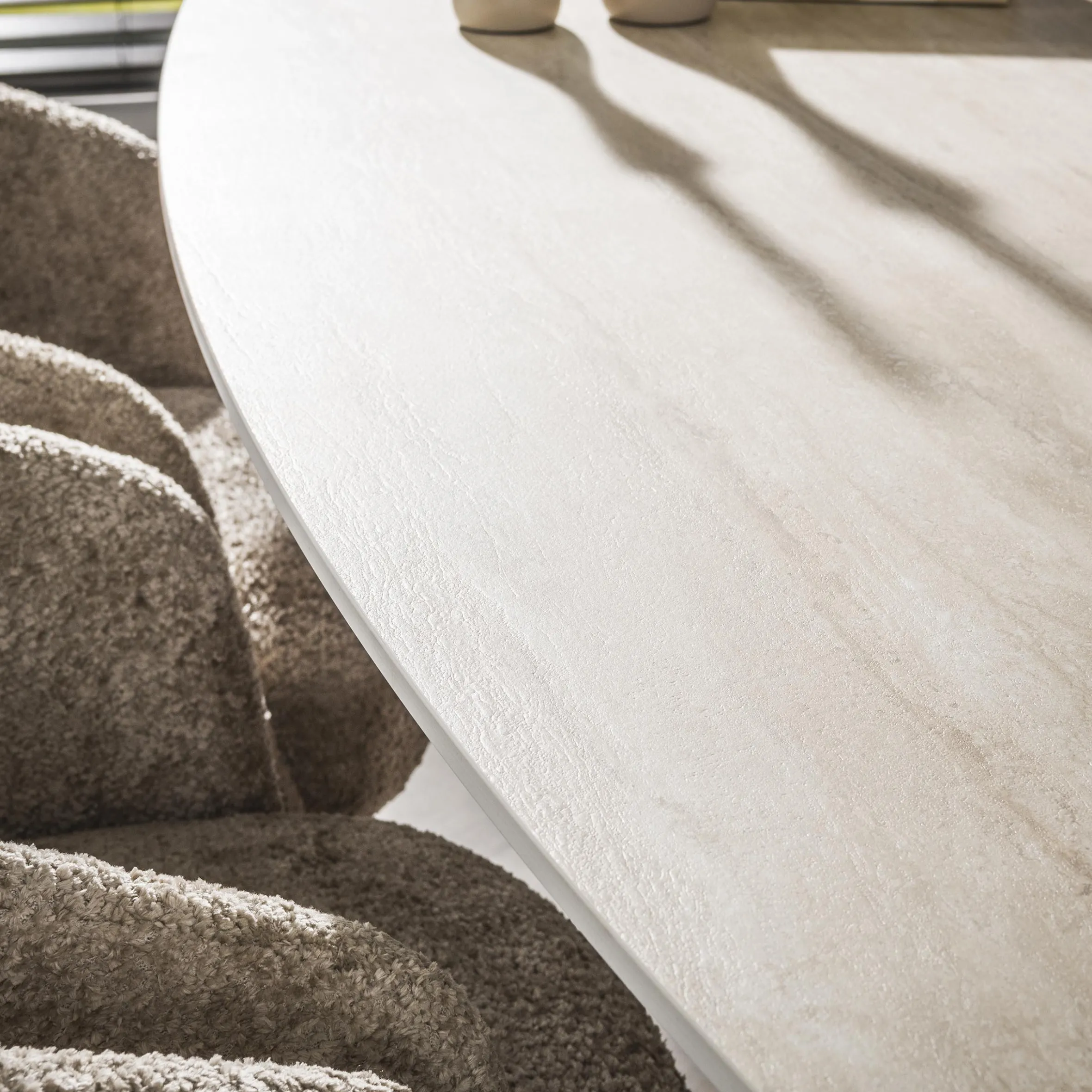Ein Esstisch, der mehr ist als ein Möbelstück – er ist eine Hommage an die Kunst des Wohnens. Die edle Tischplatte aus einem erlesenen Keramik-Travertin-Gemisch entfaltet ihre natürliche Raffinesse in feinen, sanft schimmernden Nuancen. Ihre glatte, kühle Oberfläche fängt das Licht auf subtile Weise ein und verleiht dem Raum eine Aura von Ruhe und Exklusivität. Das Material ist kratzfest, schmutzabweisend und hitzebeständig und eignet sich daher ideal für intensive Nutzung ohne besondere Pflege.