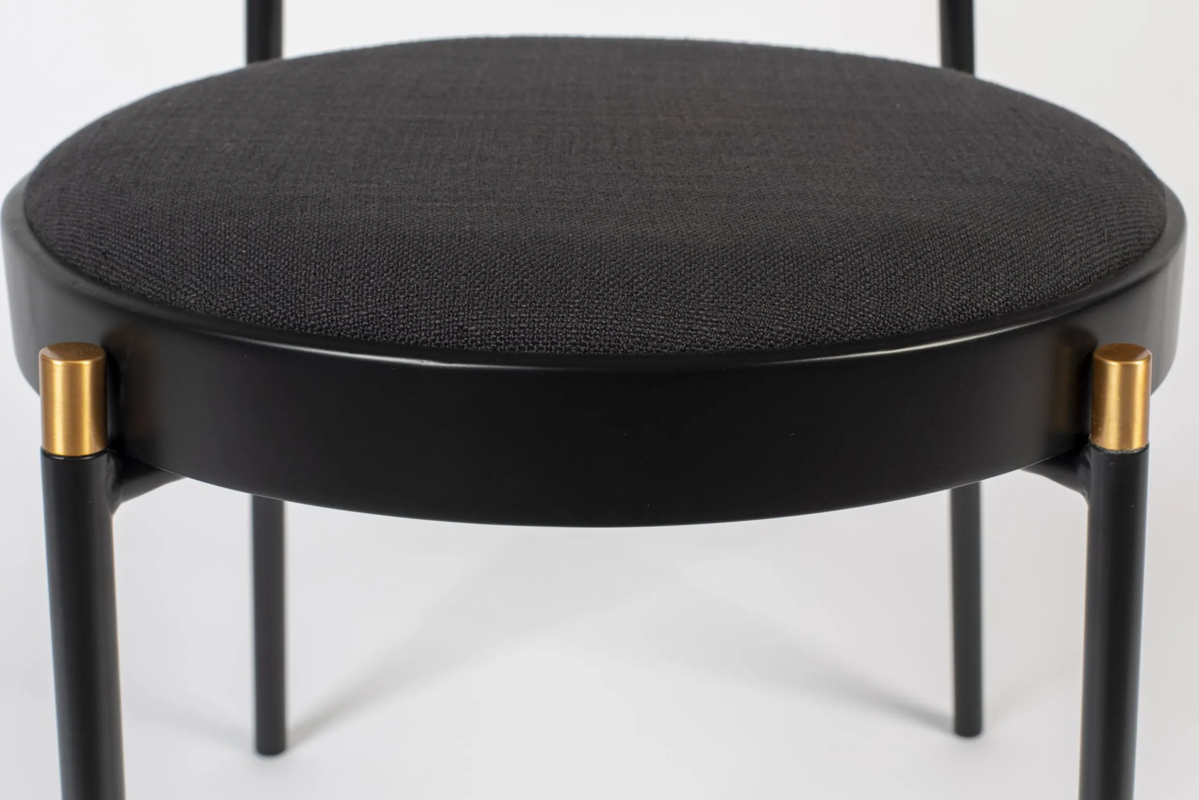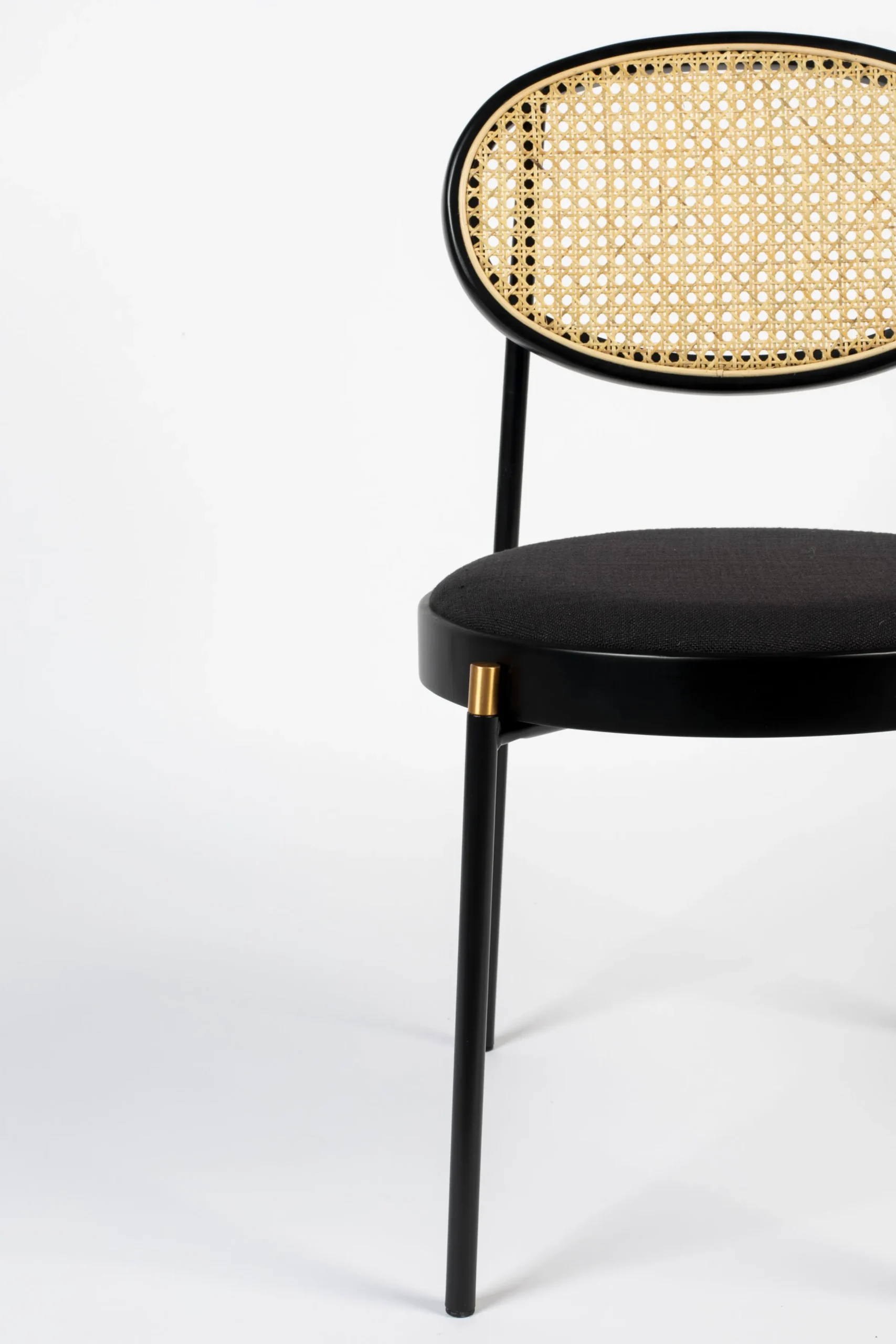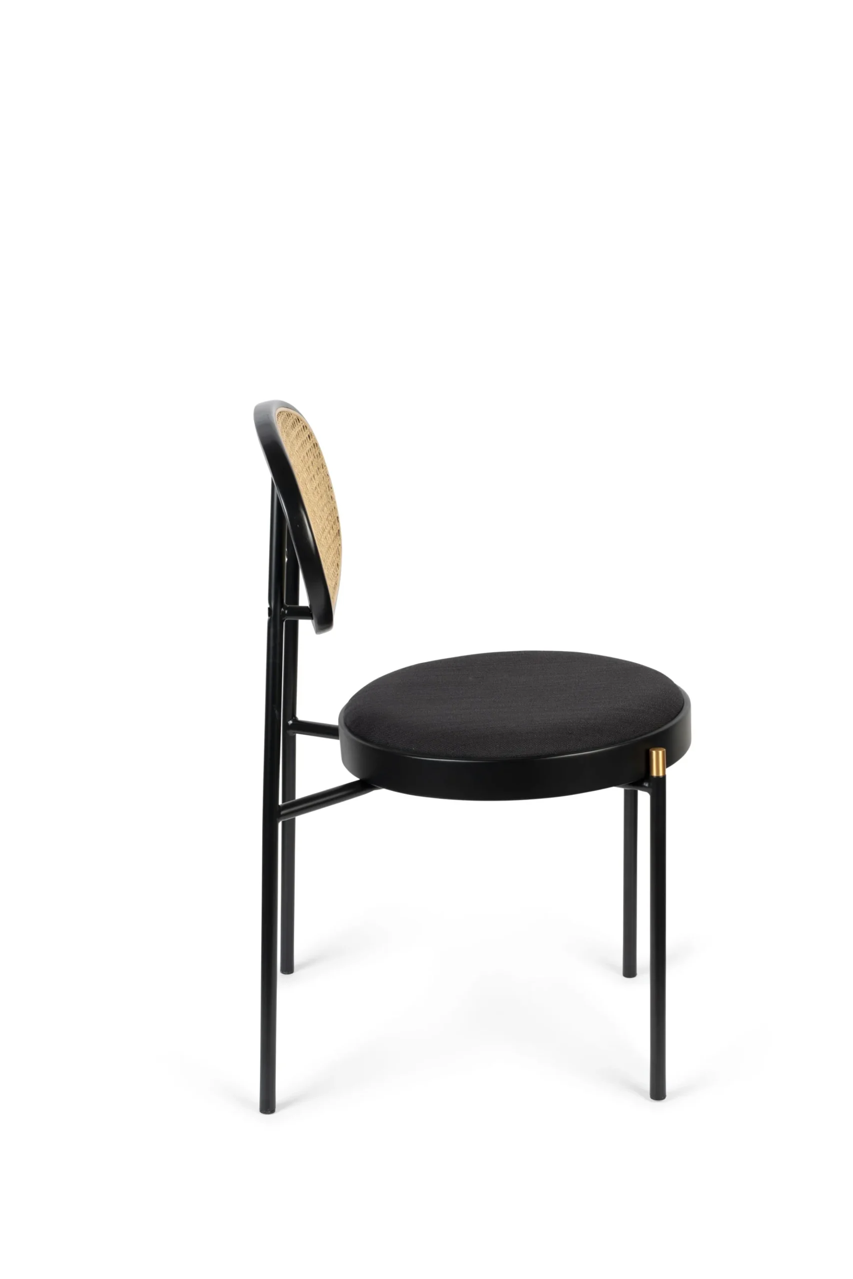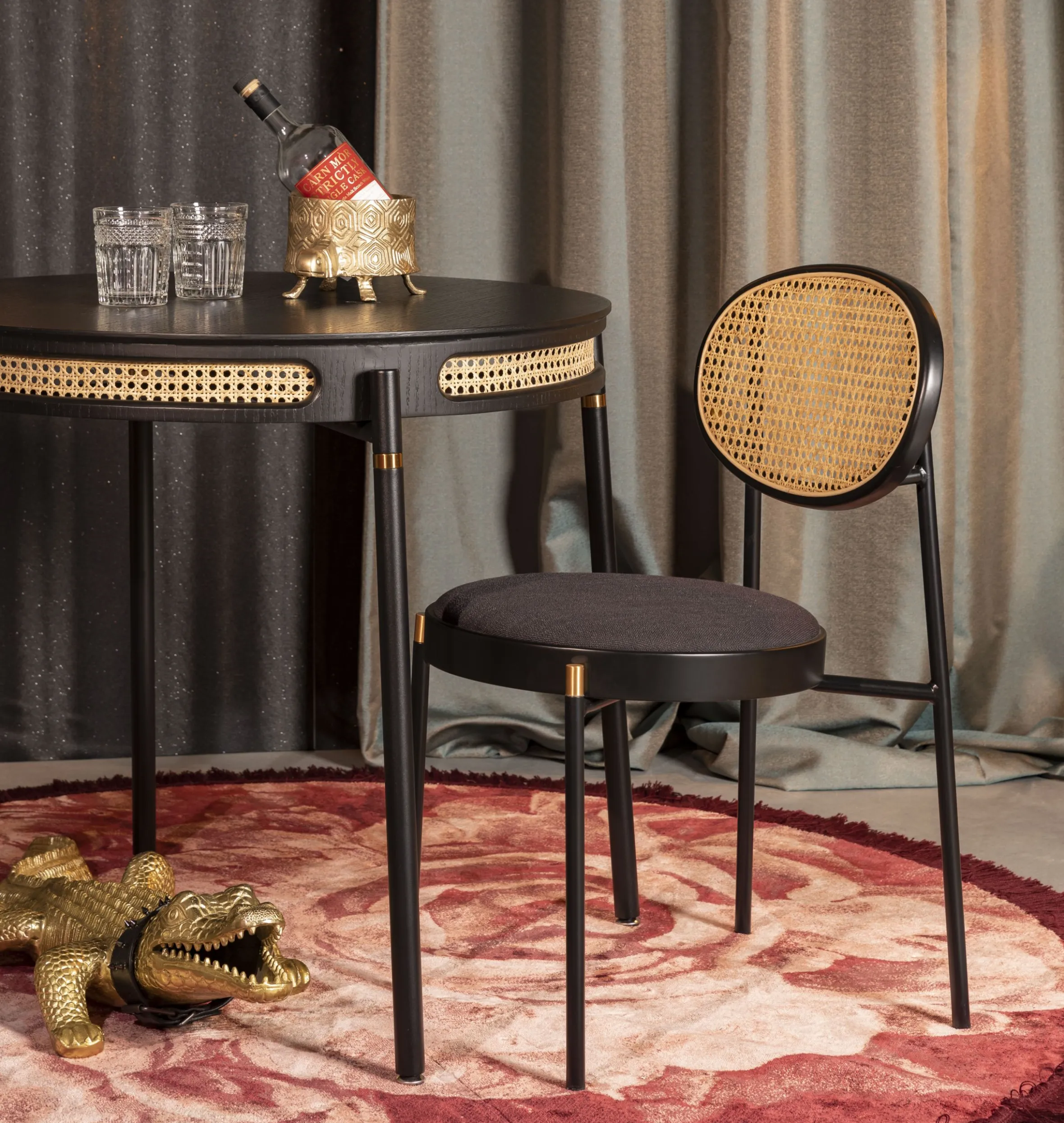 Neutrale Beigetöne gepaart mit schwarz lackiertem Buchenholz sind die perfekte Kombination für Liebhaber von minimalem Design. Das Zusammentreffen des leicht retromäßigen Rattans mit den eleganten Kurven des Stuhldesigns würde jeden Liebhaber von Mid-Century-Möbeln ansprechen. Dank der klaren Linien und der klassischen Details mit Goldspitzen ist dies ein Esszimmerstuhl, der an jedem Tisch willkommen ist.