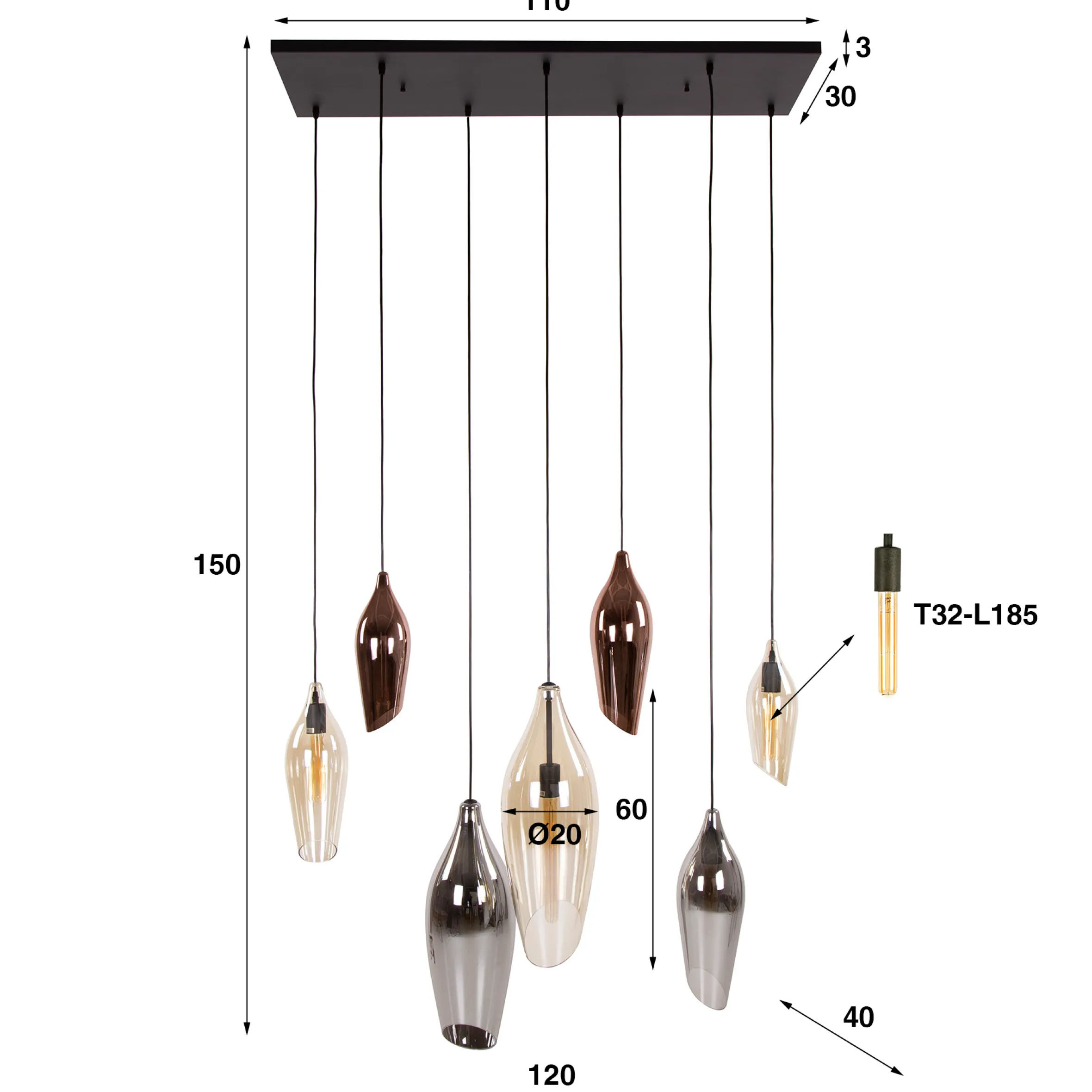 Diese exklusive Hängelampe mit 7 kokonförmigen Glasschirmen verleiht jedem Raum eine stilvolle und moderne Atmosphäre. Die Schirme sind in drei edlen Farben gehalten: Bernstein, Kupfer und Chrom, die ein harmonisches und zugleich dynamisches Farbspiel erzeugen.