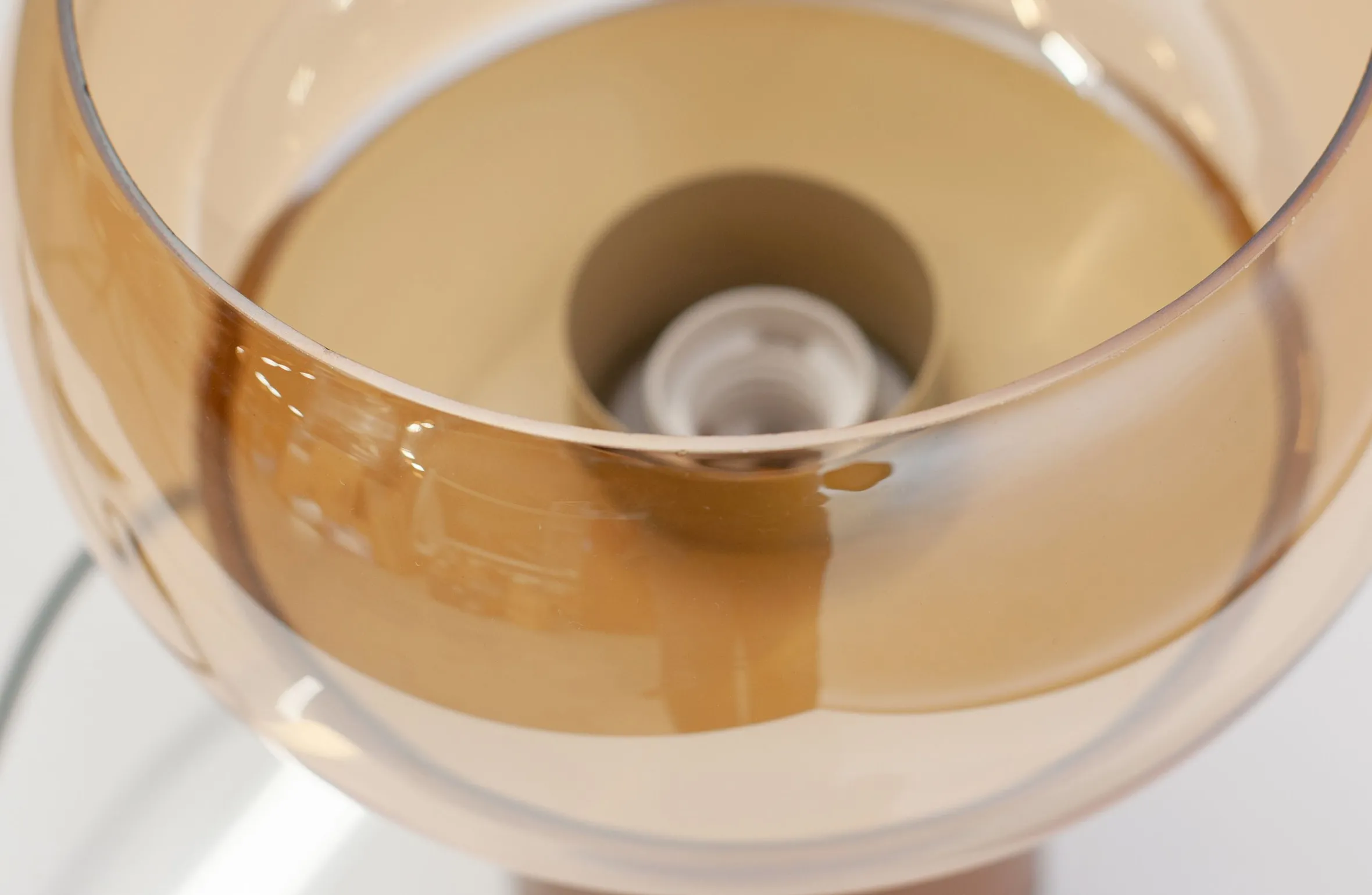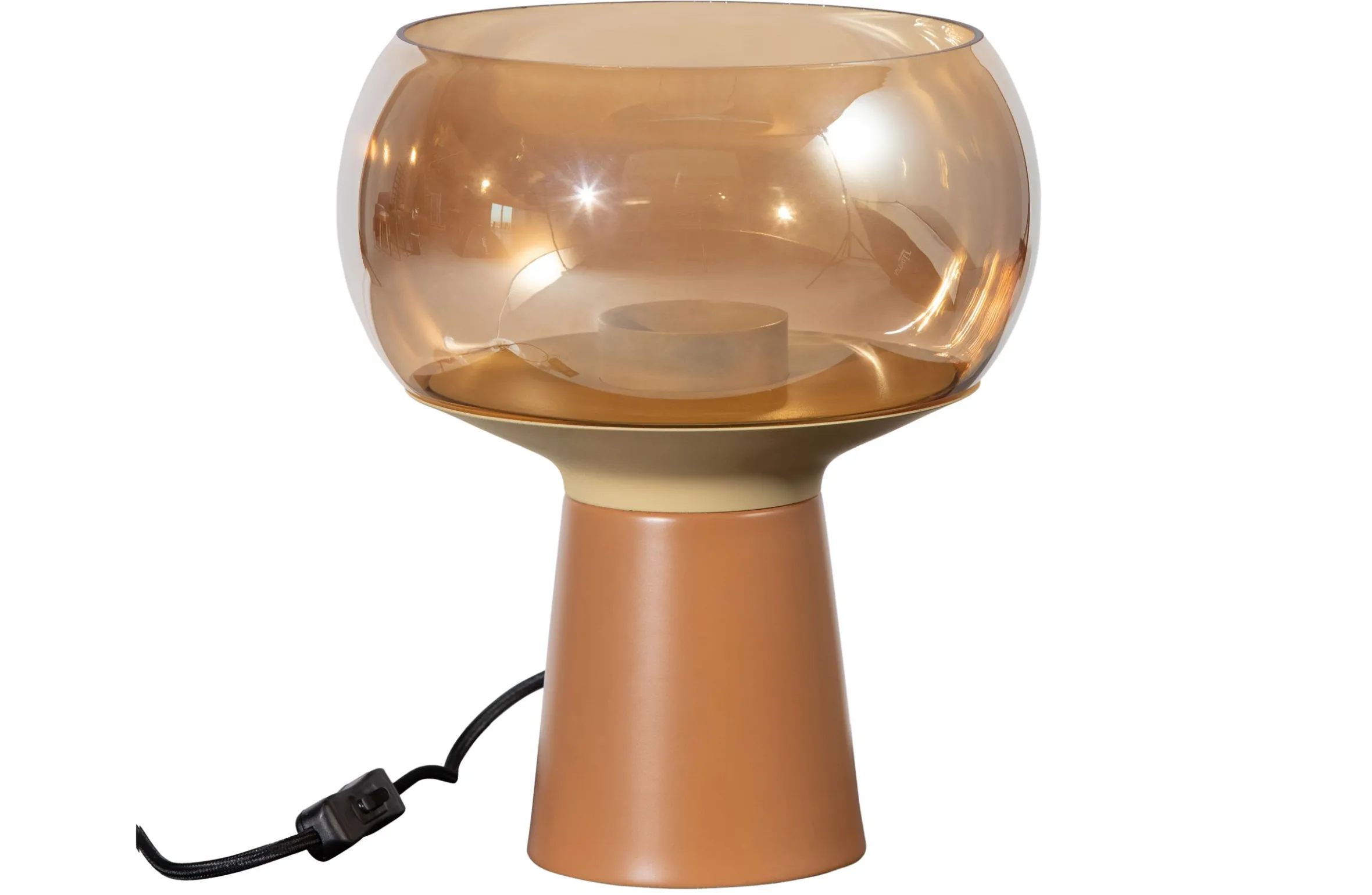 Diese pilzförmige Tischlampe führt uns in die 70er Jahre zurück. Retro, aber mit einem modernen Upgrade. Die Lampe stammt aus der Sammlung der niederländischen Marke BePureHome. Die obere Hälfte ist aus Glas mit einer Champagnertönung, der Keramikfuß ist in karamellfarben gehalten. Das getönte Glas verbreitet ein schönes weiches, warmes Licht. Das schwarze Textilkabel hat eine Länge von 1,8 Metern und ist mit einem Ein-/Ausschalter ausgestattet. Die Fassung ist für eine E27 Lichtquelle geeignet, max. 40 Watt.