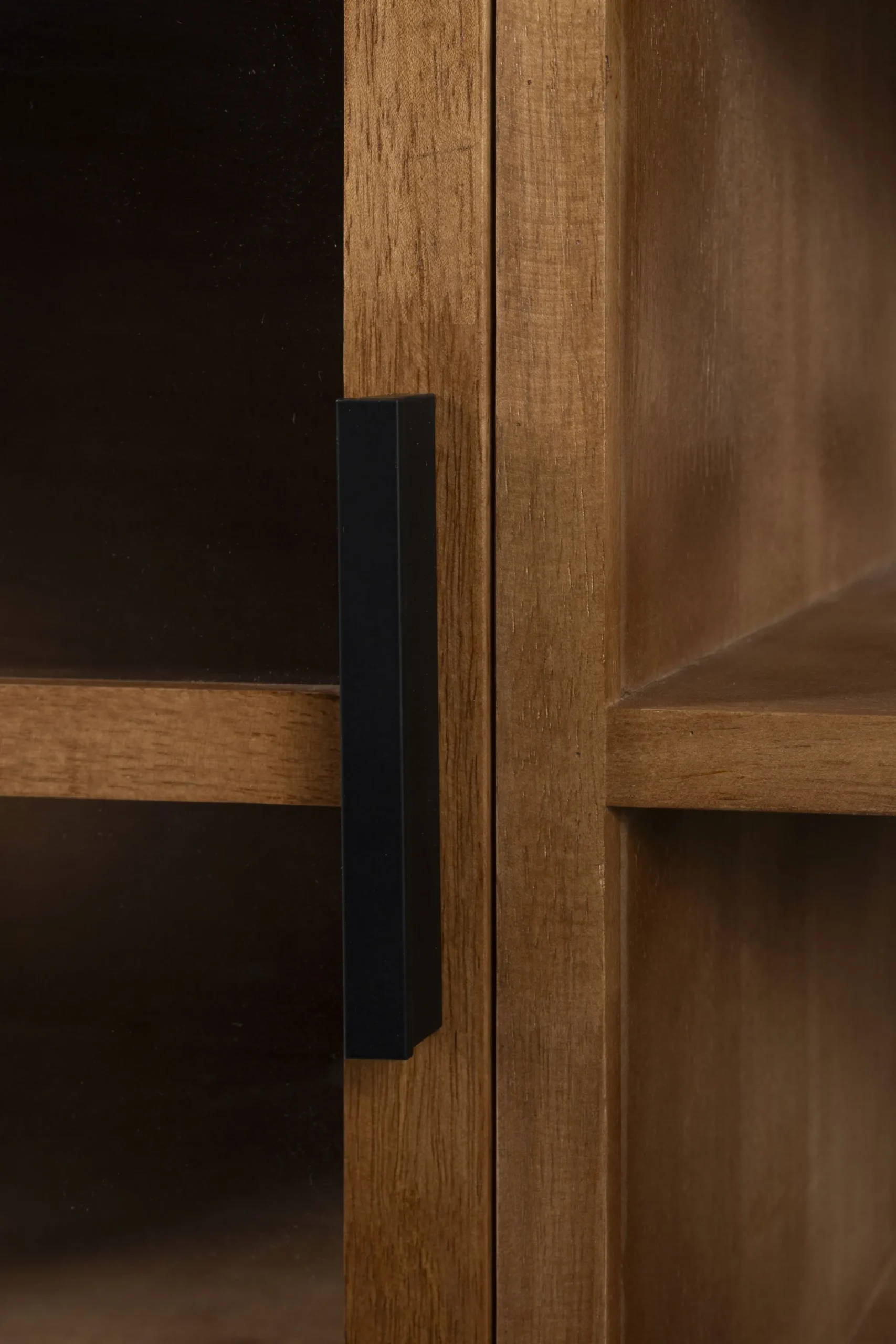 Die abgerundeten Kanten und die feine Maserung des Holzes verleihen dem Schrank eine warme und natürliche Ausstrahlung, die sich mühelos in jeden Wohnstil integriert. Die schlichten, schlanken Metallfüße sorgen für Stabilität und verleihen dem Möbelstück gleichzeitig eine moderne Note.