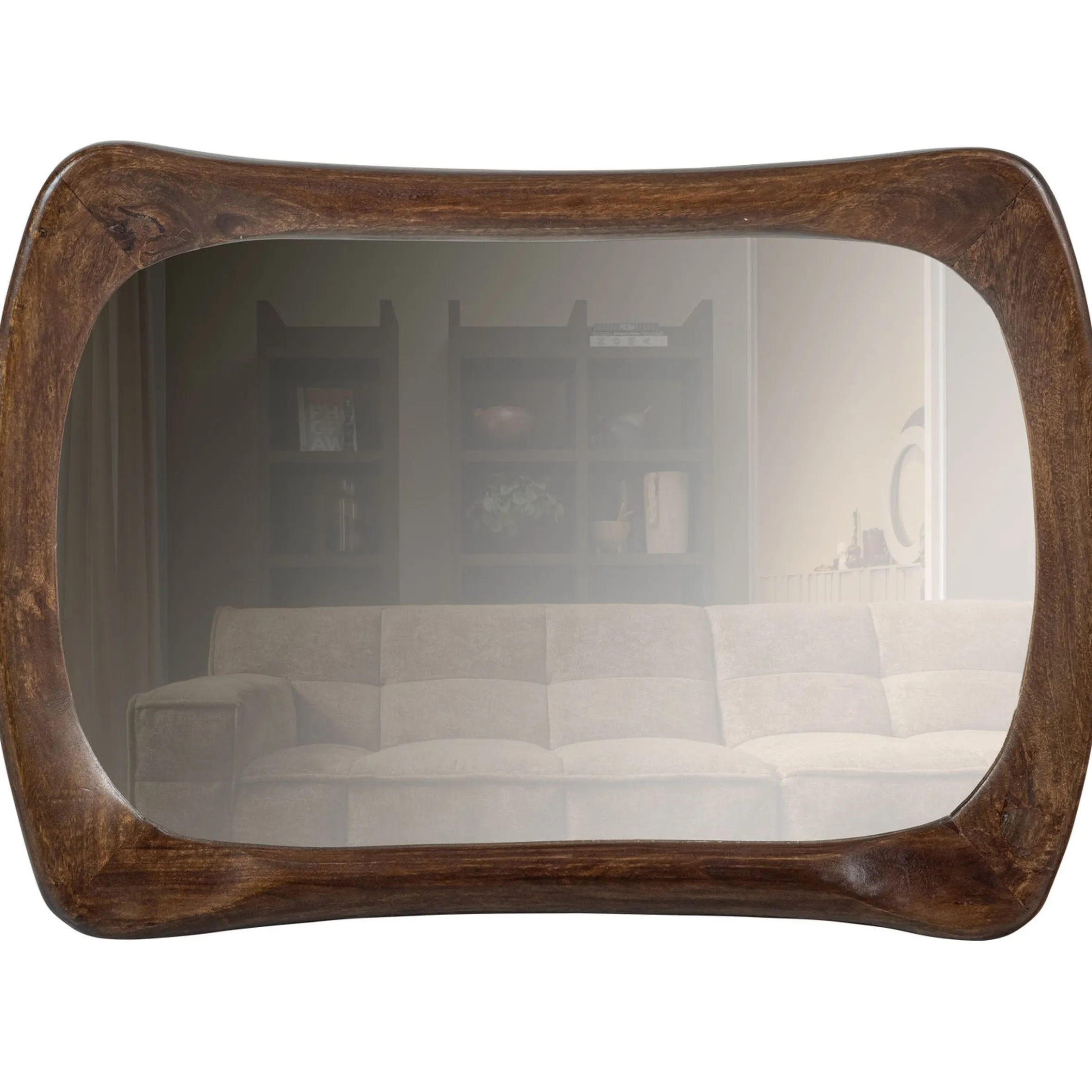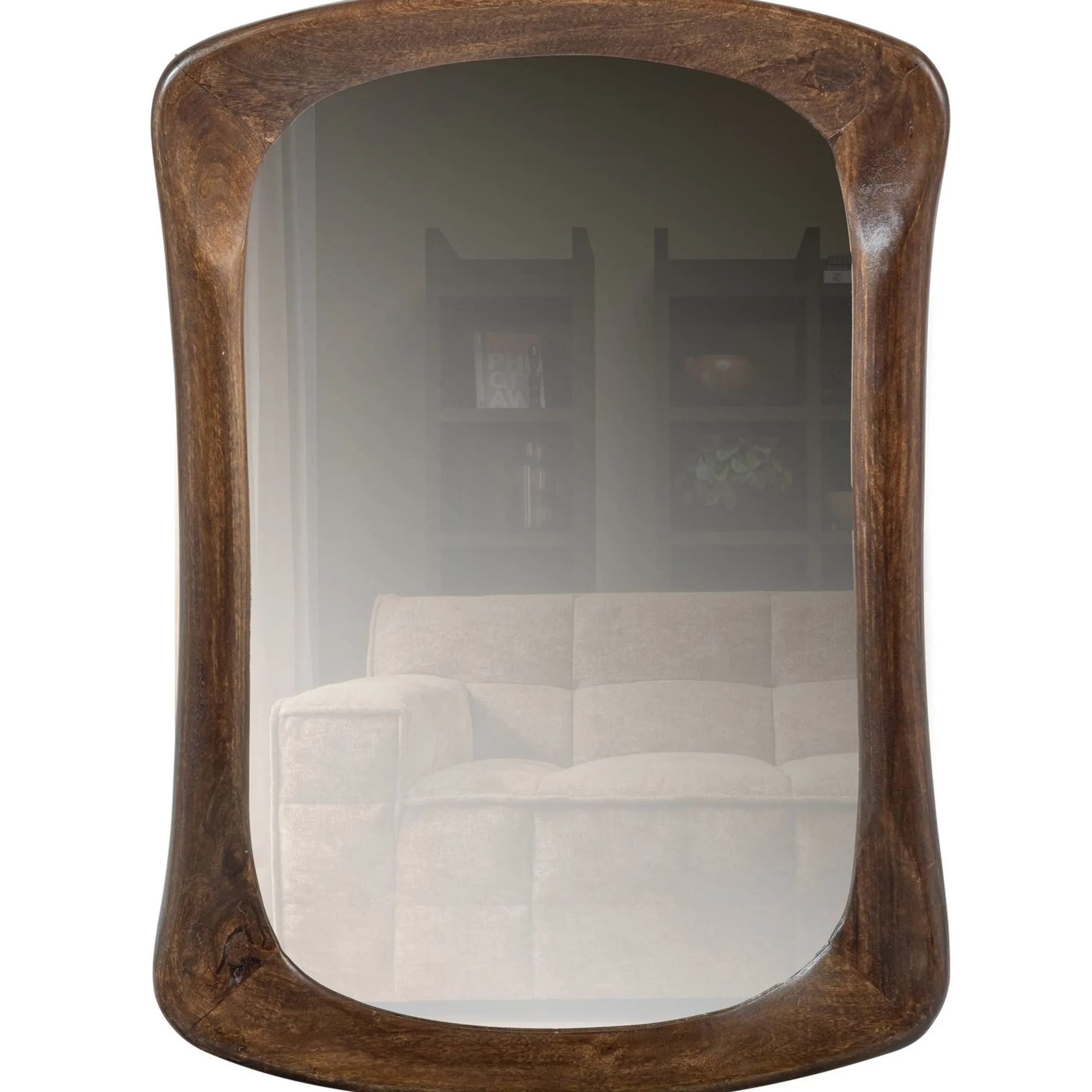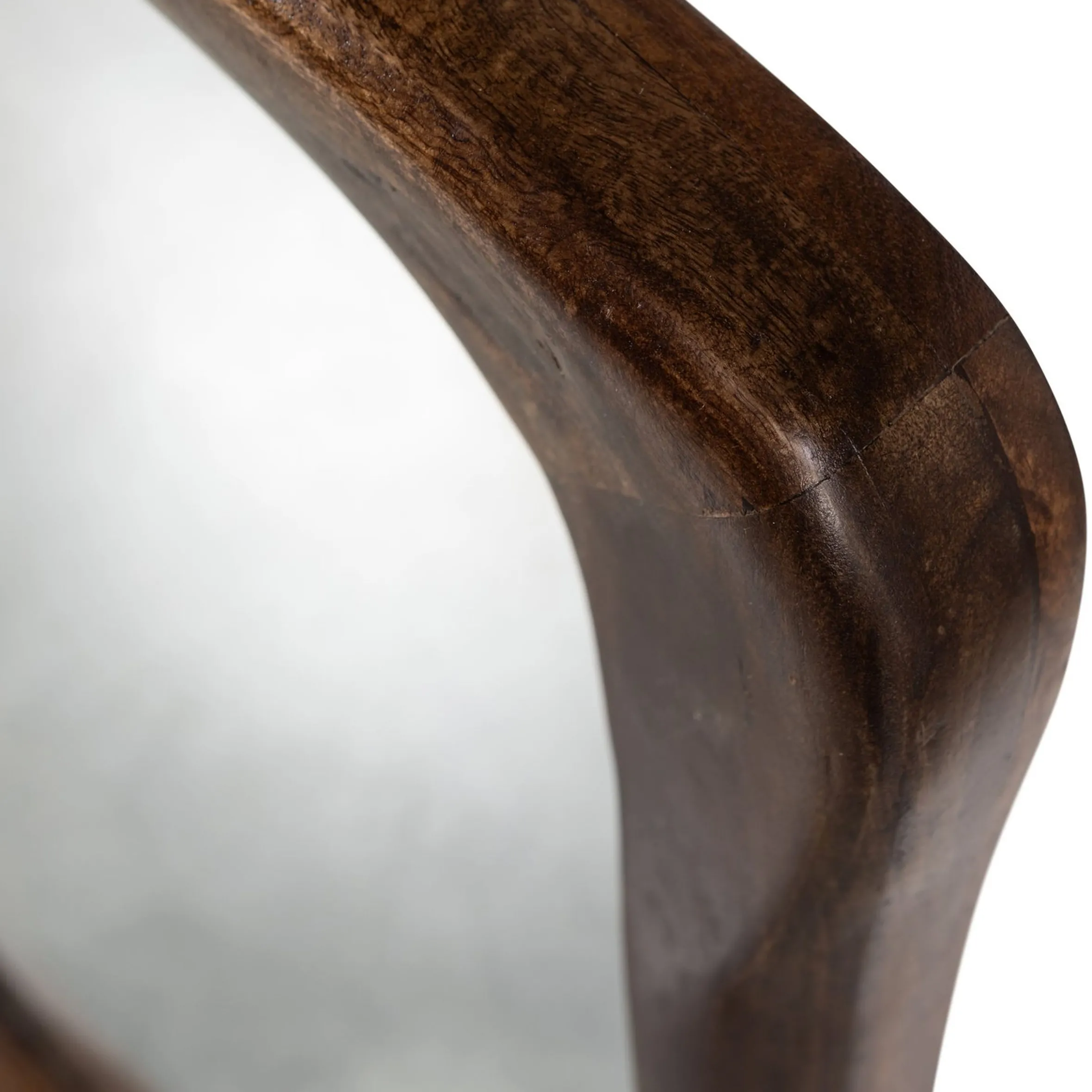 Der Spiegel Samuel ist in einen hochwertigen Mangoholzrahmen eingefasst, der durch seine warme, natürliche Maserung und robuste Struktur besticht. Die organische Form des Rahmens verleiht dem Spiegel eine sanfte, geschwungene Silhouette, die jedes Interieur aufwertet.