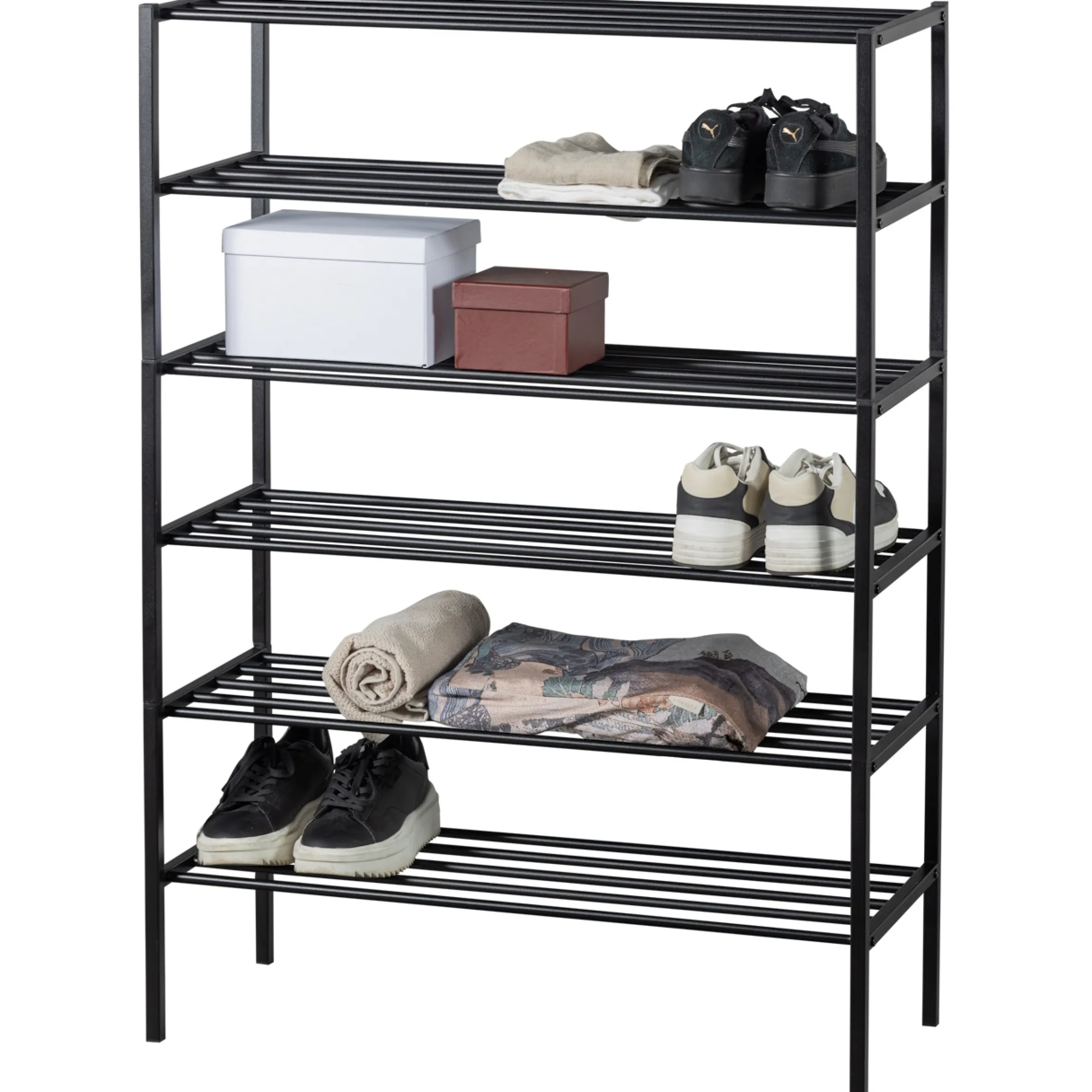Das Schuhregal Ferro ist ein eigener Entwurf aus der Kollektion der niederländischen Marke WOOOD. Ferro ist aus Metall gefertigt und hat eine pulverbeschichtete, schwarze Oberfläche. Das praktische an diesem Metallregal ist, dass es stapelbar und somit beliebig erweitert werden kann. Durch die verschiedenen Regalhöhen ist dann auch schnell mal eine komplette Garderobenwand mit Platz für Jacken gebaut. Die Höhe der Fächer beträgt 18 cm, die maximale Tragfähigkeit beläuft sich auf 15 kg.