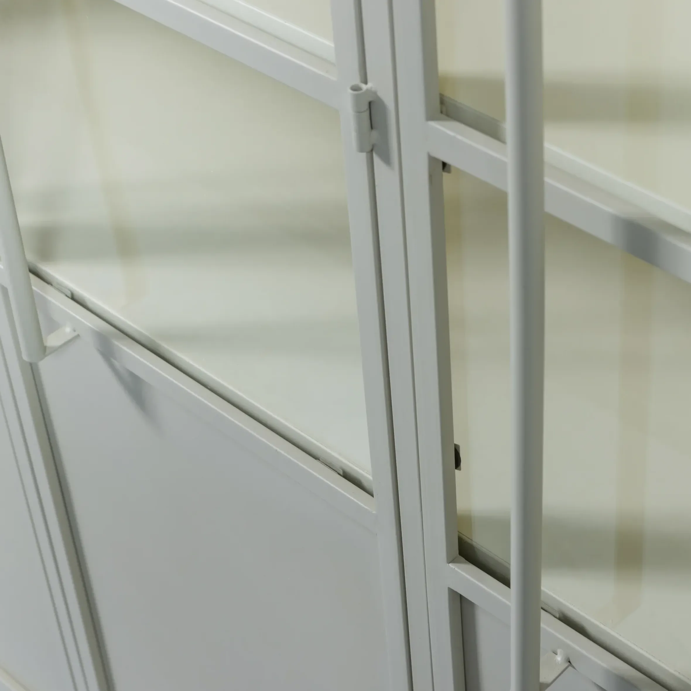 Diese robuste im industrial Style gefertigte Vitrine stammt aus der Kollektion der Firma BePureHome. Sie bietet mit sechs Fächern ausreichend Platz für Gläser, Geschirr oder ähnliches. Die Vitrine ist aus Metall mit einer trendigen, matten Beschichtung gefertigt, die Türen sind mit gehärtetem Glas und stabilen Metallgriffen ausgestattet. Die inneren Regale erstrecken sich über die gesamte Breite. Die Höhe der Fächer beträgt 29-34 cm, die Tragfähigkeit pro Regal 20 kg.